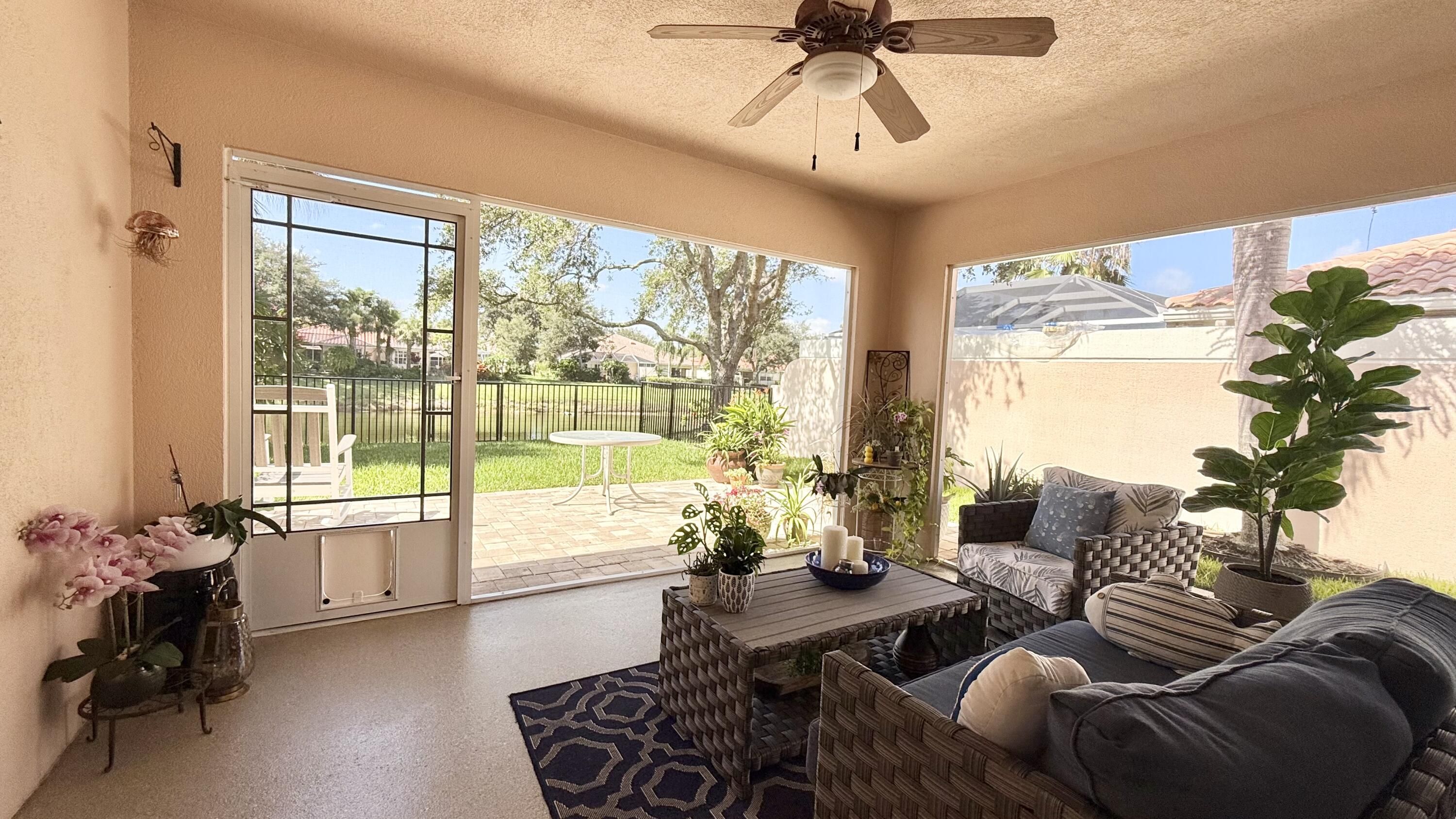Welcome to this beautifully maintained 2 bedroom, 2 bathroom Capri model villa offering a serene lake view and thoughtful upgrades throughout. The home boasts an open floor plan with vaulted ceilings in the great room, a built-in entertainment center, and 18'' ceramic tile flooring throughout.The renovated kitchen features stainless steel appliances, abundant storage, and modern finishes. Enjoy outdoor living with a screened lanai enhanced by panoramic screening, a paved deck, and a fenced garden with lush landscaping.The spacious principal suite includes a large walk-in closet and a bath with dual sinks and a walk-in shower. The guest suite, positioned for privacy on the opposite side of the home, also offers a private bath and walk-in closet.