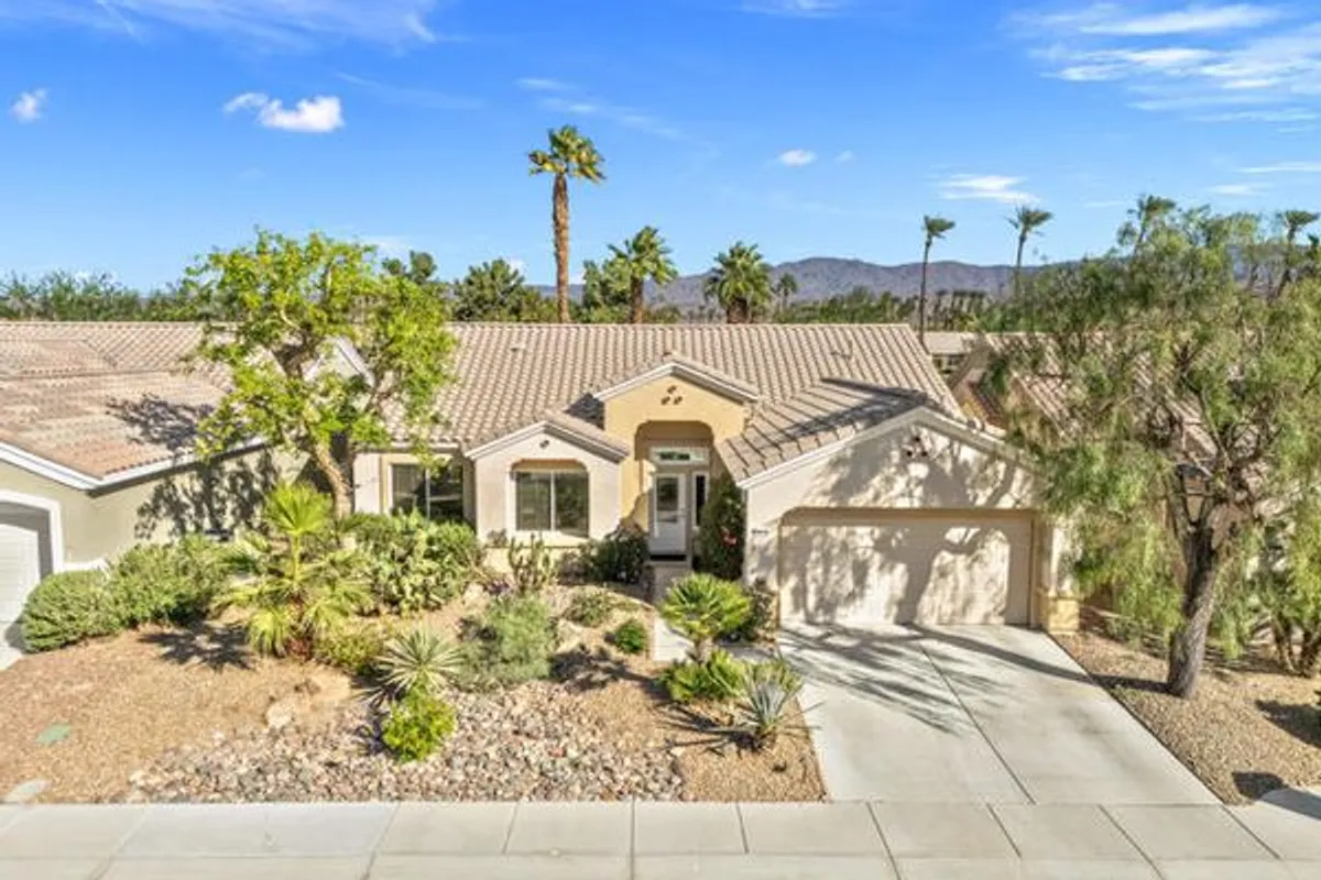 Unmatched golf-course living on the first tee! This highly sought-after Montego model sits in a premier north-facing location with sweeping panoramic views of the fairway and mountains--one of the most desirable spots in all of Sun City Palm Desert! A popular 55+ Del Webb community, Sun City offers the best bang for your buck in the Coachella Valley, and this home sits right between the Mountain View and Sunset View clubhouses. Inside, the kitchen wall was removed to create a true great room showcasing the views, with a brand-new oversized picture window and sliding door. The updated kitchen features quartz countertops, backsplash, stainless appliances, gas range, a two-year-old refrigerator, breakfast nook, and counter bar. Luxury vinyl flooring, new recessed lighting, new ceiling fans, and NEW 2025 HVAC ($12,000) elevate the home throughout. The primary suite is extended and includes French door access to the backyard, a double vanity, painted cabinets, stall shower, and large walk-in closet. The guest bedroom and bath are privately positioned on the opposite side of the home. The open den/office--part of the great room--also enjoys golf course views. A separate laundry room comes with washer and dryer, and the extended two-car garage includes storage cabinets. Outside is an entertainer's dream: an extended covered patio, built-in BBQ, firepit, putting green, lush desert landscaping with newer lighting, and multiple spaces to relax and enjoy the scenery. Buy where you love to play--Sun City Palm Desert!