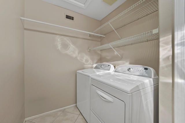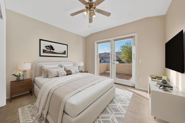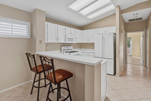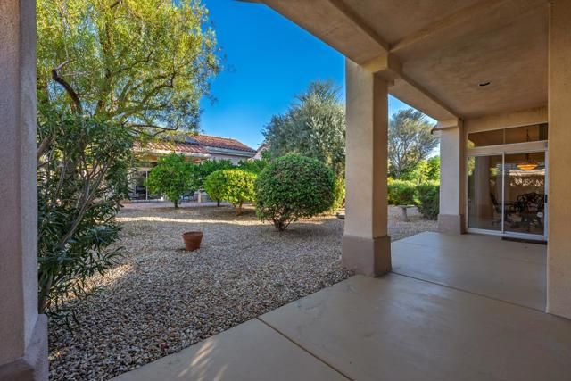 Sun City Palm Desert - Gorham. Ideally located just a short distance from both the Mountain View and Sunset View Clubhouses, this charming home offers comfort, style, and convenience. The north-facing rear yard features a spacious covered patio surrounded by lush desert landscaping--perfect for outdoor relaxation. Curb appeal abounds with a decorative concrete driveway, front courtyard, and coordinated hardscape. Inside, diagonally laid tile flooring extends throughout the main living areas, with shutters on most windows. The kitchen and dining area feature vaulted ceilings, adding to the home's open and airy feel. The kitchen includes Corian countertops, a breakfast bar, and a skylight for natural light. The dining area has a bay window and a slider leading to the rear patio. The primary suite includes two closets with mirrored wardrobe doors, a vaulted ceiling, and direct access to the covered patio. Its en suite bathroom offers dual sinks, a stall shower, and a Solatube for added light. The guest bedroom has its own slider to the front courtyard and is adjacent to a full bath with a tub/shower combination. Additional features include an interior laundry room and a two-car garage with its own air conditioning and abundant storage space. The home's main HVAC system was replaced in 2019.