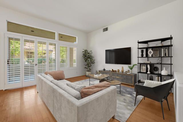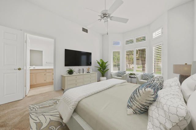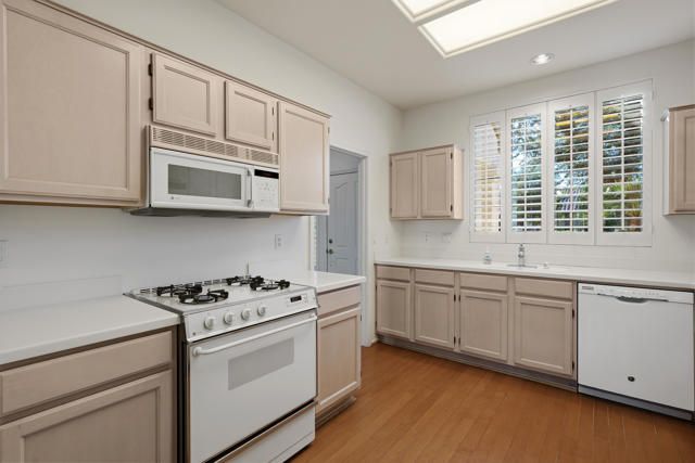 Sun City Palm Desert - Garnet. Ideally located in the heart of Sun City and just moments from both the Mountain View and Sunset View Clubhouses, this sought-after Garnet model offers low-maintenance living with HOA-maintained landscaping, roof, and stucco. The home features a spacious north-facing rear patio overlooking a lush greenbelt, plus a welcoming front courtyard that adds both charm and functionality. Inside, shutters are found throughout, and hardwood flooring extends through most of the home. The living room opens directly to the rear patio through a sliding glass door. The kitchen offers corian countertops and a convenient pantry. The primary suite includes a bay window and mirrored wardrobe closet, along with an ensuite bath featuring dual sinks and a glass-enclosed stall shower. A guest bedroom is served by a full bath with a tub/shower combination. The laundry room is located inside for added convenience. Additional highlights include a spacious two-car garage and a newer AC installed in 2019.