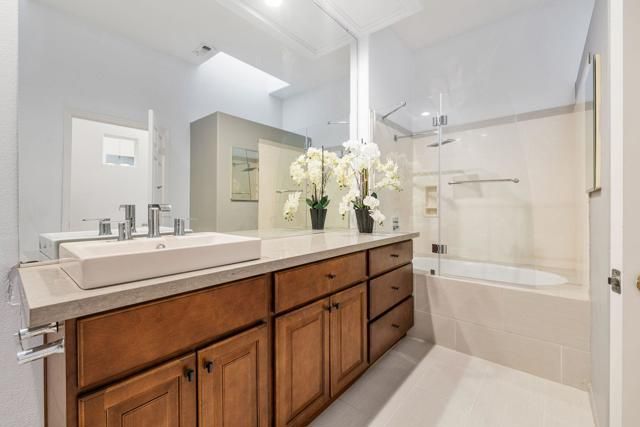Located in the best 55+ community in the valley, this rare Villa model is super desirable. It has high ceilings, transom windows, and Plantation shutters, which allow lots of light in. It has 1 bedroom with a bay window viewing the greenspace, and a slider out to the patio. The bathroom has been modified to be a fabulous upgraded full bathroom with quartz counters, a new sink and faucet, a nice soaking tub, 2 skylights, and recessed can lights. It has plenty of counter space and a great shower. The roomy kitchen is remodeled with stainless steel appliances, recessed lights, and new lower cabinets, and it's open to the dining and living rooms. All rooms have a nice view of the patio and green space. The front gated courtyard faces north for cool BBQs and outdoor enjoyment, while the back patio faces south for warmth and sunshine. This home provides the best of all seasons. The 1-car garage has been enclosed for security and cleanliness. 2 cars may be parked in the driveway 24/7, if necessary. There is a dry sauna that is currently not operable, and is sold as-is. It can be reconnected (buyer to investigate) or used for something else creative. It allows a small room for a cute little office space. This home is a duplex with an extra HOA fee of 189.00/mo. so you don't have to worry about doing yard work. It's perfect for a carefree, lock-and-go home, or a full-time residence. SUN CITY PALM DESERT IS ALL ABOUT LIFESTYLE!! It has many clubs, activities, amenities, and low HOA dues. Play at 2 championship 18-hole golf courses and practice facilities, pickle ball, tennis, softball, bocci ball, an 18-hole miniature golf course, an honor library, arts and crafts, a ballroom for special entertainment, and 4 saltwater pools kept at 87 degrees with hot tubs. Enjoy 2 great restaurants, a martini/coffee bar, and even a post office. There is a newly renovated classy indoor/outdoor bar with fire tables to enjoy the awesome views and our beautiful desert weather.