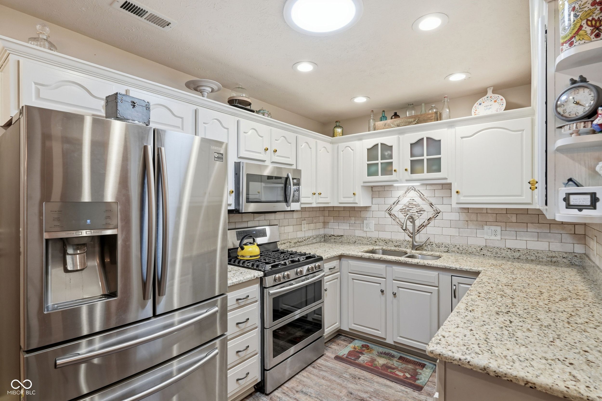 From the moment you arrive, this home offers what so many are looking for in a 55+ community... the freedom to enjoy life without giving up the space and features that make a home feel complete. Set on a spacious corner lot, this condo stands out with added privacy and outdoor living that is rarely found. Step inside and you are welcomed by updated Laminated Hardwood flooring throughout and a light filled living area with cathedral ceilings and skylights that create an open, easy feel. The kitchen is both stylish and functional with 2 pantries, granite countertops, tile backsplash, gas O/R, and updated Samsung appliances. It is ready for everyday living or hosting when you want to. The primary suite is designed with comfort in mind, featuring a vaulted ceiling, walk in closet, and a fully updated bath with a large tiled walk in shower, bench seat, and built in shelving. A second bedroom with a walk in closet offers flexibility for guests, hobbies, or a quiet workspace. The laundry room keeps life simple with cabinet storage above washer and dryer, built in ironing board, and drying rack. Outdoor space is where this home truly separates itself. Enjoy a huge covered patio pavilion 12FT X 18FT w/light and ceiling fan, additional 8x8 grilling area, temperature controlled garage with a large deep storage closet, widened driveway, professionally topped trees, and a mini barn with loft, workbench, and power, giving you storage and function beyond what is typically expected. Major updates including furnace, air conditioner, water heater, water softener, and windows have already been completed, allowing you to move in and simply enjoy. Located in a 55+ community, this home offers low maintenance living with the flexibility to travel, relax, or stay right where you are and enjoy every inch of it.