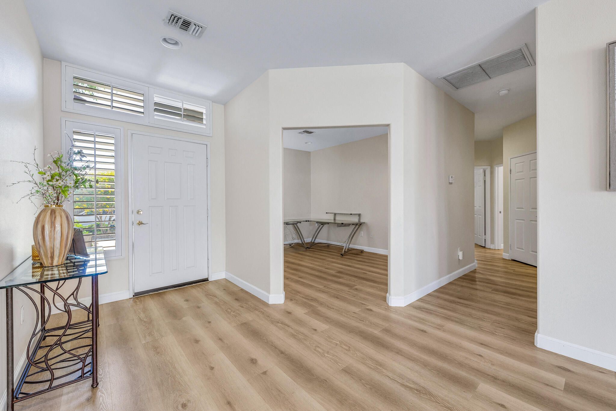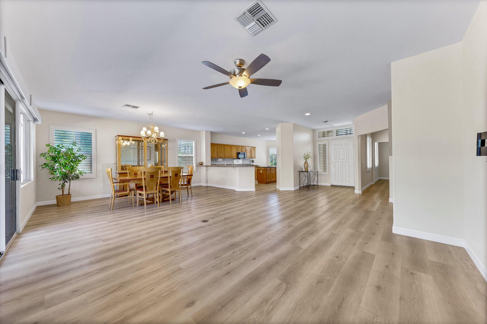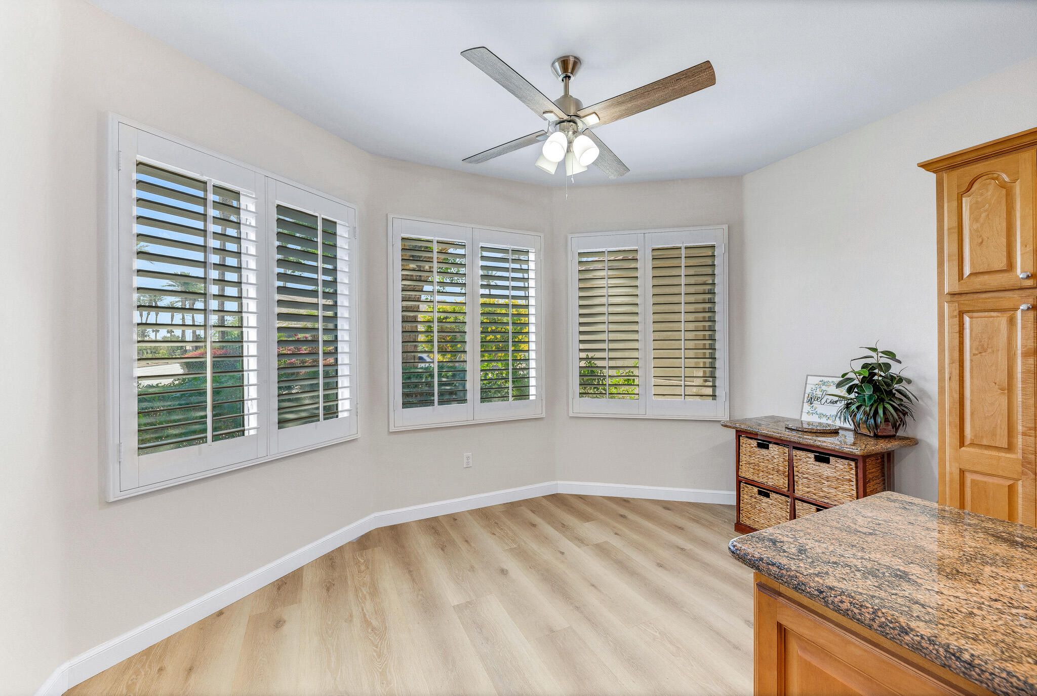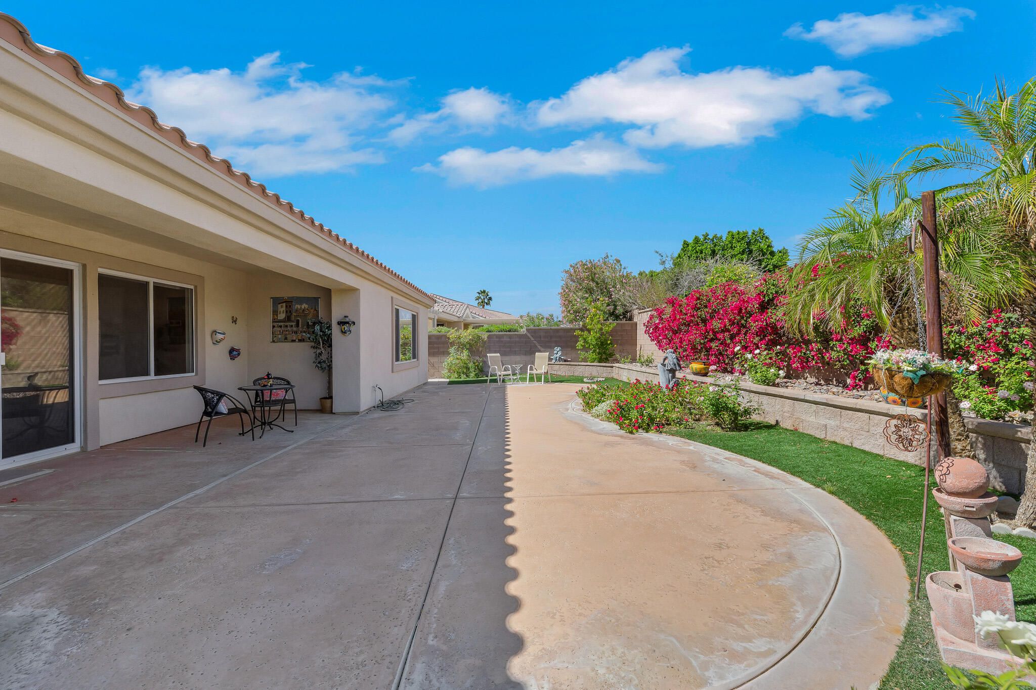 Popular St. Croix Model in Sun City Palm Desert. Located on a corner lot just steps from the Sunset View Clubhouse, this 2BD/2BA home with den/office and hobby room offers spacious, open-concept living. The bright great room features upgraded flooring, shutters, and remote-controlled electric shades. The kitchen boasts granite countertops, gas cooktop, wall oven, raised-panel maple cabinetry, and a breakfast nook with a front yard view. The spacious primary suite has ample space for a sitting area. Primary bath with double vanity and a custom walk-in closet. Enjoy the extended patio and beautifully landscaped backyard with raised planters, perfect for relaxing or entertaining. Additional highlights include a laundry room with a utility sink and cabinets, plus a golf cart garage. A fantastic opportunity to enjoy Sun City Palm Desert lifestyle!