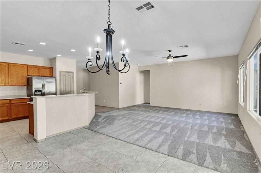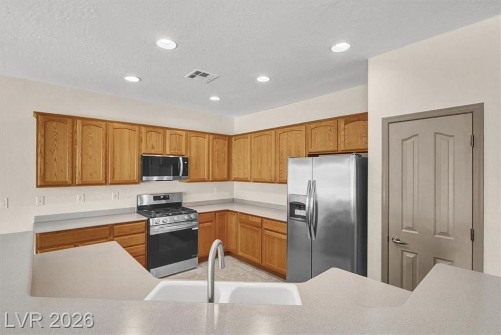 This amazing Sun City Aliante home looks & feels like NEW! This home featuring new carpet & pad, new stainless-steel appliances, modern ceiling fans, and a new garbage disposal and kitchen faucet. Enjoy the comfort of a newer Lennox A/C 17 SEER unit, a $17k investment in July 2024, ensuring cold air for many years to come. This spacious 2-bedroom plus den, 2-bathroom home includes a 2-car garage and boasts an open floor plan, upgraded gated courtyard, and covered back patio. Highlights include window coverings, a kitchen pantry, and a soft water loop. The primary bath features dual sinks, a walk-in shower, tile flooring, and an expansive walk-in closet. The laundry room comes equipped with a washer and dryer. Embrace the vibrant 55+ lifestyle in the sought-after Sun City Aliante Community, with amenities like a golf course, fitness center, library, pool/spa, and social clubs. Close to shopping, restaurants, and parks, endless opportunities and friendships await! Come see today.