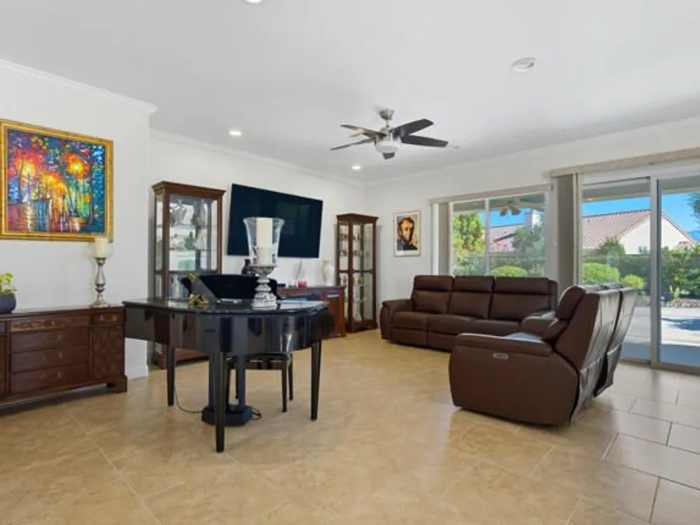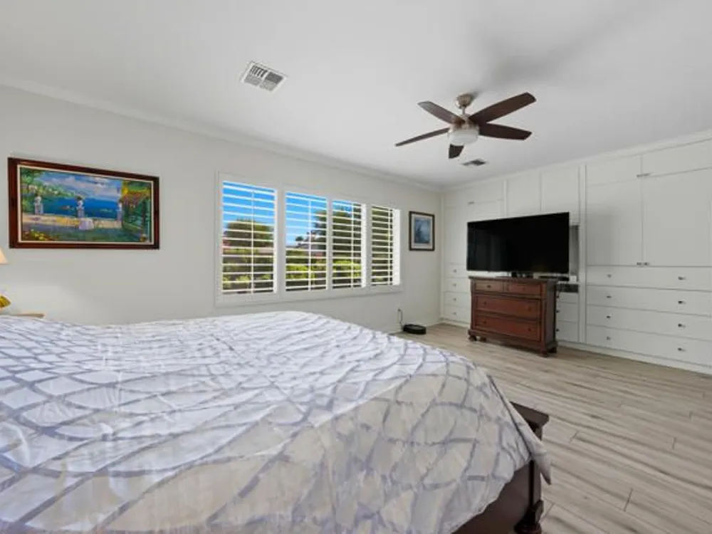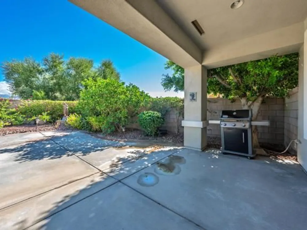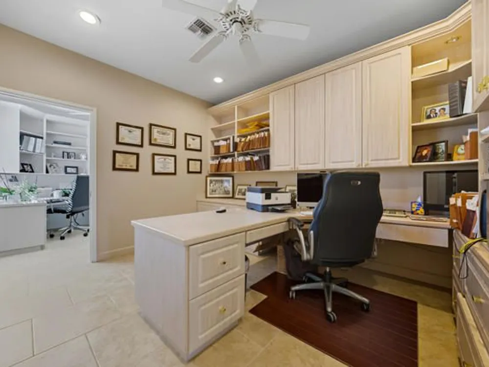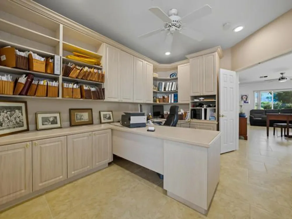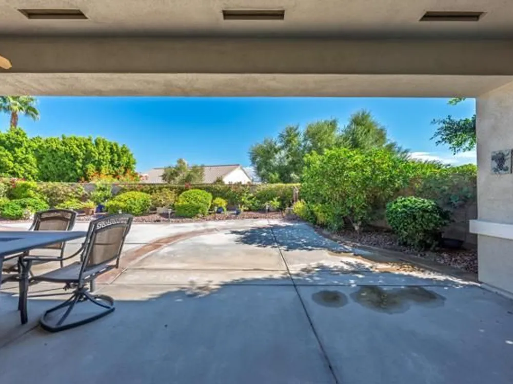 Sun City Palm Desert - St. Croix. This sought-after floorplan features 2 bedrooms, 2 bathrooms, a den, hobby/bonus room, and a 2-car plus golf cart garage. The north-facing rear yard offers privacy with no homes flush behind, lush desert landscaping including citrus, peekaboo mountain views, and an expanded patio for outdoor living. Curb appeal is enhanced by an updated paint scheme and leaded-glass entry door. Inside, 19-inch tile flooring runs throughout the main living areas, while the bedrooms feature vinyl plank. Upgraded baseboards and extensive crown molding add a refined touch. The greatroom boasts an upgraded slider and windows framing the rear yard. Double doors lead to a den with custom built-ins, while a pocket door opens to the hobby/bonus room, also equipped with built-in desk and shelving. The kitchen showcases abundant cabinetry with pullout shelves, a chef's island, breakfast bar, stainless appliances including double wall ovens, slab granite counters, tile backsplash, and upgraded fixtures. The primary suite offers a spacious retreat with custom built-in cabinetry, media center, shutters and a walk-in closet with built-in storage. Its spa-like bath includes a floating vanity with granite counter, upgraded dual sinks, lighting, and a custom tile shower with rimless glass enclosure. The guest bath is equally upgraded with a floating granite vanity, modern fixtures, and a tub/shower with glass enclosure. The laundry room provides ample cabinetry, granite counters, and a utility sink. Completing the home is a 2+ car garage with golf cart space and abundant storage.