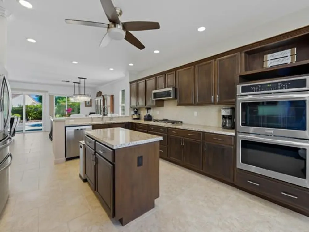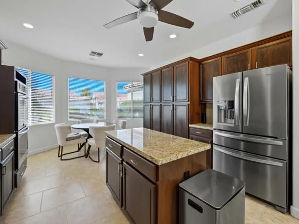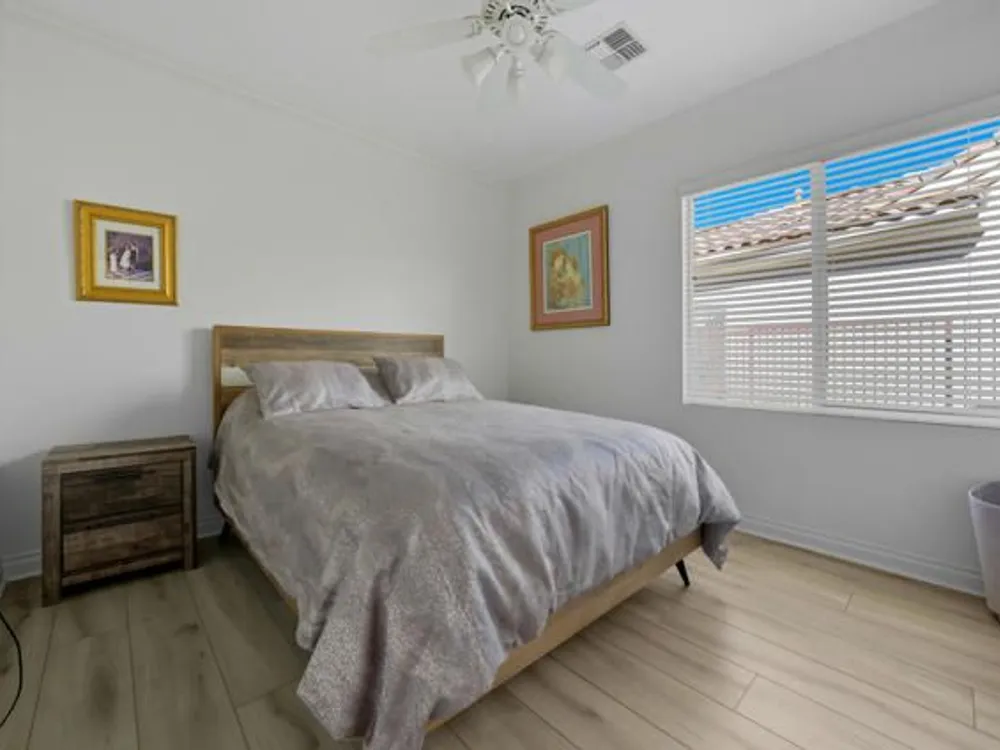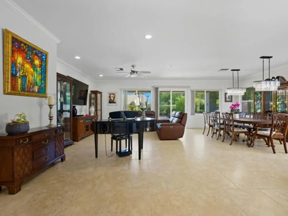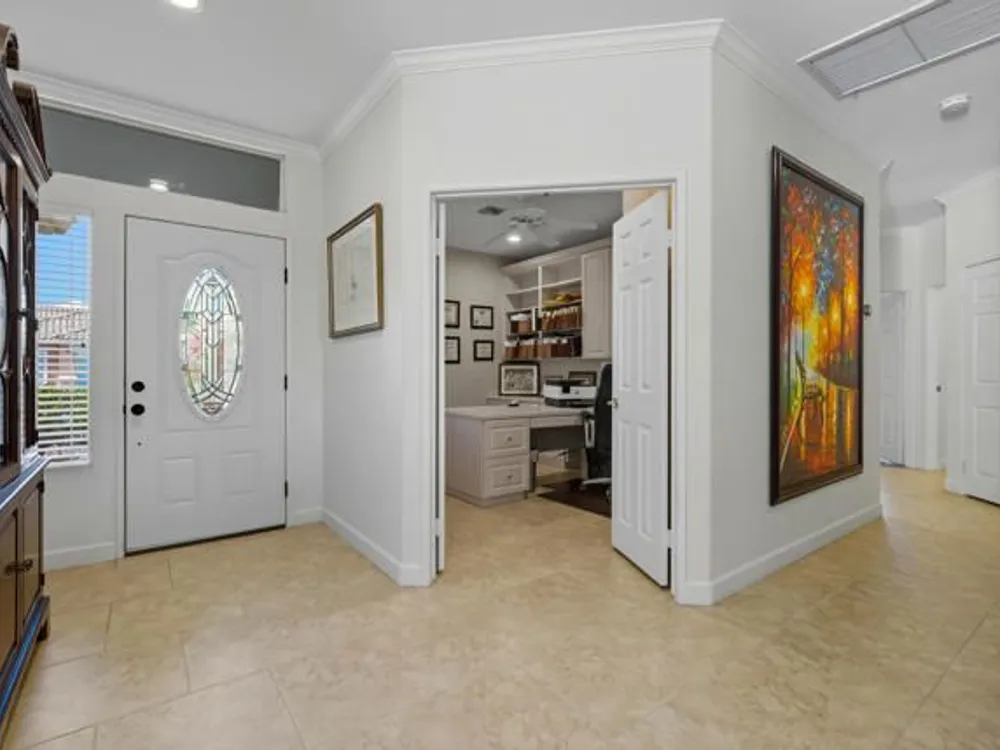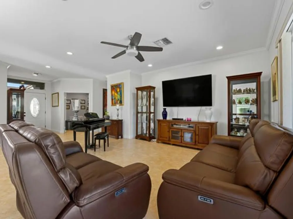 Sun City Palm Desert - St. Croix. This sought-after floorplan features 2 bedrooms, 2 bathrooms, a den, hobby/bonus room, and a 2-car plus golf cart garage. The north-facing rear yard offers privacy with no homes flush behind, lush desert landscaping including citrus, peekaboo mountain views, and an expanded patio for outdoor living. Curb appeal is enhanced by an updated paint scheme and leaded-glass entry door. Inside, 19-inch tile flooring runs throughout the main living areas, while the bedrooms feature vinyl plank. Upgraded baseboards and extensive crown molding add a refined touch. The greatroom boasts an upgraded slider and windows framing the rear yard. Double doors lead to a den with custom built-ins, while a pocket door opens to the hobby/bonus room, also equipped with built-in desk and shelving. The kitchen showcases abundant cabinetry with pullout shelves, a chef's island, breakfast bar, stainless appliances including double wall ovens, slab granite counters, tile backsplash, and upgraded fixtures. The primary suite offers a spacious retreat with custom built-in cabinetry, media center, shutters and a walk-in closet with built-in storage. Its spa-like bath includes a floating vanity with granite counter, upgraded dual sinks, lighting, and a custom tile shower with rimless glass enclosure. The guest bath is equally upgraded with a floating granite vanity, modern fixtures, and a tub/shower with glass enclosure. The laundry room provides ample cabinetry, granite counters, and a utility sink. Completing the home is a 2+ car garage with golf cart space and abundant storage.