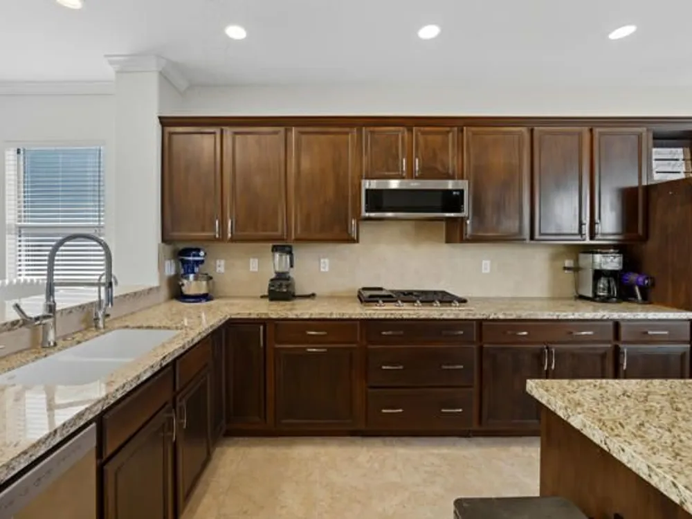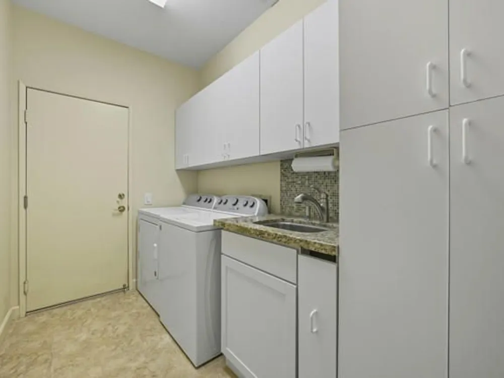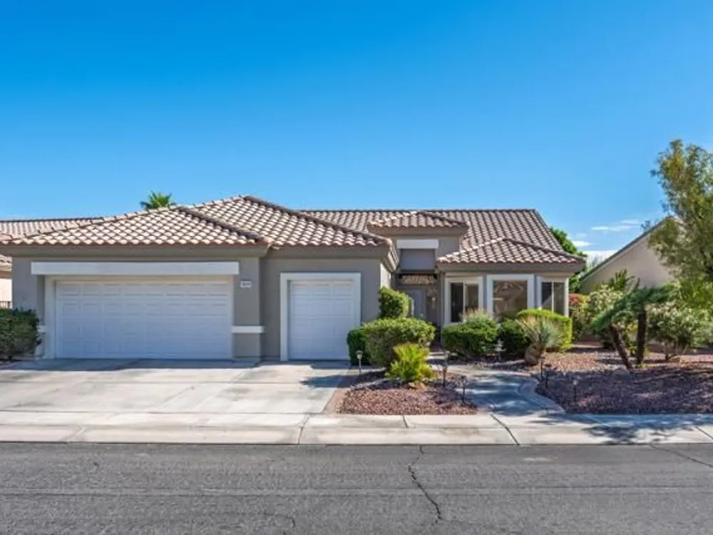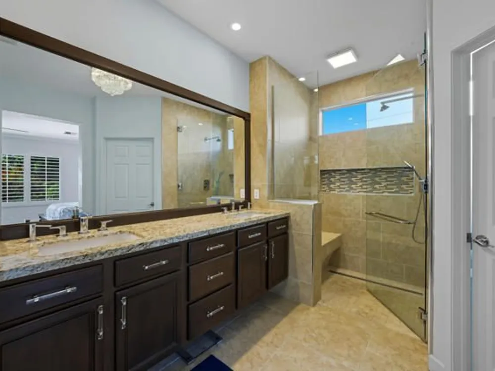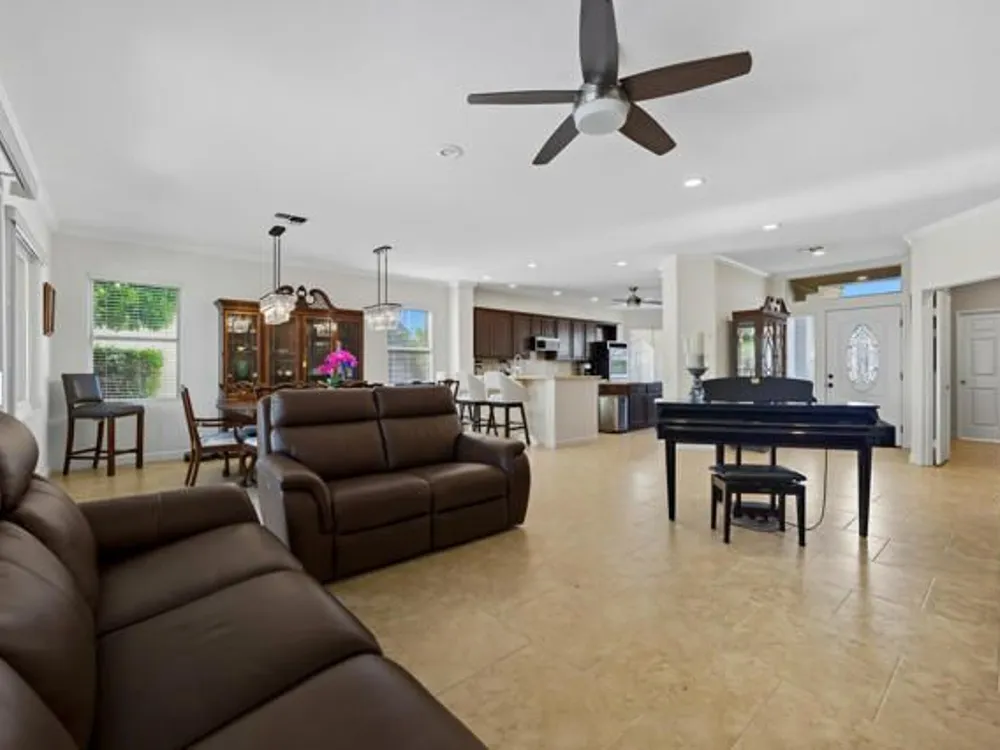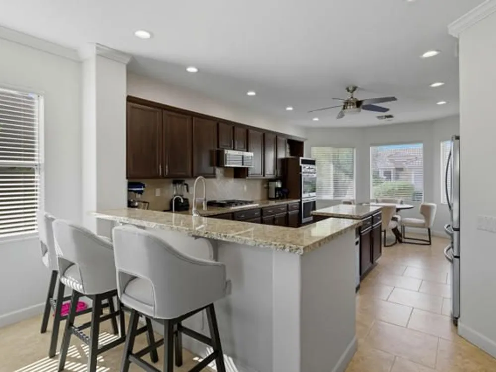 Sun City Palm Desert - St. Croix. This sought-after floorplan features 2 bedrooms, 2 bathrooms, a den, hobby/bonus room, and a 2-car plus golf cart garage. The north-facing rear yard offers privacy with no homes flush behind, lush desert landscaping including citrus, peekaboo mountain views, and an expanded patio for outdoor living. Curb appeal is enhanced by an updated paint scheme and leaded-glass entry door. Inside, 19-inch tile flooring runs throughout the main living areas, while the bedrooms feature vinyl plank. Upgraded baseboards and extensive crown molding add a refined touch. The greatroom boasts an upgraded slider and windows framing the rear yard. Double doors lead to a den with custom built-ins, while a pocket door opens to the hobby/bonus room, also equipped with built-in desk and shelving. The kitchen showcases abundant cabinetry with pullout shelves, a chef's island, breakfast bar, stainless appliances including double wall ovens, slab granite counters, tile backsplash, and upgraded fixtures. The primary suite offers a spacious retreat with custom built-in cabinetry, media center, shutters and a walk-in closet with built-in storage. Its spa-like bath includes a floating vanity with granite counter, upgraded dual sinks, lighting, and a custom tile shower with rimless glass enclosure. The guest bath is equally upgraded with a floating granite vanity, modern fixtures, and a tub/shower with glass enclosure. The laundry room provides ample cabinetry, granite counters, and a utility sink. Completing the home is a 2+ car garage with golf cart space and abundant storage.