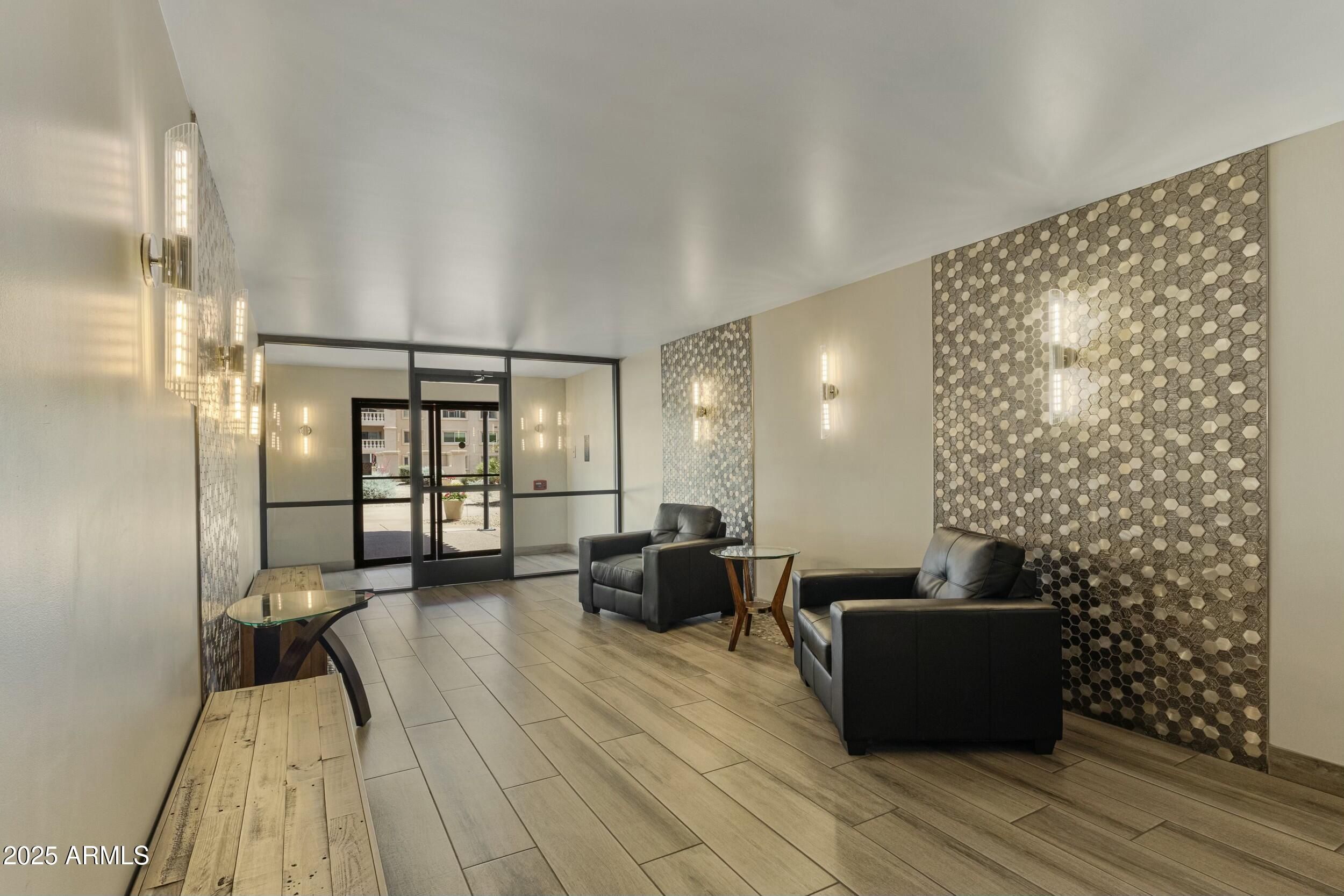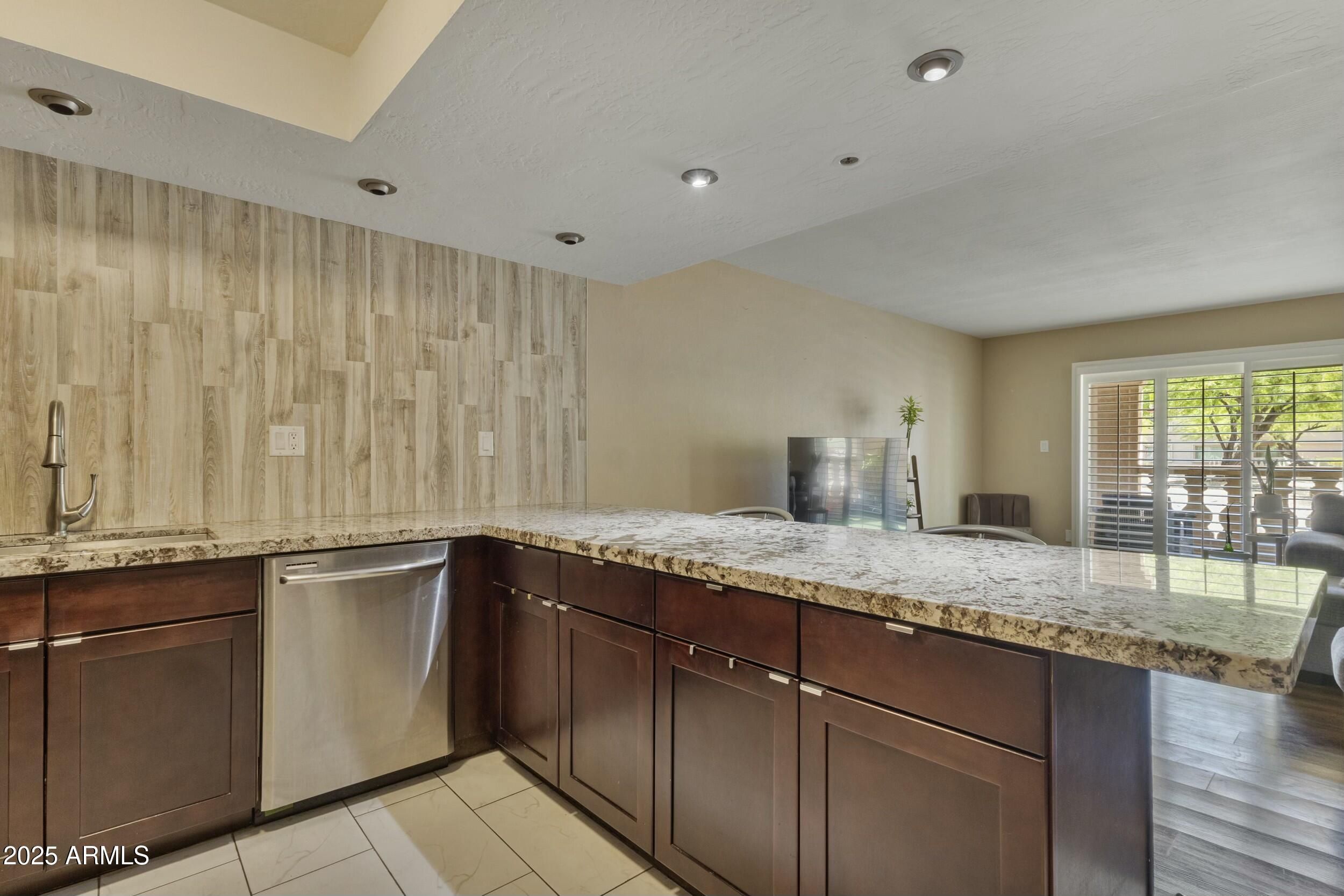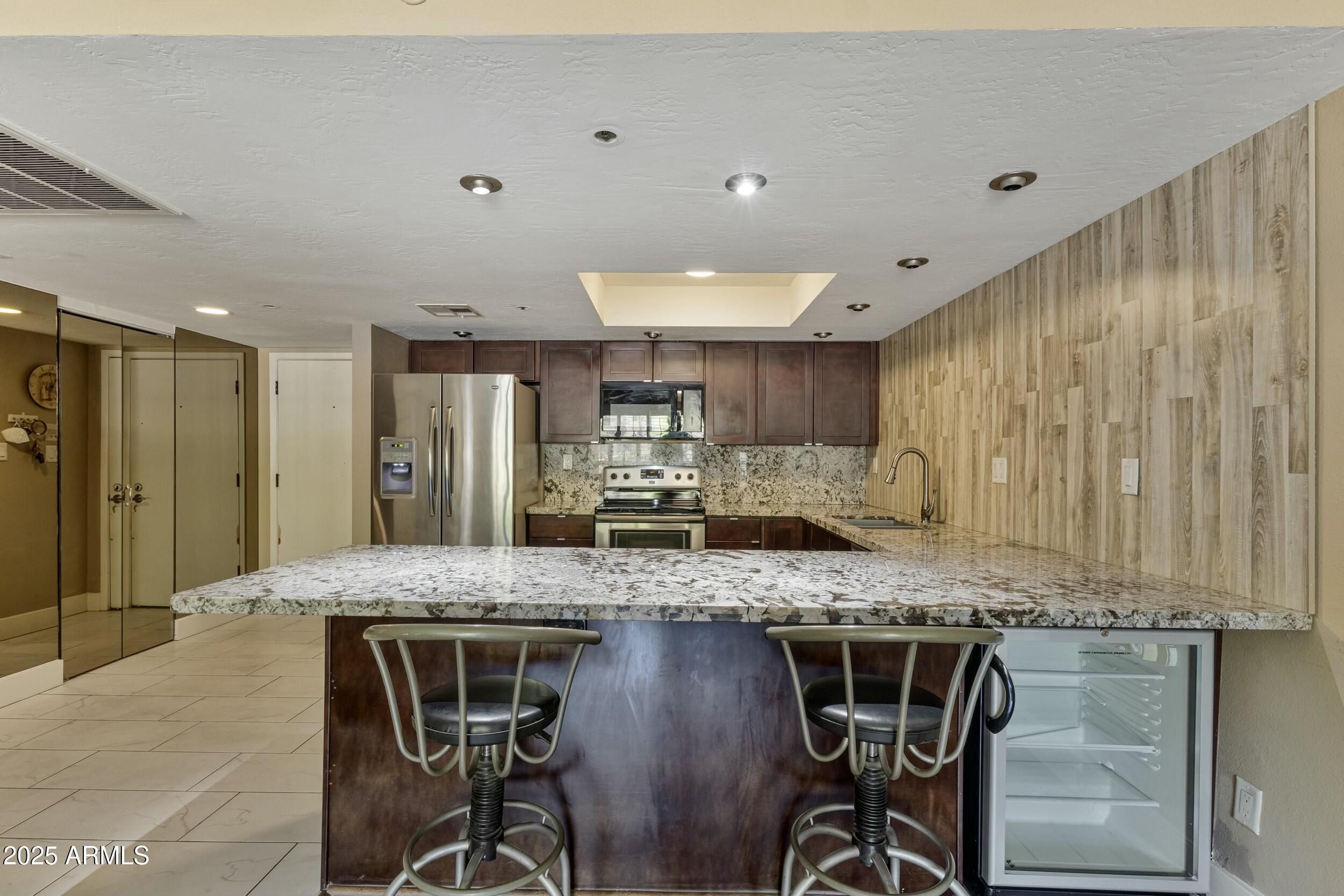 Stunning remodeled condo in Scottsdale Shadows. Prime ground floor, end unit location in a rare building with in unit laundry and small pets allowed. Features a gourmet kitchen with cherry cabinets, granite counters, stainless appliances (New Fridge, dryer and microwave 2025) & wine fridge. Modern flooring, plantation shutters and two luxurious bathrooms with granite, rain glass shower in master and glass vessel sink in second. Included underground parking & large patio. Enjoy 3 heated pools, spas, fitness center, game room, library, tennis, event transport, 24/7 security. HOA covers water, garbage, AC, roof, pest control, amenities. Prime Scottsdale location near green belt, golf, shopping, dining, entertainment, spring training, downtown. A rare gem in a vibrant community, don't miss it