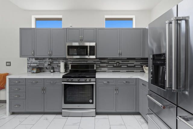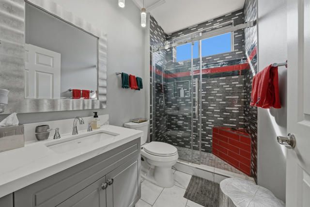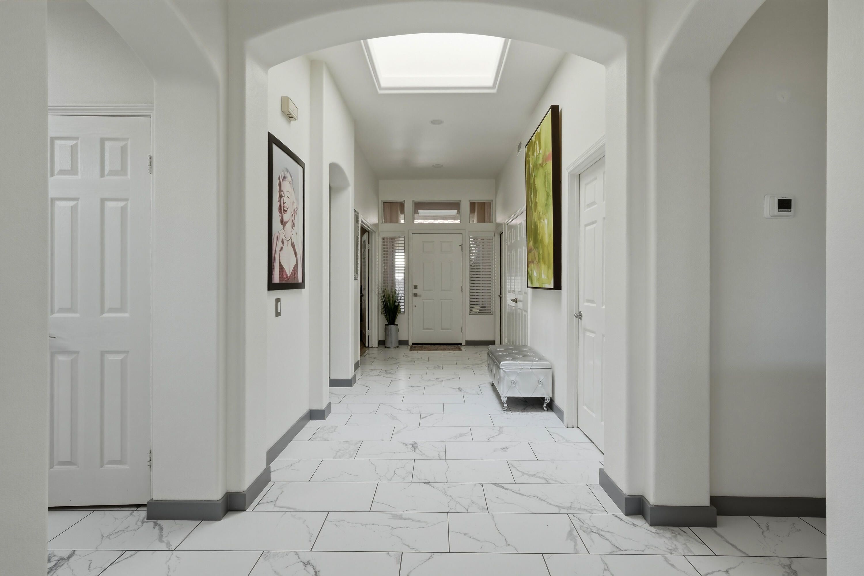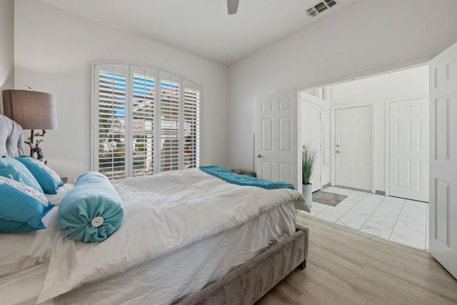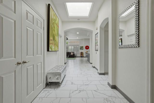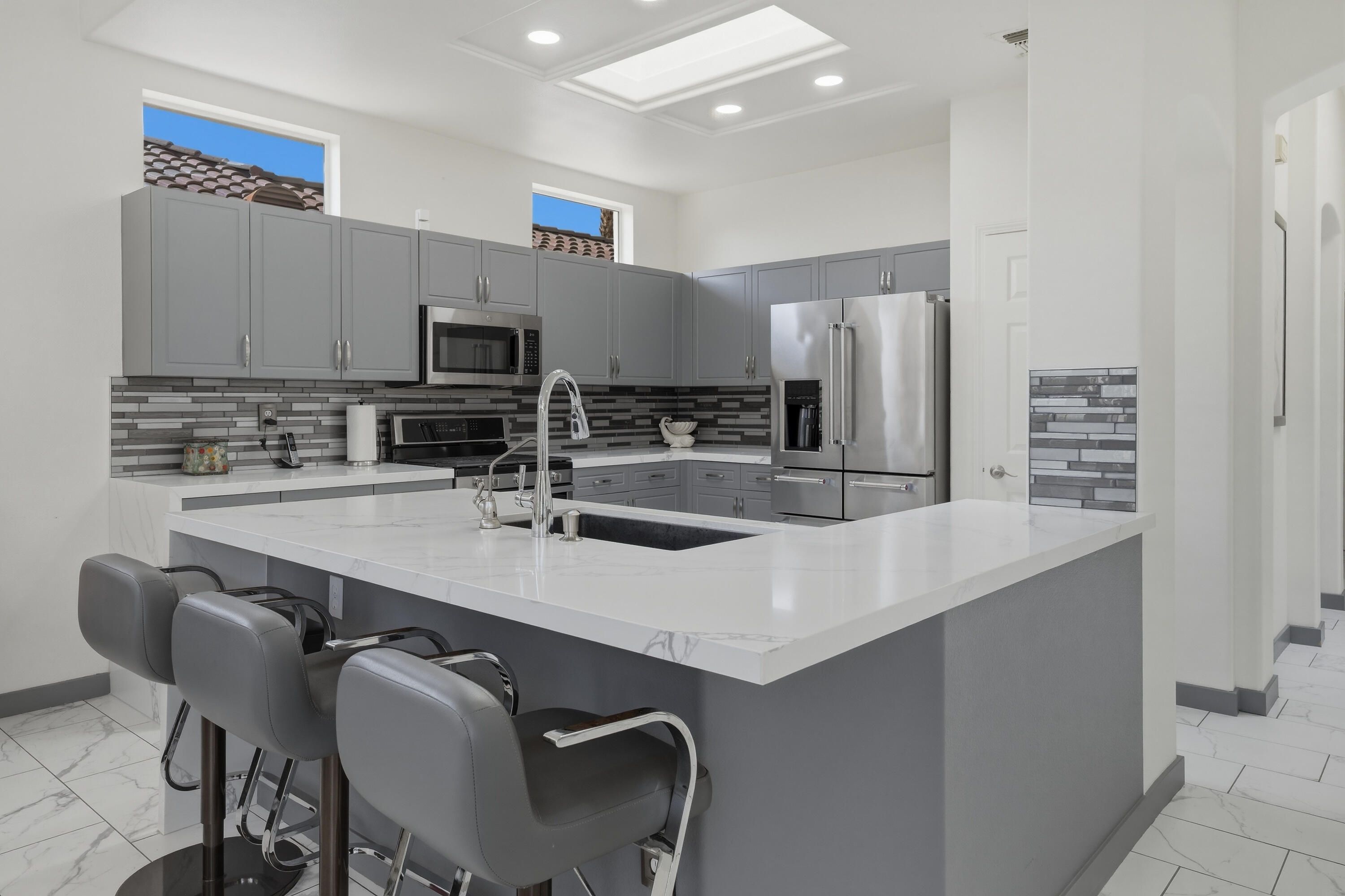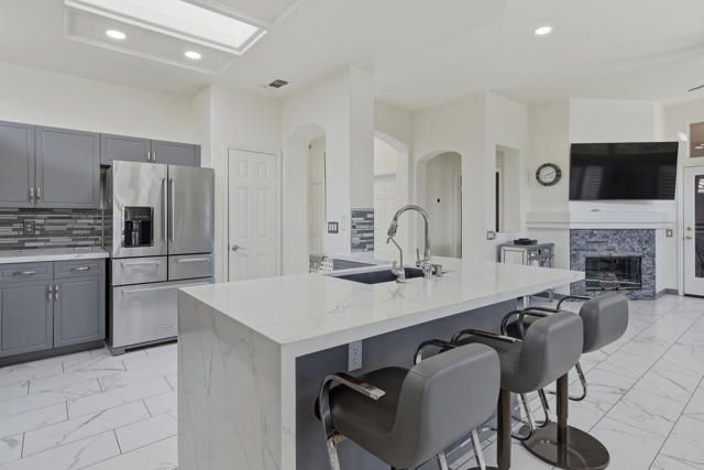 Sun City Palm Desert - Towle. Located in the heart of Sun City Palm Desert, this beautifully updated greatroom Towle model blends modern finishes with the light, open feel buyers love. Just a short distance to both the Sunset View and Mountain View clubhouses, the home offers convenience along with exceptional style. A south-facing rear yard provides the perfect outdoor retreat, featuring an extended tile patio framed by lush desert landscaping -- ideal for morning coffee or evening entertaining. Inside, 10-foot ceilings, skylights, and transom windows create a bright and airy environment. Large 12x24-inch offset tile runs throughout the home, with vinyl plank flooring in the bedrooms. Shutters and LED lighting are found throughout, adding both elegance and efficiency. The spacious great room centers around a tile-trimmed gas fireplace, creating a warm focal point. The remodeled kitchen is designed to impress, showcasing a chef's island with breakfast bar, quartz countertops, glass tile backsplash, upgraded single-basin sink with premium fixtures, and stainless appliances. The primary suite offers direct access to the rear patio and features a generous walk-in closet with mirrored wardrobe doors. The spa-like primary bath has been thoughtfully redesigned with a custom tile stall shower and rimless glass enclosure, dual upgraded sinks, quartz counters, enhanced mirrors, lighting, and fixtures, plus a dedicated sitting vanity. Double doors lead to the guest bedroom, while the guest bath mirrors the home's elevated finishes with a custom tile shower, rimless glass doors, quartz vanity, and upgraded lighting and mirror. Additional features include a new A/C (2022) and a two-car garage with tile flooring, insulated door, and extensive built-in cabinetry for abundant storage. This is a move-in ready opportunity offering modern upgrades, ideal orientation, and prime location within Sun City Palm Desert.