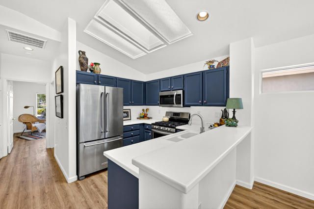 Motivated Seller!!! Discover a standout home in the heart of Sun City Palm Desert, where comfort meets sophistication in this beautifully updated Gorham floor plan with owned SOLAR. With 1,157 square feet (EST.) of thoughtfully designed living space, this residence shines with quality upgrades, timeless finishes, and an exceptional southern exposure that fills the home with natural light. From the moment you step inside, you'll feel the pride of ownership. The living area is warm and inviting, enhanced by luxury vinyl plank flooring throughout, newer interior paint, and elegant crown molding that adds a refined, custom touch. The kitchen is equally impressive, featuring stainless steel appliances, crisp white counters, rich cabinetry and a kitchen skylight--creating a space that's both functional and beautifully styled. The primary suite offers a serene retreat with generous proportions and an en suite bath, while the guest bedroom and full bath provide comfort and privacy for your visitors. Every space feels fresh, bright, and cared for. Step outside to your private covered patio surrounded by lush landscaping--an ideal spot to unwind, entertain, or simply enjoy the quiet beauty of the desert. Even the garage has been elevated, boasting upgraded epoxy flooring that adds durability and a clean, polished finish rarely seen at this price point. Beyond the home itself, Sun City Palm Desert offers an unmatched lifestyle with two championship golf courses, three clubhouses, sparkling pools and spas, fitness centers, pickleball and tennis courts, restaurants, and a vibrant calendar of social clubs and activities. Beautifully appointed, impeccably maintained, and move-in ready--this home stands out as one of the best values and finest offerings in Sun City Palm Desert. Don't miss your chance to make it yours!