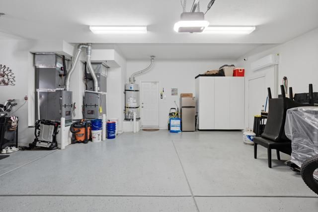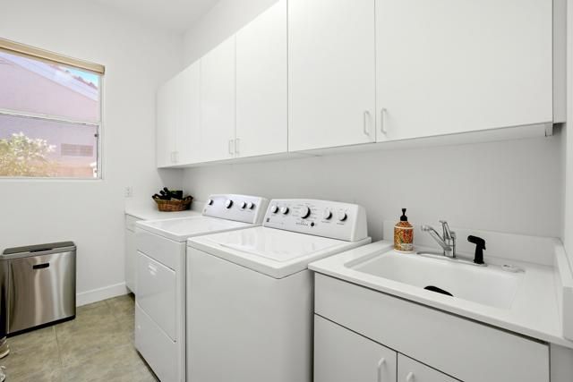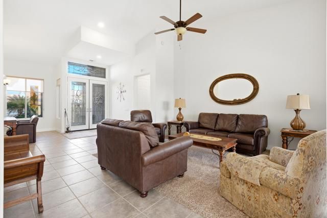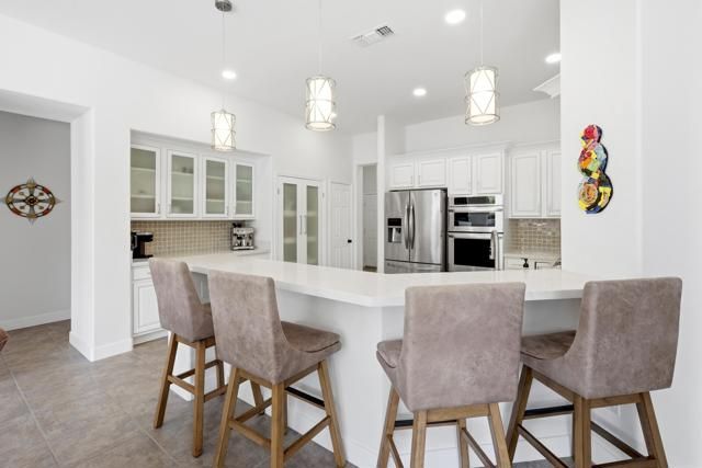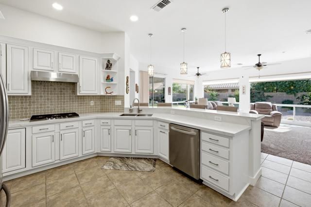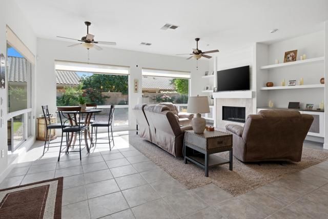 Sun City Palm Desert - San Remo. This beautifully upgraded home offers exceptional curb appeal with a refreshed paint scheme, meticulously maintained desert landscaping, and a gated front courtyard that creates both privacy and charm. Leaded glass French doors with a transom window provide a grand first impression. Inside, the greatroom stuns with a soaring vaulted ceiling approaching 14 feet and expansive tile flooring throughout much of the home. Large picture windows in both the living and family rooms flood the space with natural light while framing views of the lush south-facing rear yard. Solar shades throughout add comfort and efficiency. The family room features a custom floating built-in with shelving and a tile-trimmed gas fireplace, creating a stylish yet inviting focal point. The updated kitchen is thoughtfully designed with quartz countertops, a mosaic tile backsplash, stainless appliances including double wall ovens, a breakfast bar, raised panel cabinetry with pull-out shelves, and a large pantry with pull-out storage behind frosted French doors--ideal for both everyday living and entertaining. The primary suite enjoys a bay window overlooking the patio and a huge walk-in closet with custom built-in organization. Its spa-inspired bathroom showcases an underlit floating vanity with dual sinks, quartz counters, upgraded fixtures, designer lighting and mirrors, plus a spectacular walk-in shower with dual showerheads, custom tile surround, and rimless glass enclosure. On the opposite side of the home, the private guest wing includes two bedrooms and a beautifully updated bathroom featuring a quartz vanity and a tiled stall shower with textured glass doors. A stylish powder room with floating vanity and upgraded finishes serves guests with ease. The laundry room offers built-in storage and a utility sink. The extended 2-car plus golf cart garage is equally impressive with epoxy flooring, built-in storage, overhead racks, its own A/C (new in 2024), and abundant workspace. Major system upgrades provide peace of mind, including two new Bosch air-conditioning units, Rheem furnaces, and a water heater--all installed in 2024. The spacious south-facing rear yard is designed for relaxation and entertaining with an extended patio, alumawood cover, artificial turf, lush landscaping, and a built-in barbecue--your own private desert retreat.