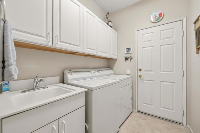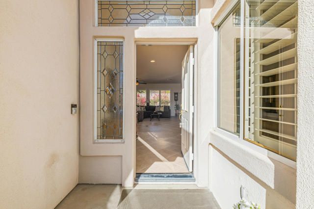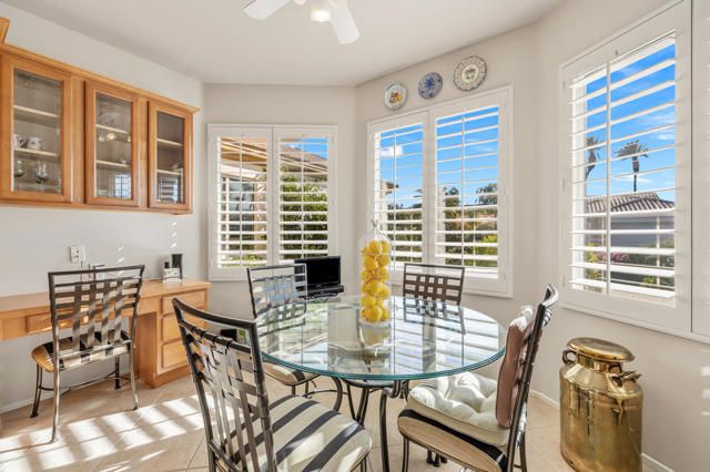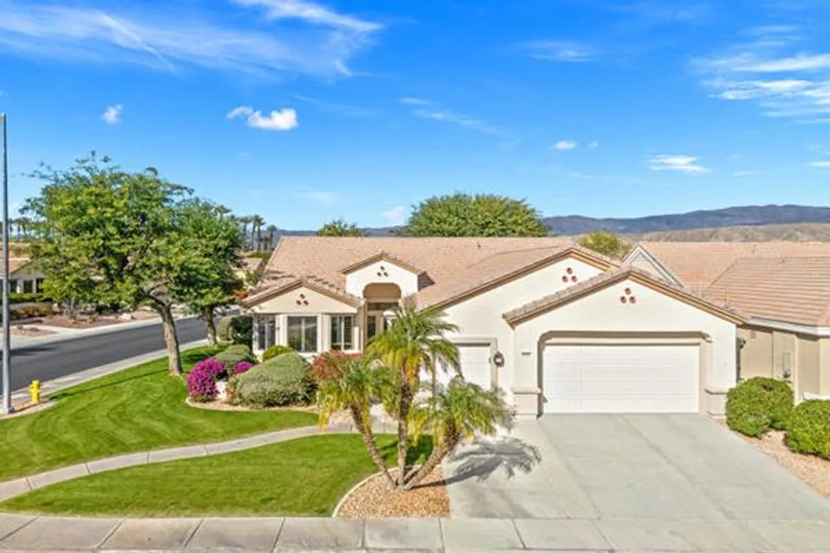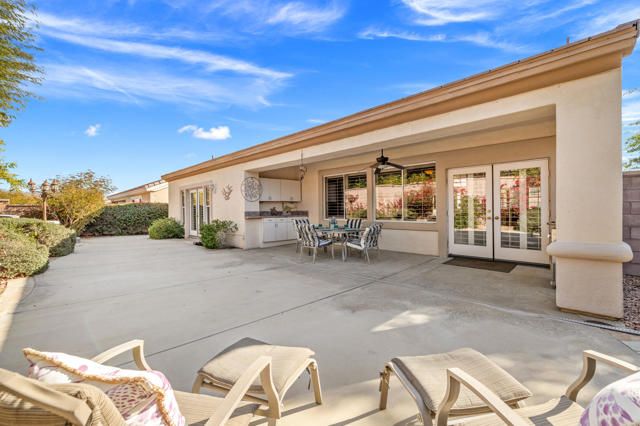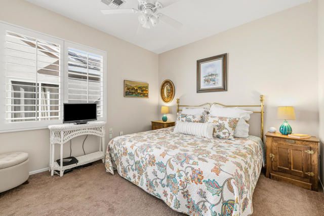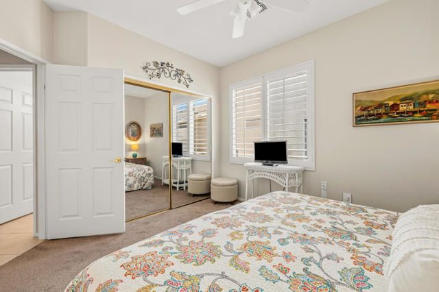 55+ Sun City Palm Desert offers the ''BEST BANG FOR YOUR BUCK'' active lifestyle retirement community in the whole desert! This highly sought after open-concept St. Croix model has 2 bedrooms, 2 baths, plus versatile DEN/OFFICE and a golf cart garage. This home is situated on a spacious corner lot and is located right smack in the middle of community within walking distance of the Sunset View clubhouse. Beautiful curb appeal, gated courtyard, real grass, easy maintenance desert/tropical landscaping. Inside, built-in custom cabinetry throughout in the kitchen, living room, master bedroom, and office, 16 inch tile on the diagonal throughout, ceiling fans, and plantation shutters. Kitchen has chefs island, breakfast bar and breakfast nook with a view, slab granite, stainless fridge, pull-out drawers, and built-in desk. The living and dining rooms are open to the kitchen with French doors to the patio. The living room has custom built-in media center. The spacious master bedroom suite has built-in entertainment center, sliding door to the patio, the bath has tiled counters and shower and custom closet organizing system. The guest bedroom has bath adjacent in the hall. The den/office has built-in desk with an additional flex space/hobby room with pocket door in-between. Laundry room is inside, upper cabinets and sink, and washer/dryer are included. The covered patio has a high wall for extra privacy, above-ground hot tub, and a fountain that creates a serene atmosphere for relaxing and/or entertaining with family and friends. Sun City is all about the LIFESTYLE...low HOA dues, (4) salt water 87 degree pools, (2) 18-hole golf courses, tennis, pickleball, softball, bocce ball, 18-hole putting course, art and social clubs, entertainment, post office, restaurants and even a new outside area with fire tables at Boulevards with awesome views! ''Buy Where you Love to Play...Sun City Palm Desert!''