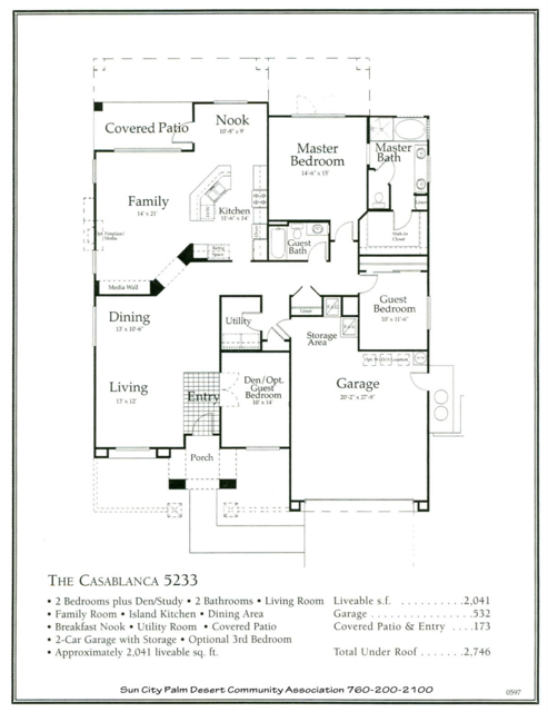 Sun City Palm Desert, 55+ community. This rare Casablanca floorplan has A NEW HVAC SYSTEM IN 2022, a newer hot water tank, new carpet and pads, newer washer and dryer, and new disposal. It has 2 bedrooms, a large den, a small bonus flex room, and 2 full bathrooms. It is Located in the best 55+ community in the Valley, Sun City Palm Desert. With newer exterior paint, and a gated courtyard, the curb appeal is fabulous. The home has high ceilings, a formal dining room, spacious living room and a family room complete with a cozy fireplace. The well designed kitchen is open to the family room, and offers corian countertops, a center island, custom pull out shelving, and a bright, cheery kitchenette, with a view to the northeast facing backyard. The master bedroom is roomy, with a huge picture window looking out to the serene, desert landscaped yard. The bathroom has a walk-in shower, custom walk-in closet, double vanity and a bathtub. The guest bedroom is adjacent to the 2nd full bathroom and is very comfy and inviting. The original laundry room is now a small flex room with many possibilities. The 2 car garage has wall to wall custom built-in storage, and a convenient laundry area. SUN CITY PALM DESERT IS ALL ABOUT LIFESTYLE!! It has many clubs, activities, amenities, 24 hr. security, and low HOA dues. Play at 2 championship 18-hole golf courses and practice facilities, pickle ball, tennis, softball, bocci ball, an 18-hole miniature golf course, an honor library, arts and crafts, a ballroom for special entertainment, and 4 saltwater pools kept at 87 degrees with hot tubs. Enjoy 2 great restaurants, a martini/coffee bar, and even a post office. There is a newly renovated classy indoor/outdoor bar with fire tables to enjoy the awesome views and our beautiful desert weather..