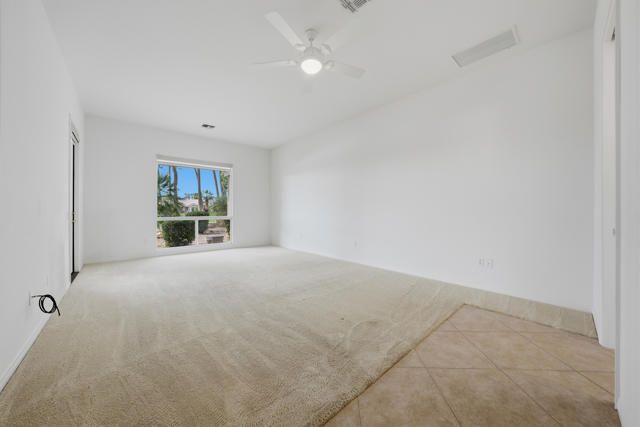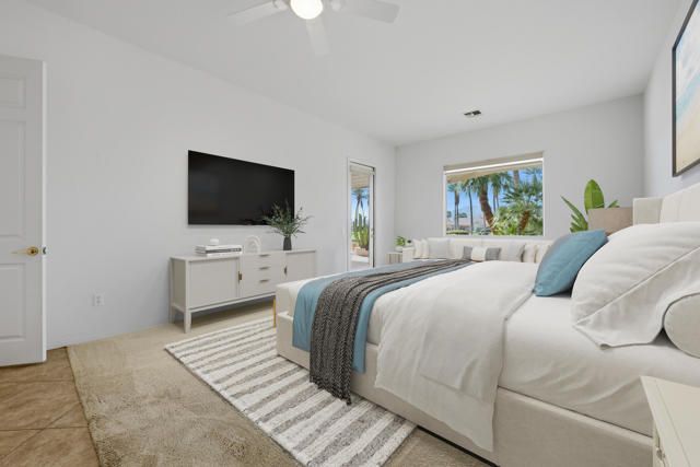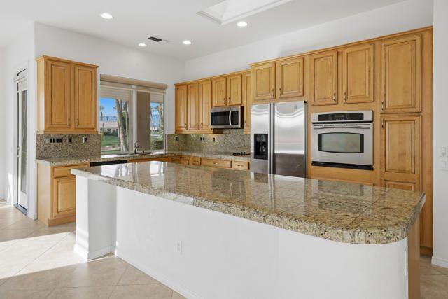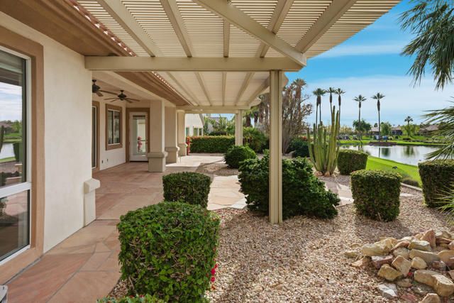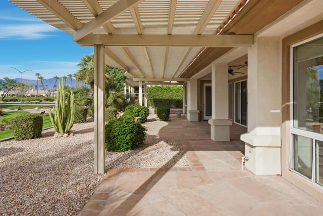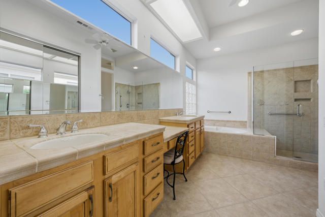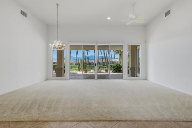Sun City Palm Desert - Monaco. Set in a truly fabulous location overlooking the 18 hole putting course and just around the corner from the Lakeview Fitness Center and pool, this exceptional Monaco model captures the best of desert resort living. An elevated, south-facing rear yard features a flagstone patio with firepit and offers panoramic views of the putting course, lake, and surrounding mountains--an ideal setting for both relaxation and entertaining. A gated front courtyard and glass front doors create inviting curb appeal while filling the interior with natural light. Inside, the home impresses with soaring 12-foot ceilings in the foyer and great room, complemented by 10-foot ceilings throughout the rest of the home. Large-format 20-inch tile is featured in all living areas except the great room and bedrooms. The great room showcases expansive views through a double slider that opens to the rear patio, seamlessly blending indoor and outdoor living. The adjacent family room offers a cozy gathering space with a tile-trimmed gas fireplace. The kitchen is thoughtfully designed with extended maple cabinetry featuring an antiqued finish and pullout shelves, stainless steel appliances, a large chef's island, skylight, under-cabinet lighting, smooth glass electric cooktop (plumbed for gas), and a wall oven. Matching maple cabinetry continues throughout the bathrooms and laundry room. This well-designed home offers three bedrooms, each with an ensuite bathroom. The extended primary suite features a door to the rear patio, a spacious walk-in closet, and a luxurious ensuite bath with spa tub, dual sinks with sitting vanity, tile surfaces, and a stall shower with rimless glass enclosure. The extended guest suite includes French doors to the front courtyard and an ensuite bath with stall shower, rain glass doors, and tile finishes. A third guest suite also features an ensuite bath with stall shower and rain glass doors. Additional highlights include a laundry room with abundant storage and utility sink, a gigantic 2+ golf cart garage, recirculating hot water, and dual air-conditioning systems replaced in 2019. An exceptional opportunity to enjoy views, privacy, and close proximity to premier amenities in one of Sun City Palm Desert's most desirable settings.