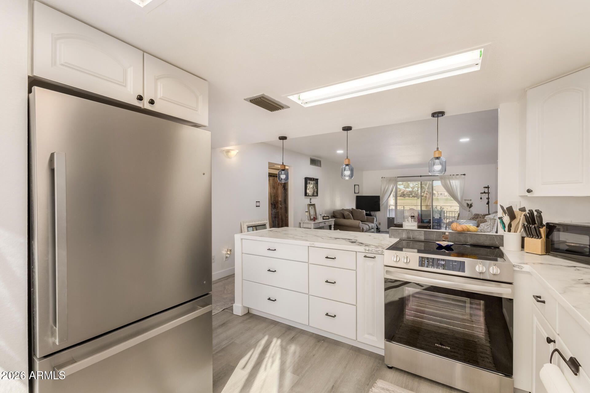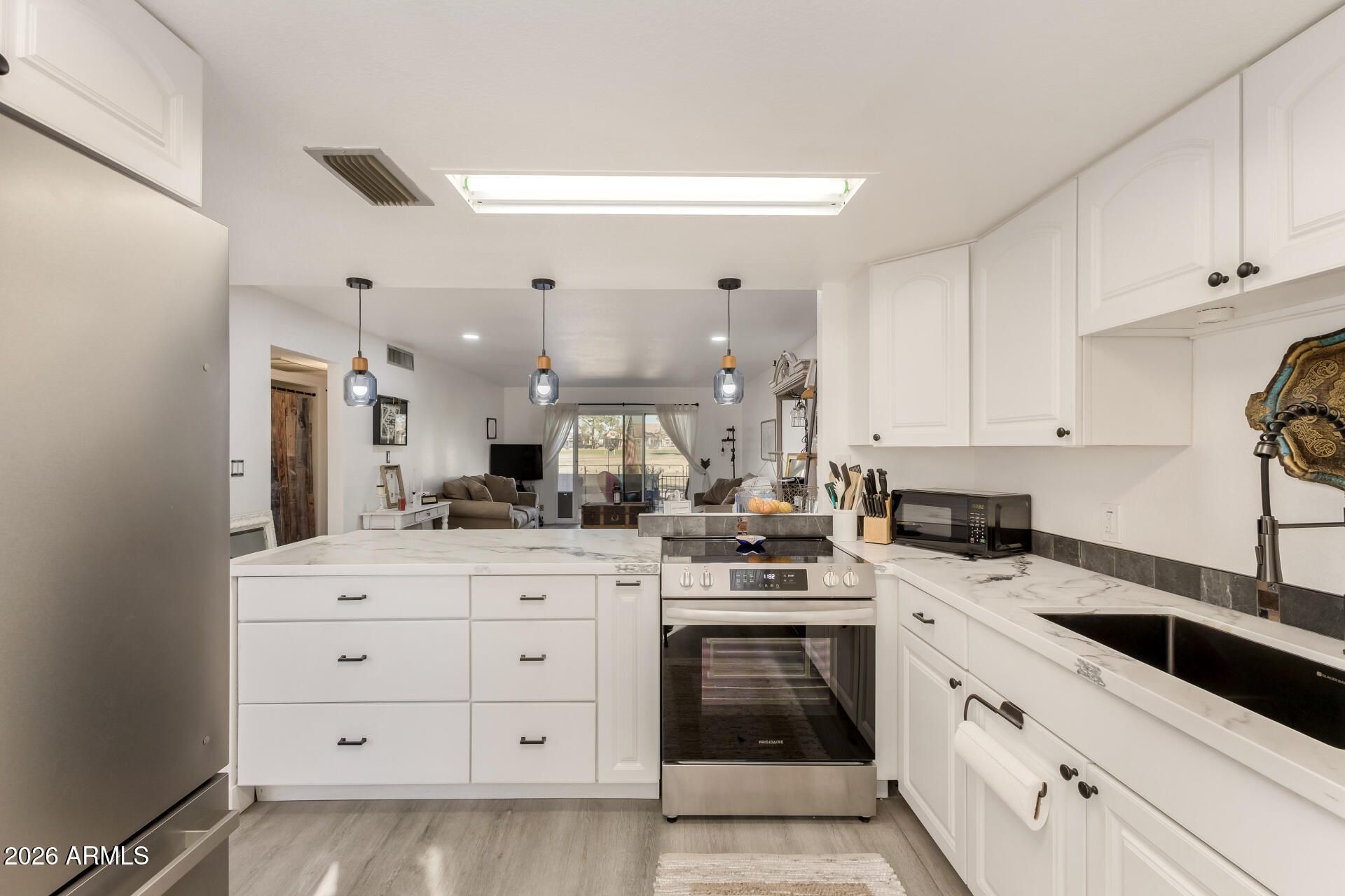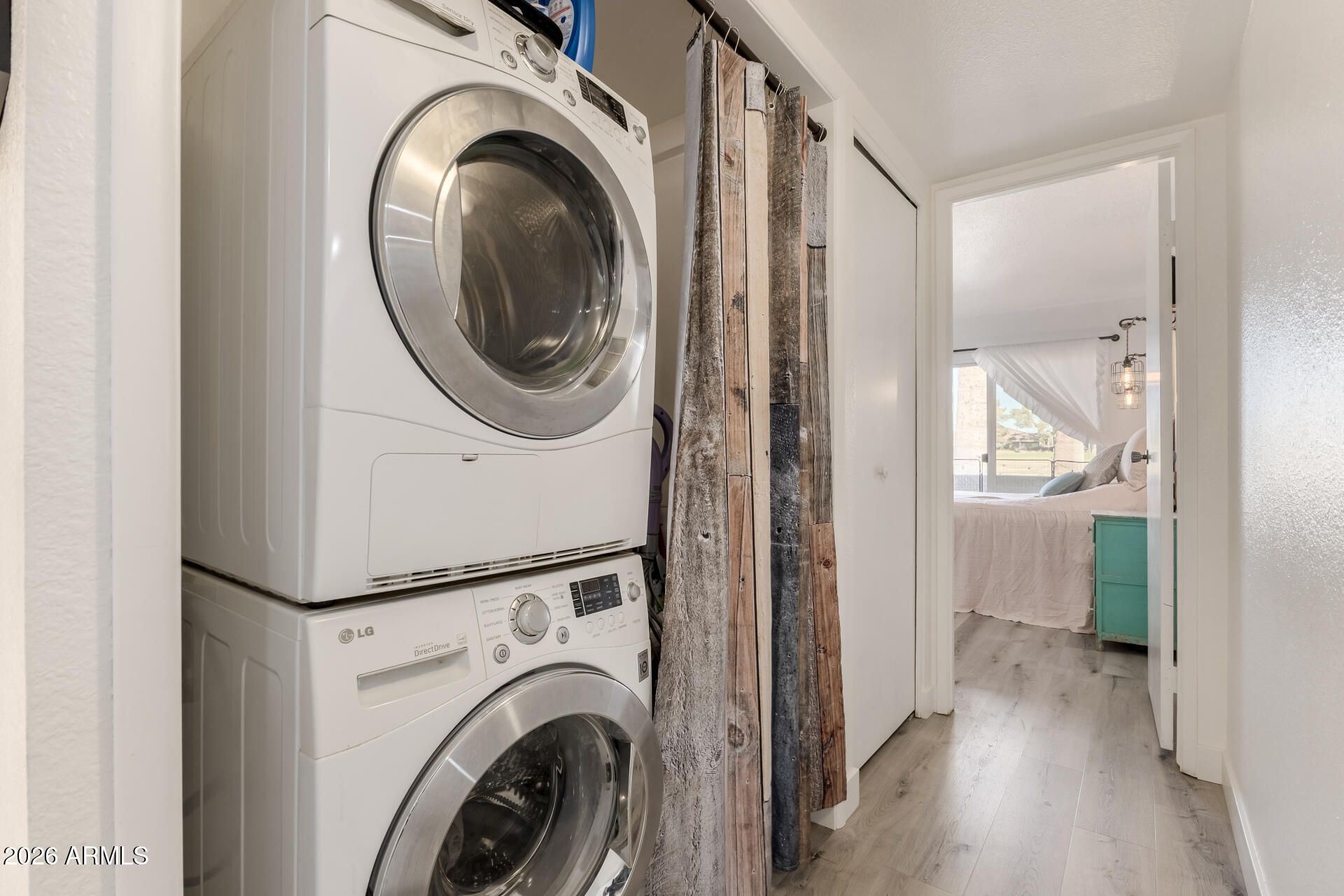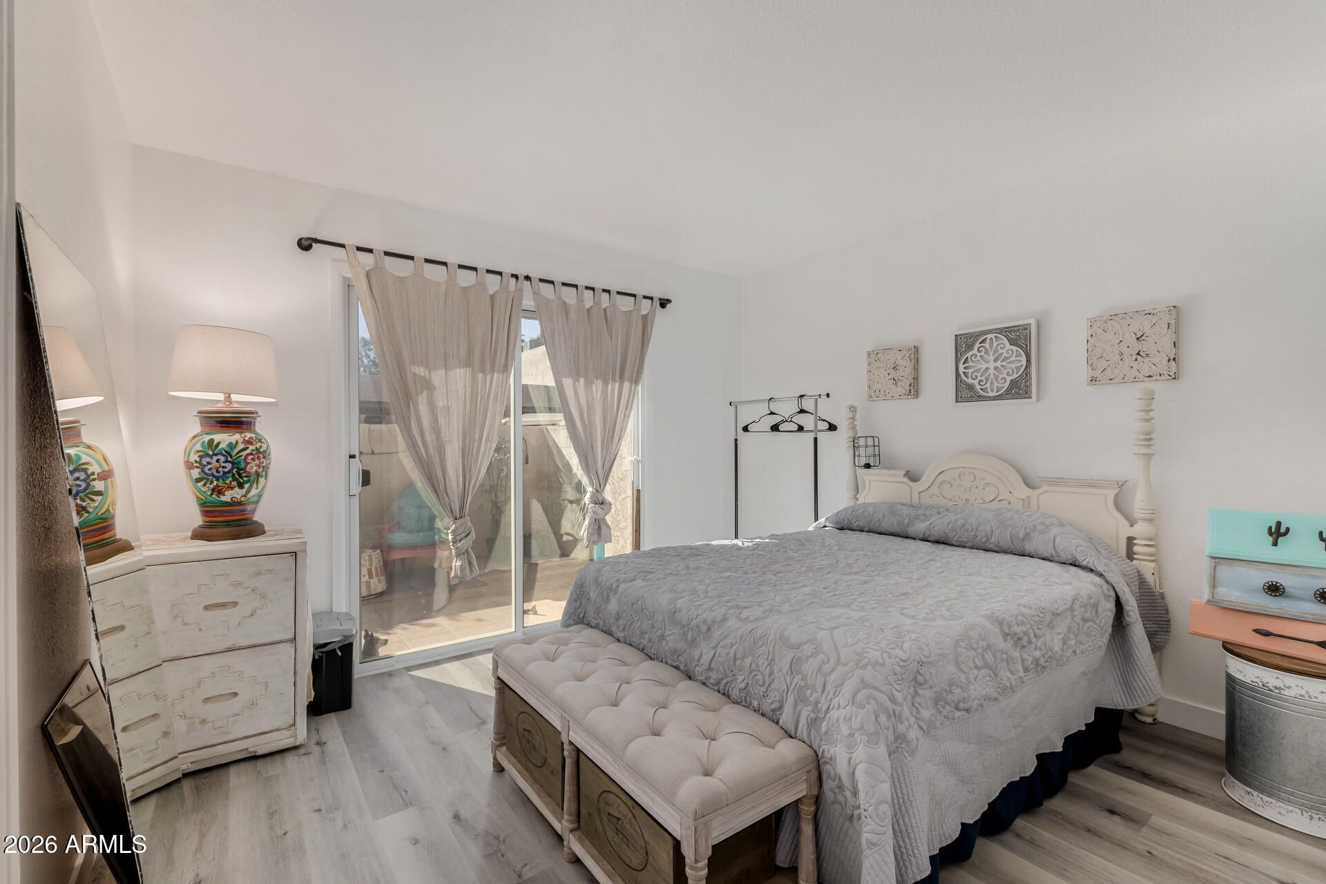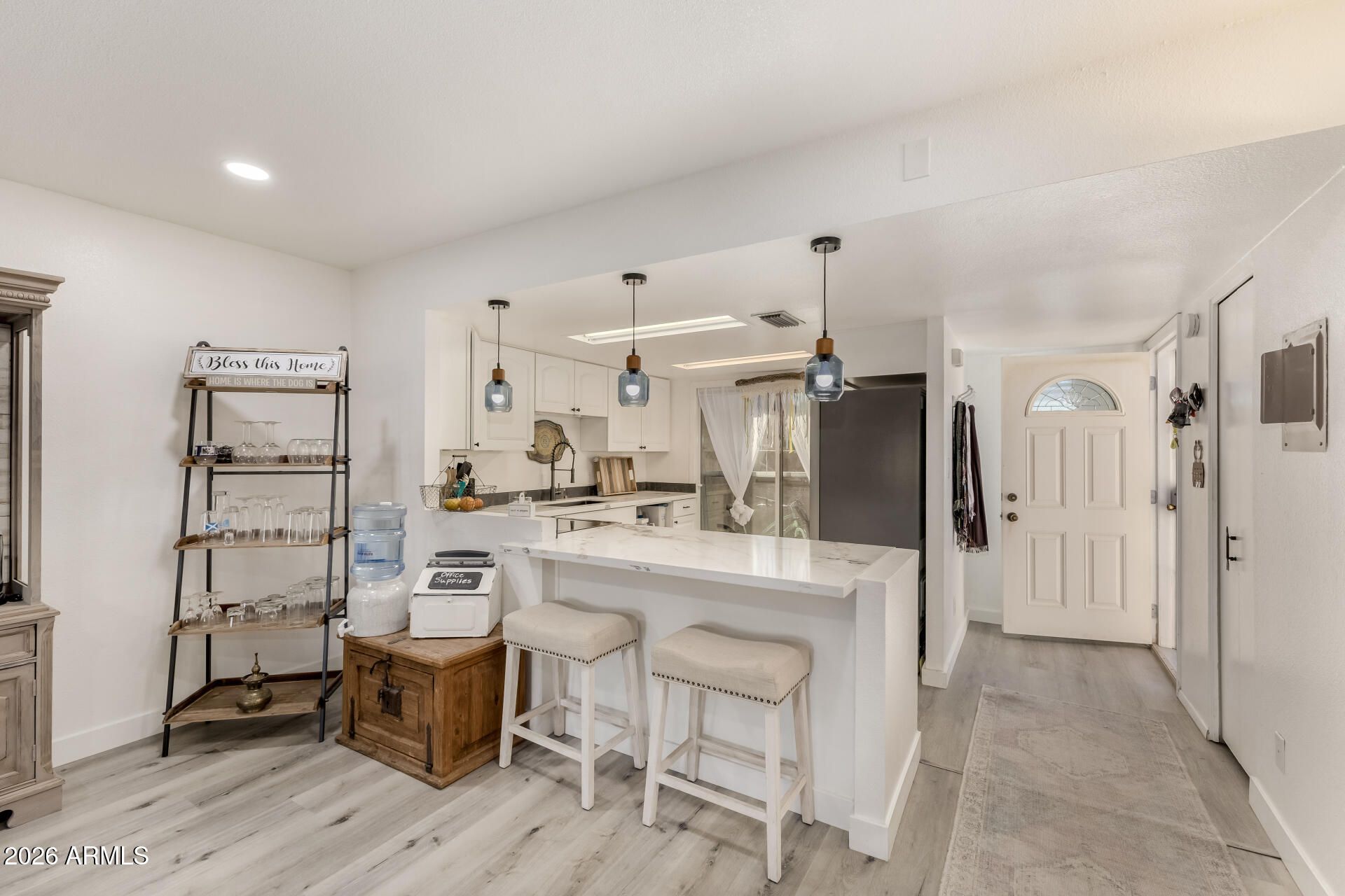 Enjoy relaxed living in this charming patio home positioned along the Community golf course! A private courtyard entry welcomes you inside, where an open layout showcases neutral paint, wood-look flooring, & recessed lighting. The well-appointed kitchen features stylish pendant lighting, breakfast bar, quartz counters, white cabinetry, SS appliances, & sliding doors to the courtyard. Both bedrooms offer direct outdoor access, enhancing the home's connection to the outdoors! The main bedroom has dual closets & a private bathroom. Additional highlights include a stacked washer/dryer, a covered carport space w/a storage closet, & a serene backyard patio overlooking the golf course. Community amenities are a clubhouse, sparkling pool, golf course, & more. A true retirement gem!