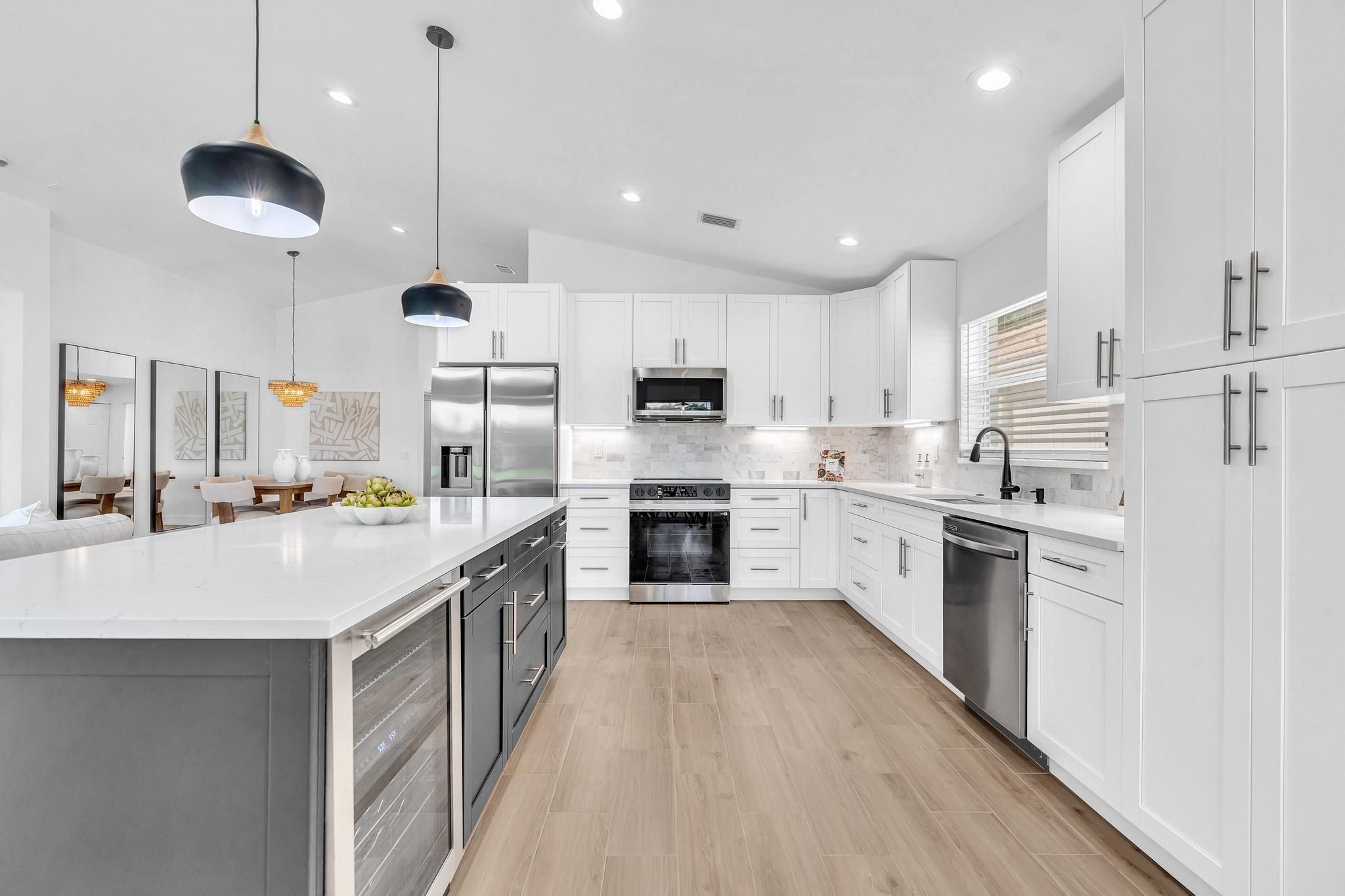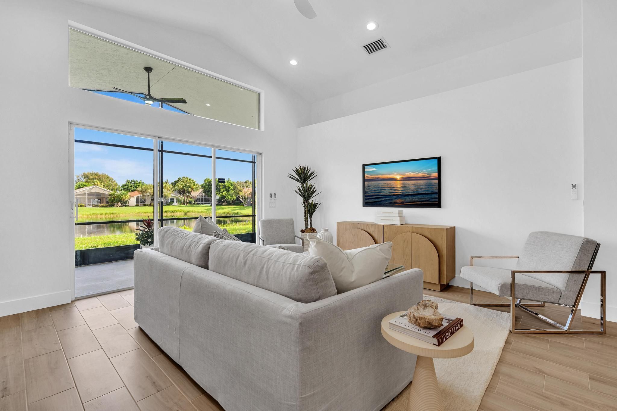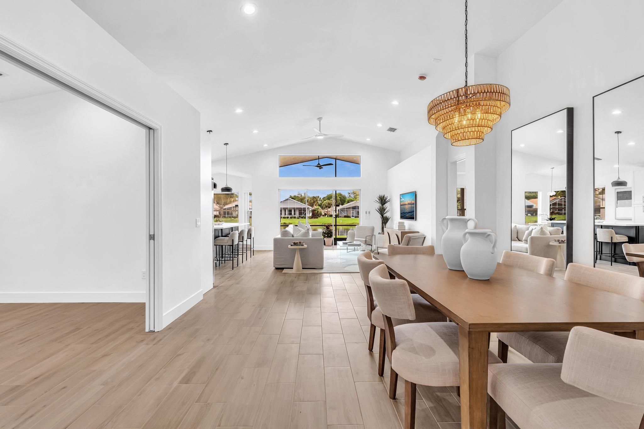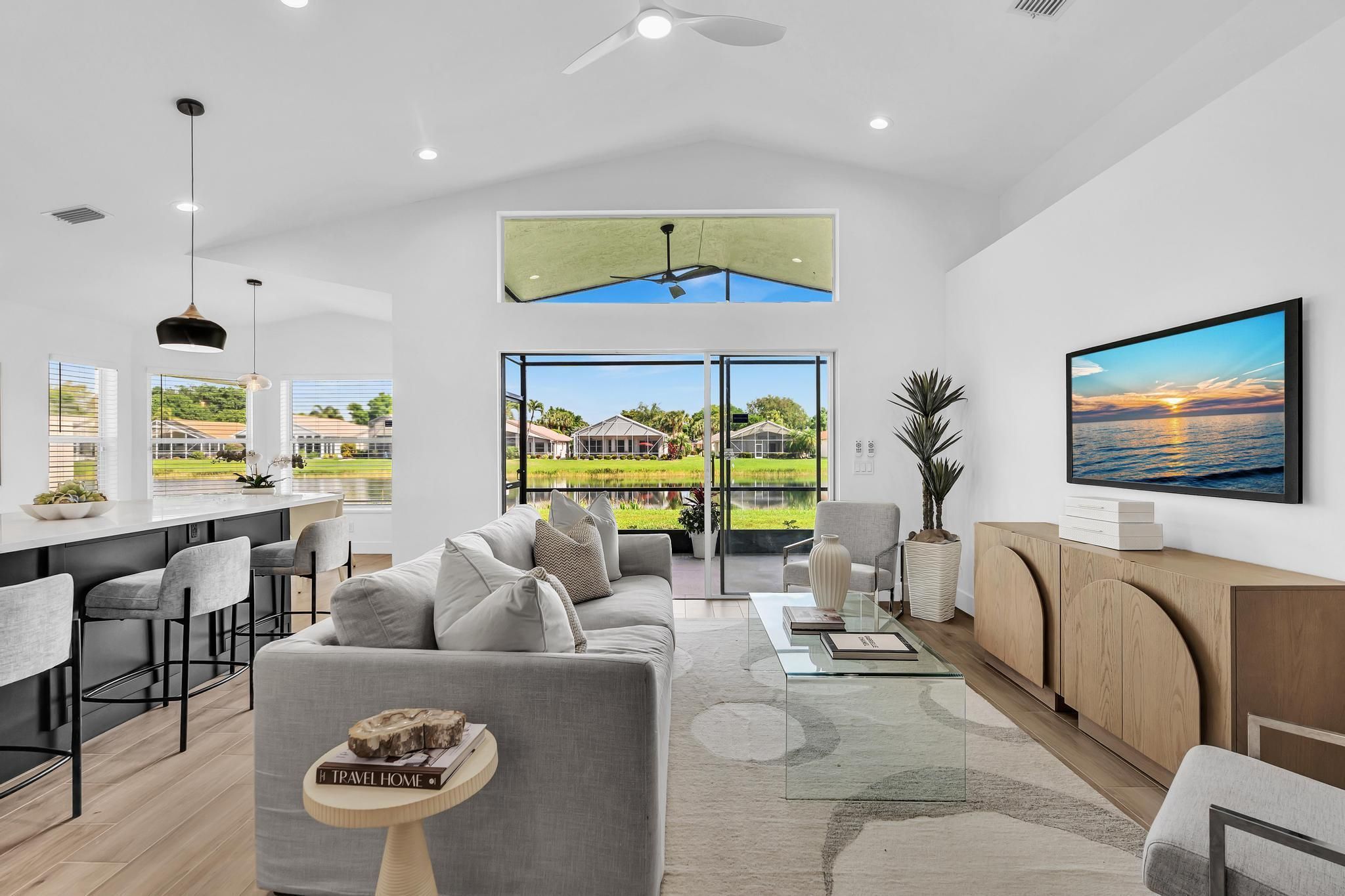 COMPLETELY RENOVATED and move-in ready, this spectacular 3BR/2BA home offers beautifully refined living space with water views and no detail overlooked. Enjoy total peace of mind w/ FULL IMPACT WINDOWS & DOORS, NEW ROOF, New HWH indoor-outdoor livinand AC 2018 combining modern efficiency, storm protection and exceptional curb appeal. The chef's kitchen is truly the heart of the home, showcasing brand new stainless steel appliances, wine refrigerator, and premium finishes throughout. It's both functional and striking perfect for everyday living and effortless entertaining. Designer-curated bathrooms elevate the home with spa-like elegance, featuring a freestanding soaking tub and walk-in showers that create a serene retreat. The Screened in Florida room offers water views and seamless indoor-outdoor living. Ideal for relaxing mornings, sunset evenings, or hosting guests year-round. Located in the prestigious, gated, and pet-friendly community of Valencia Lakes, residents enjoy a newly renovated clubhouse with café, resort-style pools, spa, tennis, pickleball, and an active lifestyle calendar. Just minutes to beaches, dining, and shopping. This is true lakefront luxury, completely turnkey and ready to enjoy.