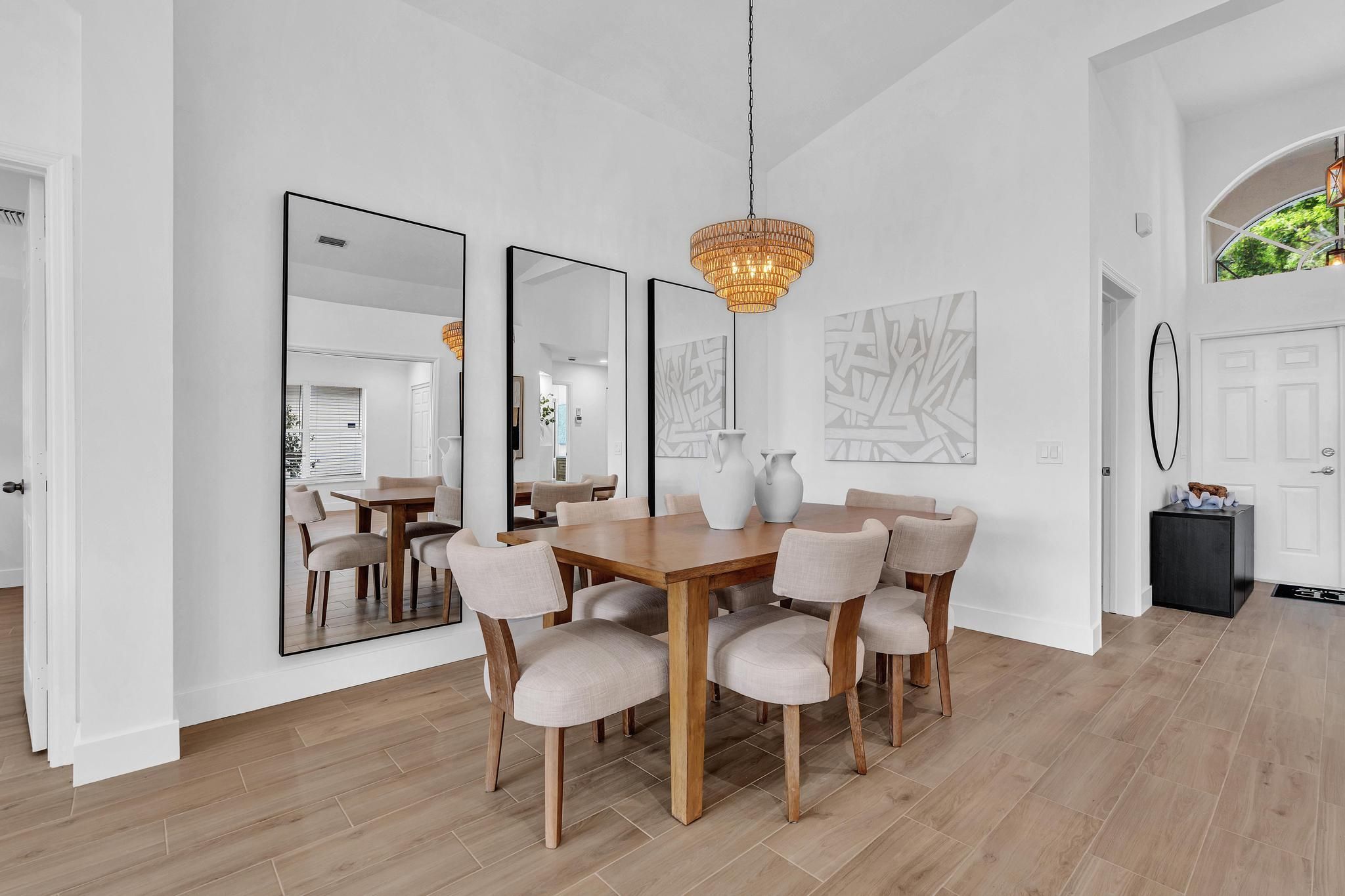 - Cathedral Ceiling(s), High Ceilings, Kitchen Island, Vaulted Ceiling(s), Impact Glass, Living/Dining Room, Eat-in Kitchen, Kitchen/Dining Combo, Dual Sinks, Main Level Primary, Separate Shower, Soaking Tub