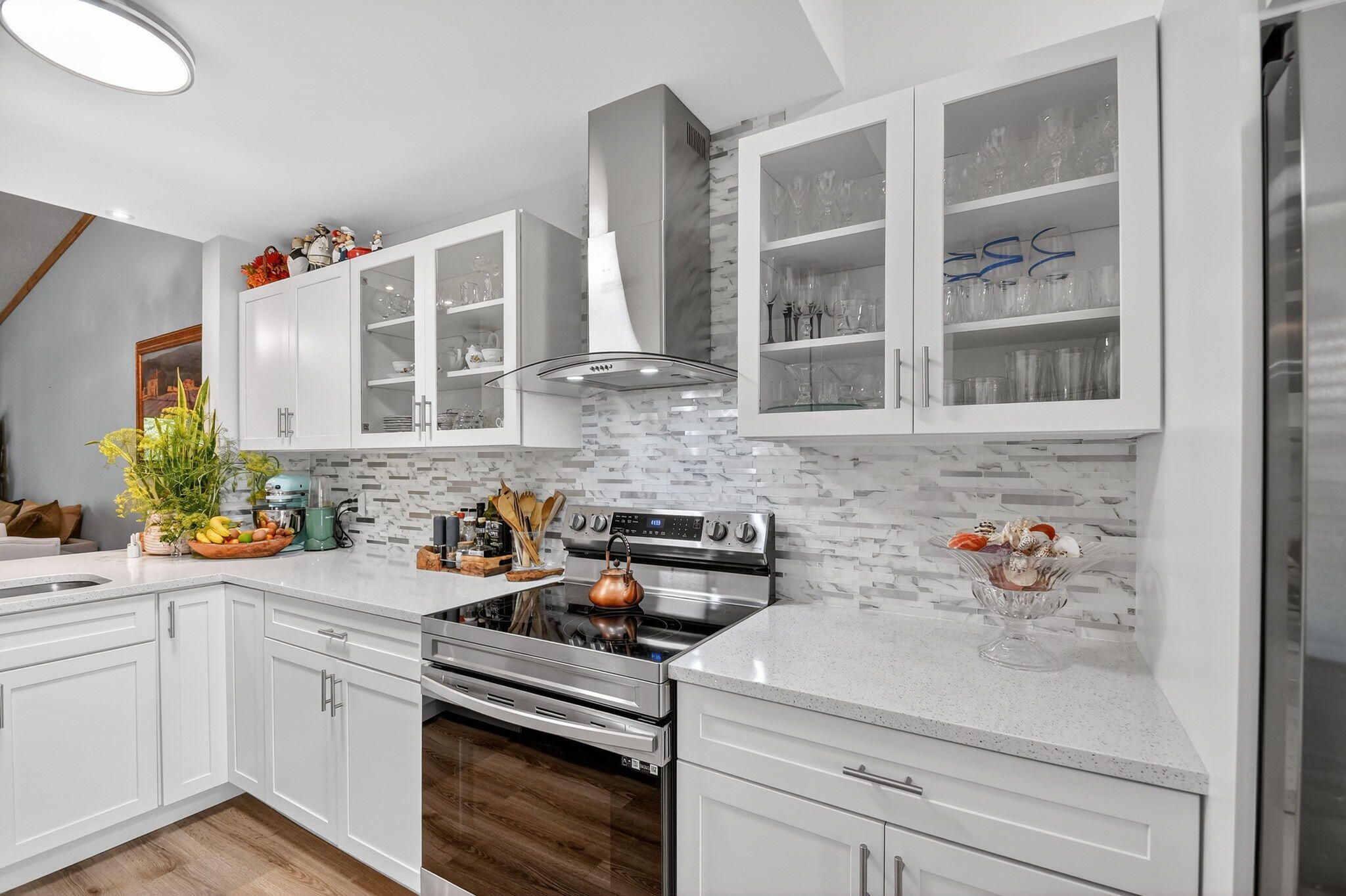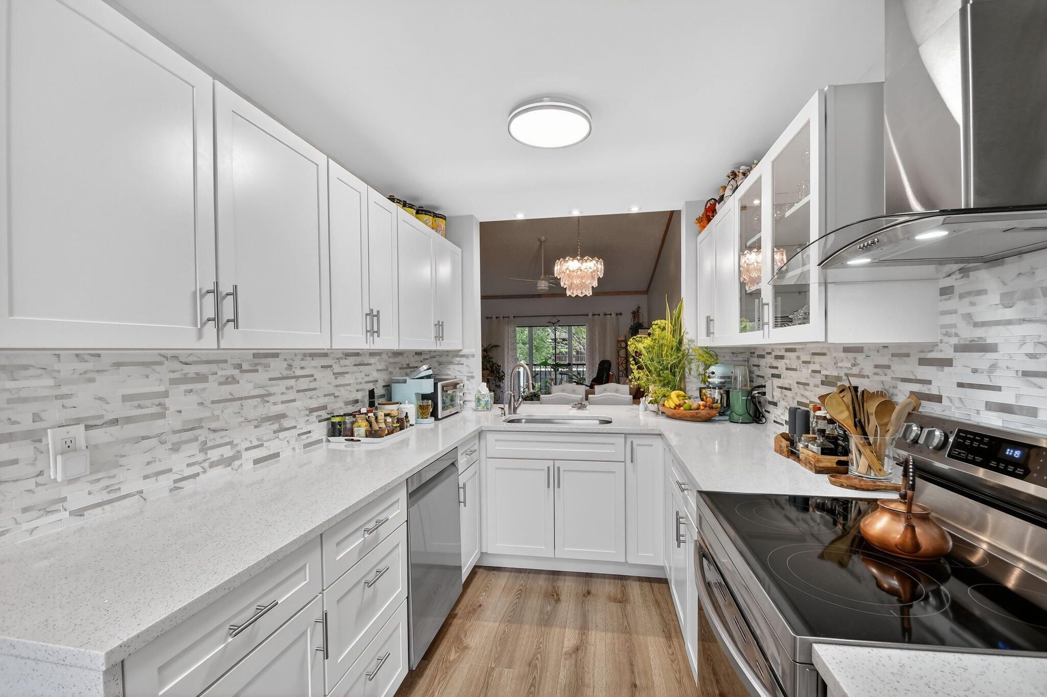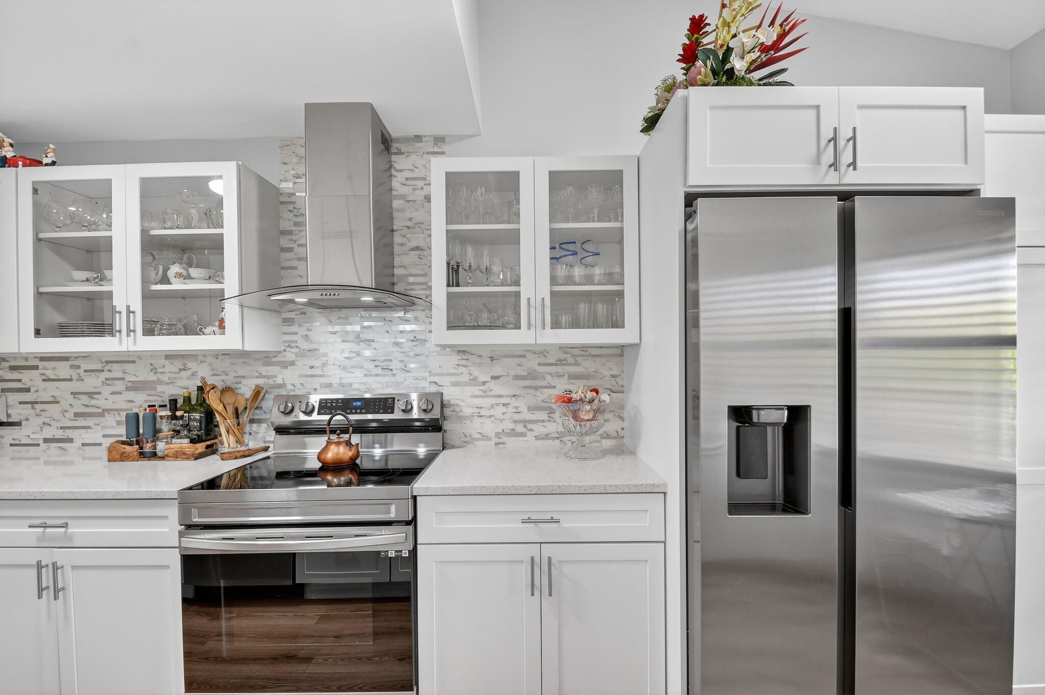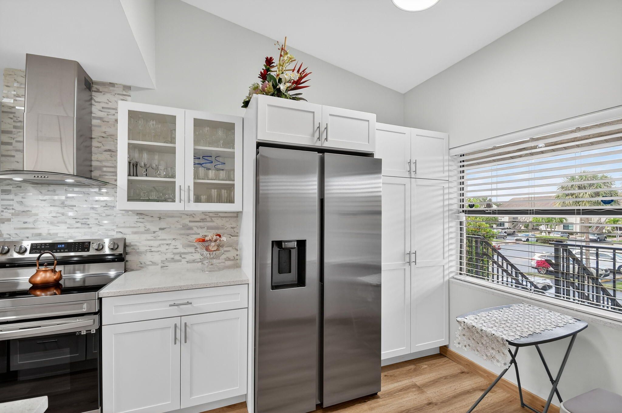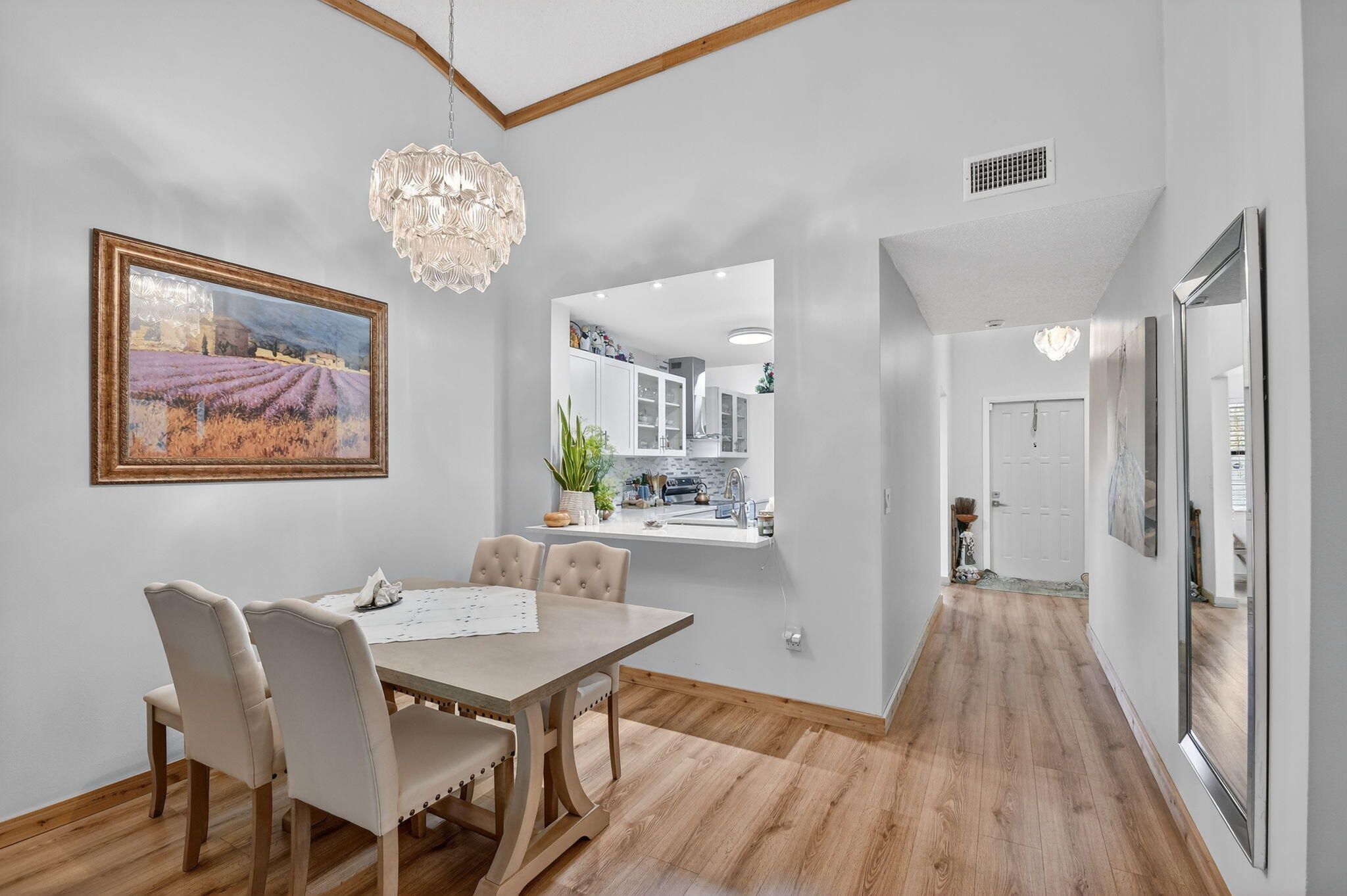 Beautifully remodeled kitchen with white shaker cabinets with glass windows doors, quartz countertop and new stainless steel appliances. The outside exhaust hood will be the chef's dream.The primary suite serves as a true retreat, offering a generous walk-in closet and a renovated bathroom featuring a contemporary designer vanity. Every detail in this home has been thoughtfully updated to meet the highest standards of comfort and style. Situated within the prestigious Willow Bend 55+ community, residents enjoy an active lifestyle with access to premier amenities including two heated pools, tennis and pickleball courts, shuffleboard, a fitness center, and a vibrant community room with a robust social calendar. This pet-friendly community (up to 20 lbs) is ideally located near the Turnpike, fine dining, and shopping, and is just 7 miles from pristine local beaches.