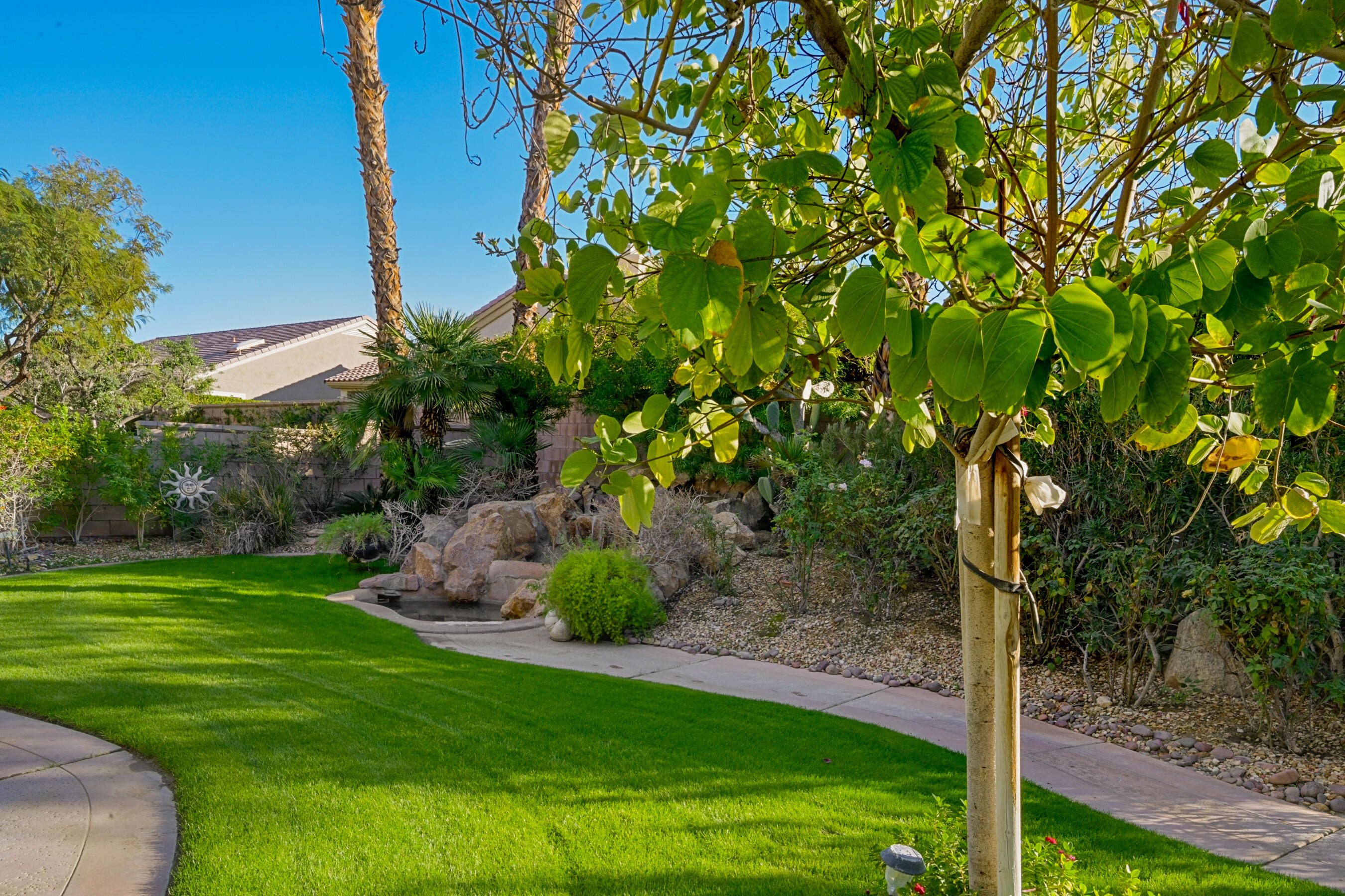 Welcome to this beautifully appointed Morocco floor plan, offering 1,888 sq. ft. (EST.) of thoughtfully designed living space on a prime south-facing, private lot within the premier 55+ active adult community of Sun City Palm Desert. Featuring 3 bedrooms, including a detached casita, and 3 bathrooms, this versatile residence is designed to accommodate full-time living, gracious guest stays, or a quiet home office or personal retreat. A gated private front courtyard offers an elegant and welcoming arrival, accented by an Alumawood patio cover and built-in BBQ—an ideal setting for alfresco dining and entertaining. Tile flooring throughout enhances the open, inviting layout, providing both durability and effortless flow between living spaces. The spacious great room is filled with natural light and connects seamlessly to the outdoor living areas, making it perfectly suited for everyday comfort and entertaining. The kitchen features generous cabinetry, stainless steel appliances, ample counter space, and a center island that anchors the heart of the home, while adjacent dining and living areas are designed for relaxed gatherings. The primary suite serves as a peaceful sanctuary with a spacious layout and an ensuite bath. An additional guest bedroom offers direct access to the front courtyard with a nearby full bathroom, adding both convenience and privacy. The detached casita is exceptionally well-appointed with tile flooring, a mini refrigerator, sink, and a generously sized closet, providing a comfortable and private guest retreat. Step outside to an entertainer's backyard oasis, beautifully landscaped with palm trees, citrus trees, and winding walkways. A custom rock waterfall spills into a Pebble Tec spa, creating a serene, resort-like atmosphere. The extended patio with Alumawood cover allows for year-round enjoyment, whether relaxing or hosting beneath the desert sky. Sun City Palm Desert residents enjoy world-class amenities including championship golf courses, expansive clubhouses, fitness centers, pools and spas, tennis and pickleball courts, social clubs, and a vibrant calendar of activities. This exceptional home offers a rare blend of privacy, comfort, and resort-style living in one of the desert's most sought-after communities.