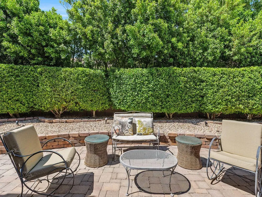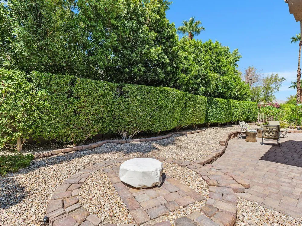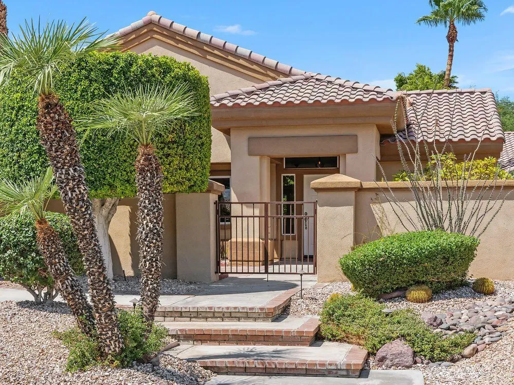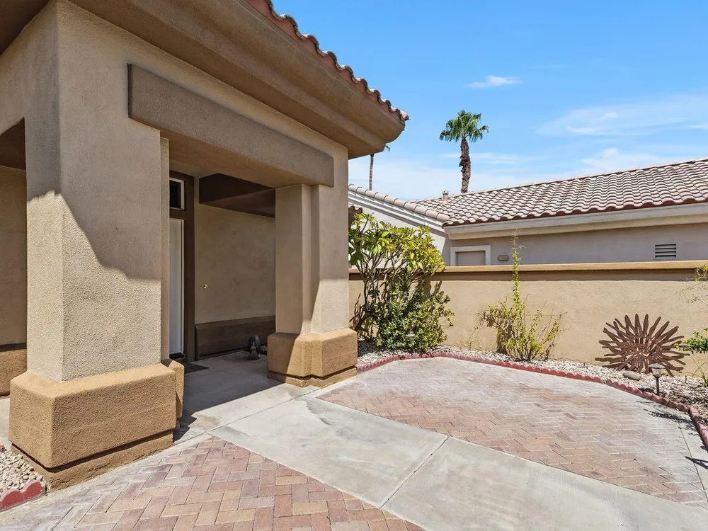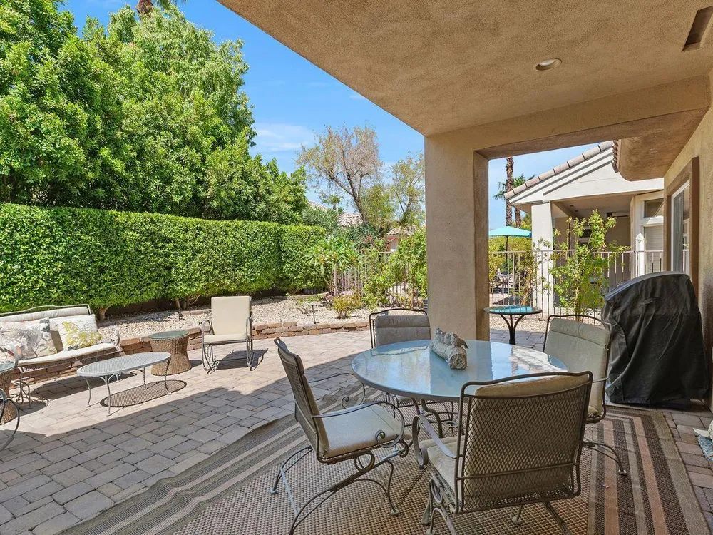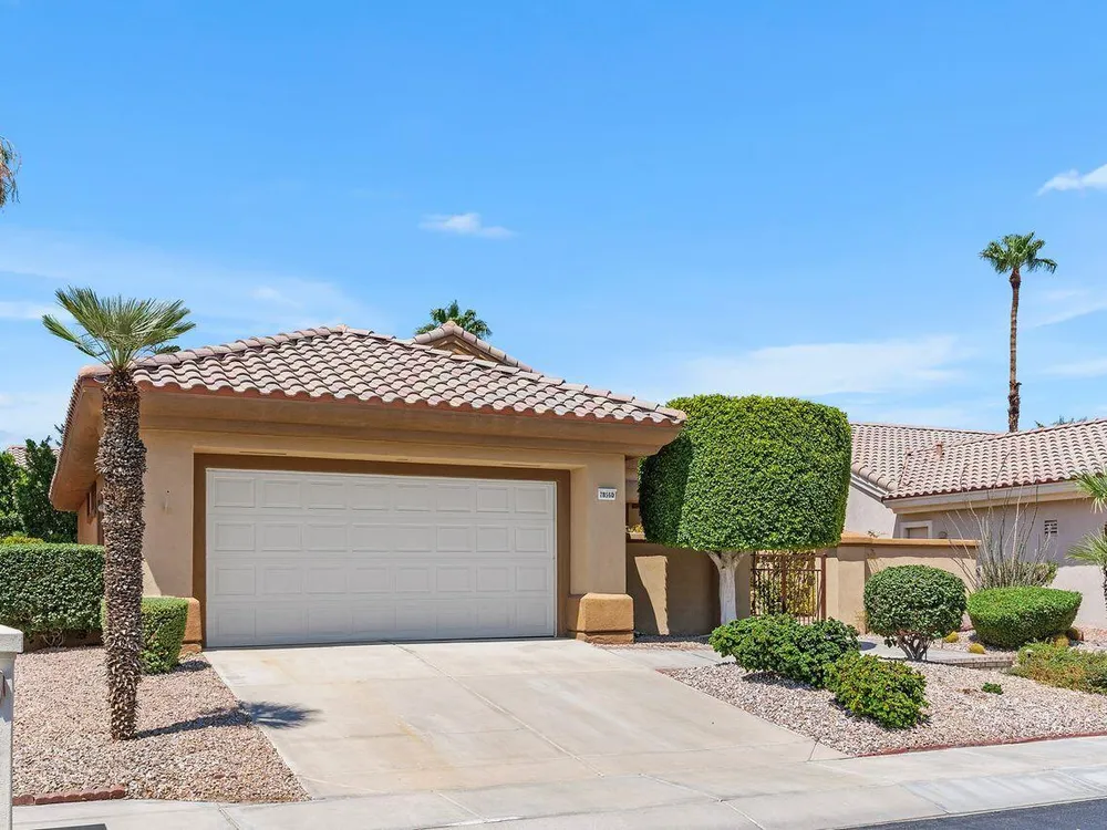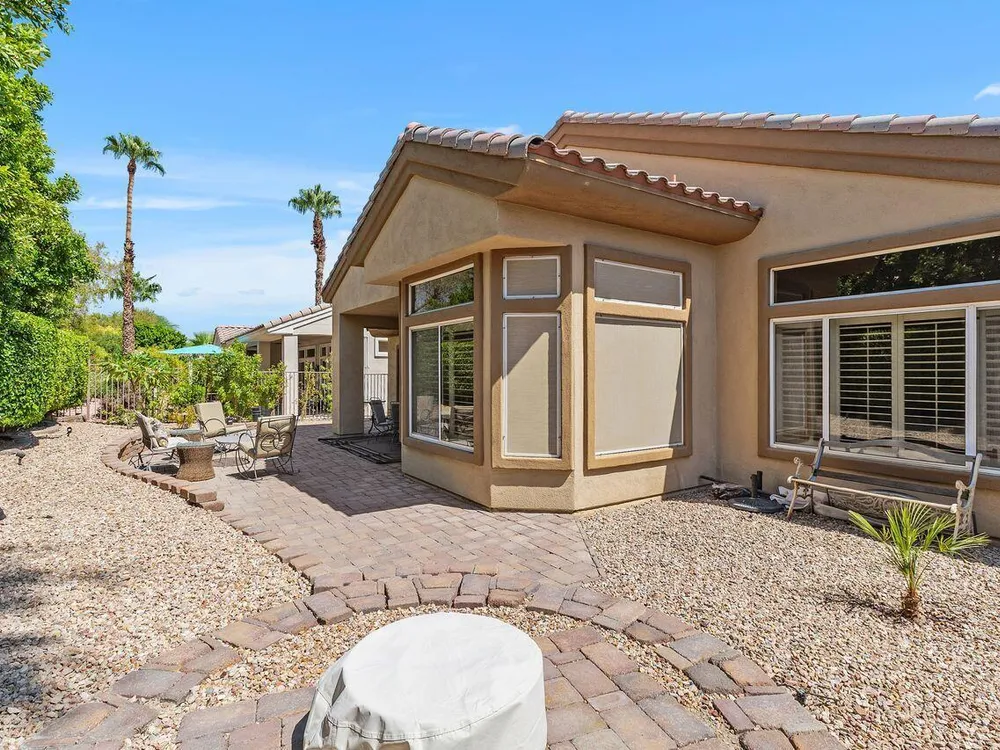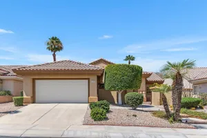 Sun City Palm Desert - Waterford Model | 55+ Community Ideally situated just a short walk from the Mountain View Clubhouse, this beautifully upgraded Waterford Model offers exceptional curb appeal and stylish desert living. Fresh exterior paint, low-maintenance desert landscaping, and interlocking pavers create a warm welcome, while the south-facing courtyard is perfect for enjoying sunny desert days. Step inside to a bright and inviting living room with sliding doors that lead to a spacious, fenced rear patio—ideal for entertaining or relaxing in privacy. The smart split-bedroom floor plan ensures extra privacy, with bedrooms and bathrooms located on opposite sides of the home. Elegant wood floors, plantation shutters, and quality window treatments are found throughout. The kitchen is a true highlight, featuring abundant counter space, upgraded cabinet doors, a gas range, newer stainless refrigerator, and upgraded countertops. The charming breakfast nook is surrounded by windows and opens to the patio, bringing the outdoors in. The primary suite includes a large walk-in closet, dual vanities, and a walk-in shower, offering comfort and convenience. An oversized indoor laundry room with a built-in desk provides a functional home office space, while the attached two-car garage features ample storage racks. Both bathrooms have been completely remodeled, and the kitchen has been tastefully upgraded. Offered fully furnished and turnkey, this home is move-in ready—just bring your toothbrush! A must-see opportunity to enjoy the best of Sun City Palm Desert living.