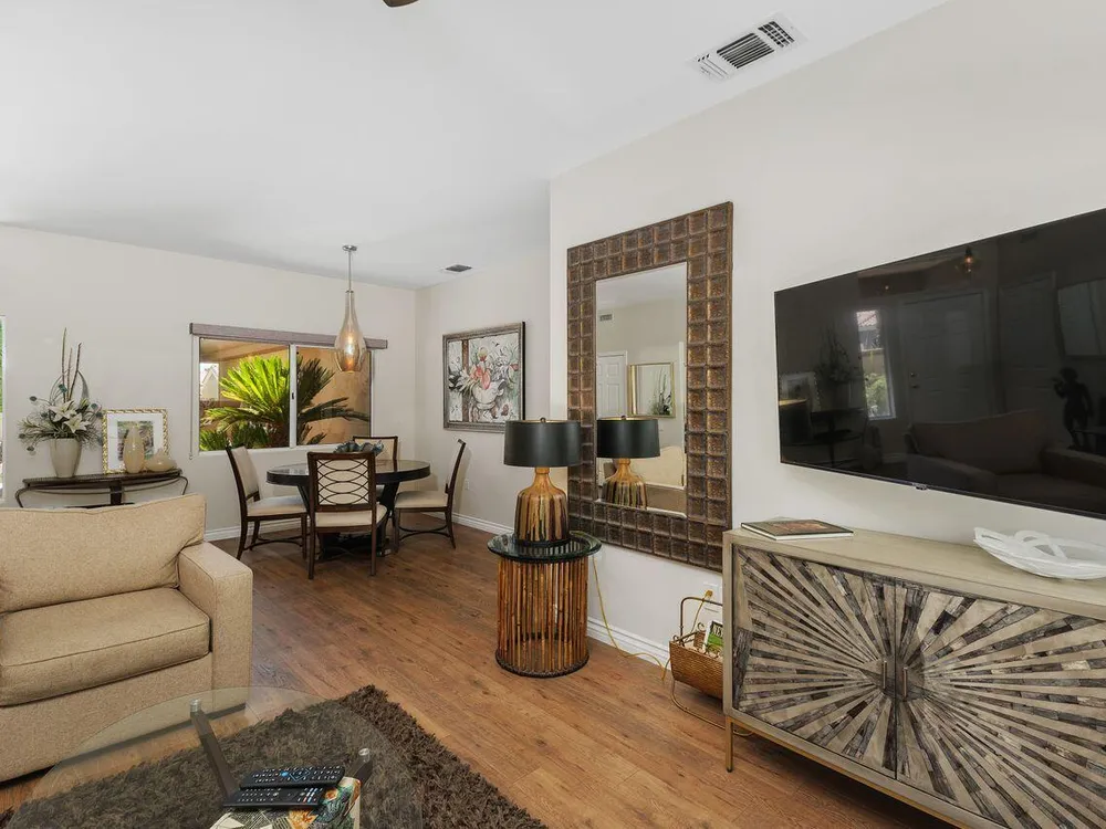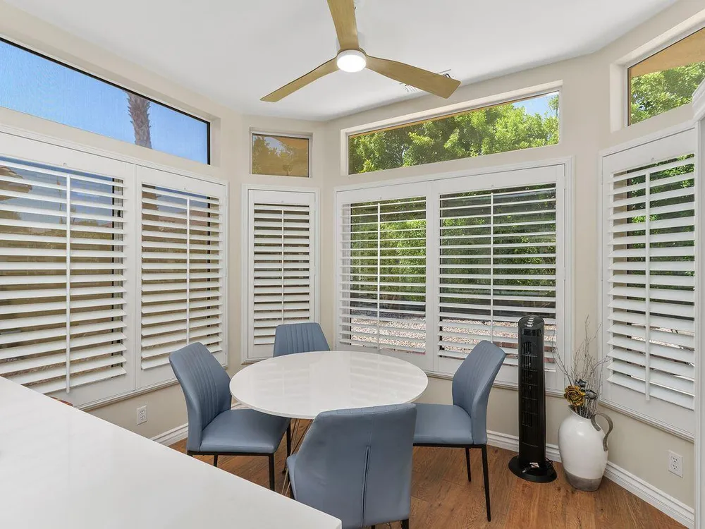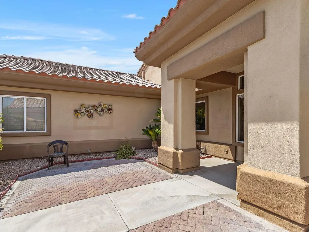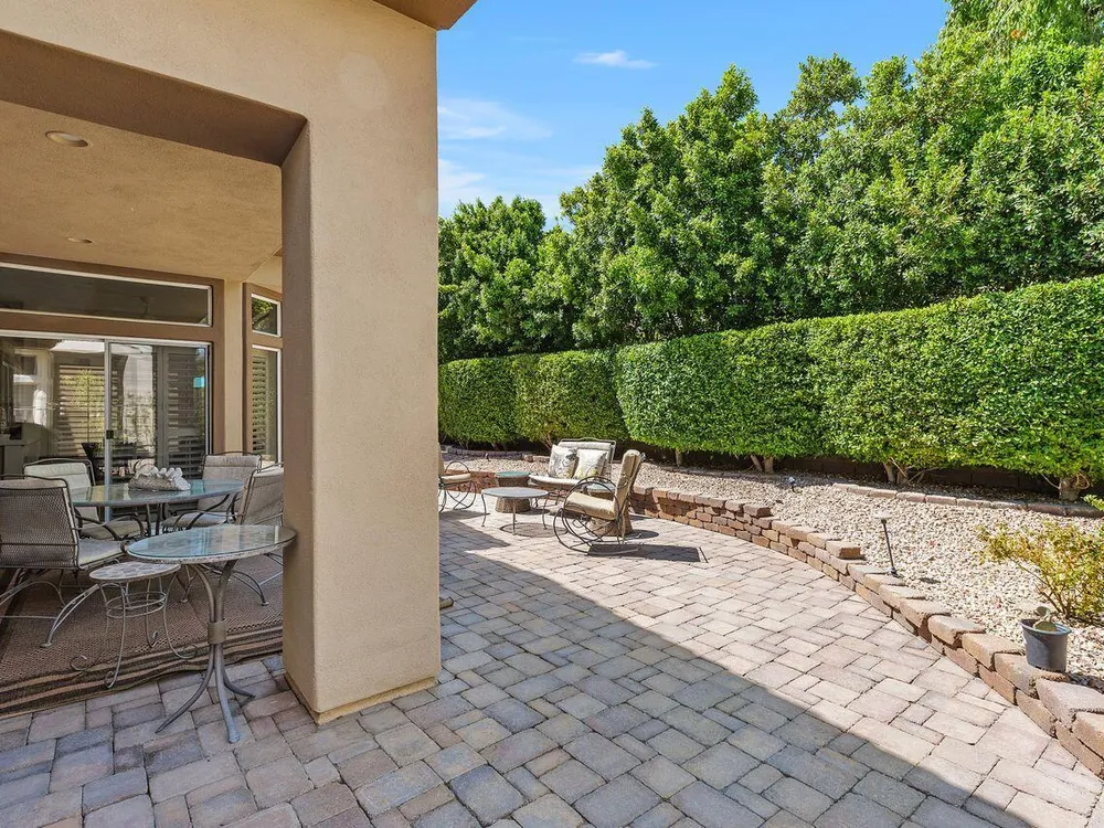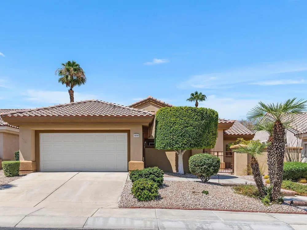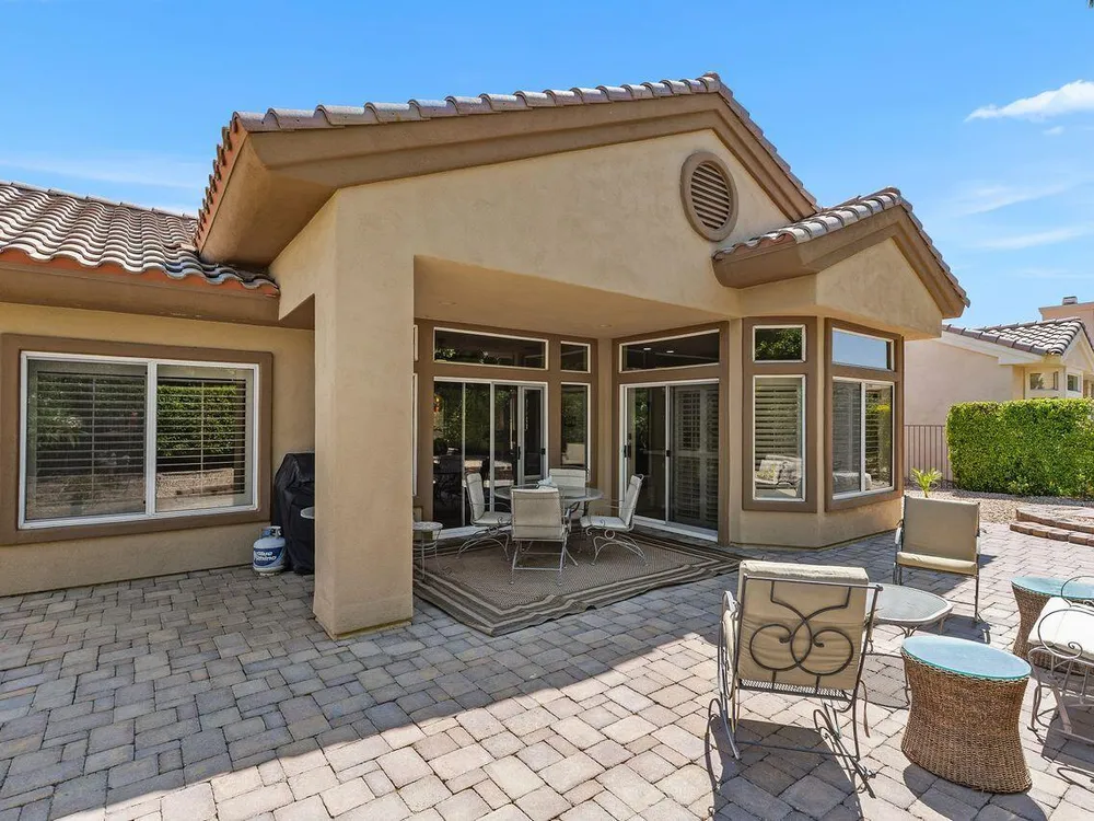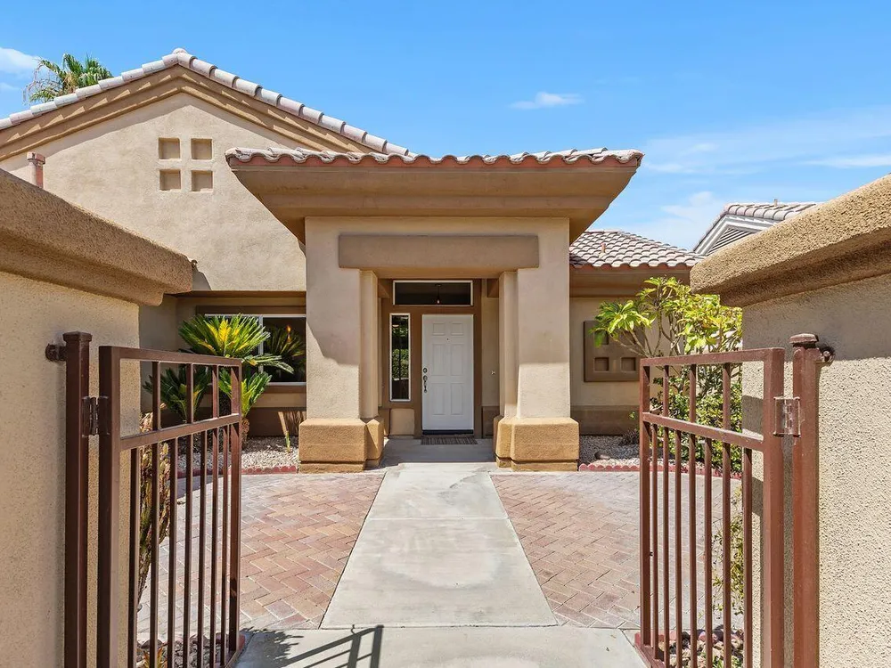 Sun City Palm Desert - Waterford Model | 55+ Community Ideally situated just a short walk from the Mountain View Clubhouse, this beautifully upgraded Waterford Model offers exceptional curb appeal and stylish desert living. Fresh exterior paint, low-maintenance desert landscaping, and interlocking pavers create a warm welcome, while the south-facing courtyard is perfect for enjoying sunny desert days. Step inside to a bright and inviting living room with sliding doors that lead to a spacious, fenced rear patio—ideal for entertaining or relaxing in privacy. The smart split-bedroom floor plan ensures extra privacy, with bedrooms and bathrooms located on opposite sides of the home. Elegant wood floors, plantation shutters, and quality window treatments are found throughout. The kitchen is a true highlight, featuring abundant counter space, upgraded cabinet doors, a gas range, newer stainless refrigerator, and upgraded countertops. The charming breakfast nook is surrounded by windows and opens to the patio, bringing the outdoors in. The primary suite includes a large walk-in closet, dual vanities, and a walk-in shower, offering comfort and convenience. An oversized indoor laundry room with a built-in desk provides a functional home office space, while the attached two-car garage features ample storage racks. Both bathrooms have been completely remodeled, and the kitchen has been tastefully upgraded. Offered fully furnished and turnkey, this home is move-in ready—just bring your toothbrush! A must-see opportunity to enjoy the best of Sun City Palm Desert living.