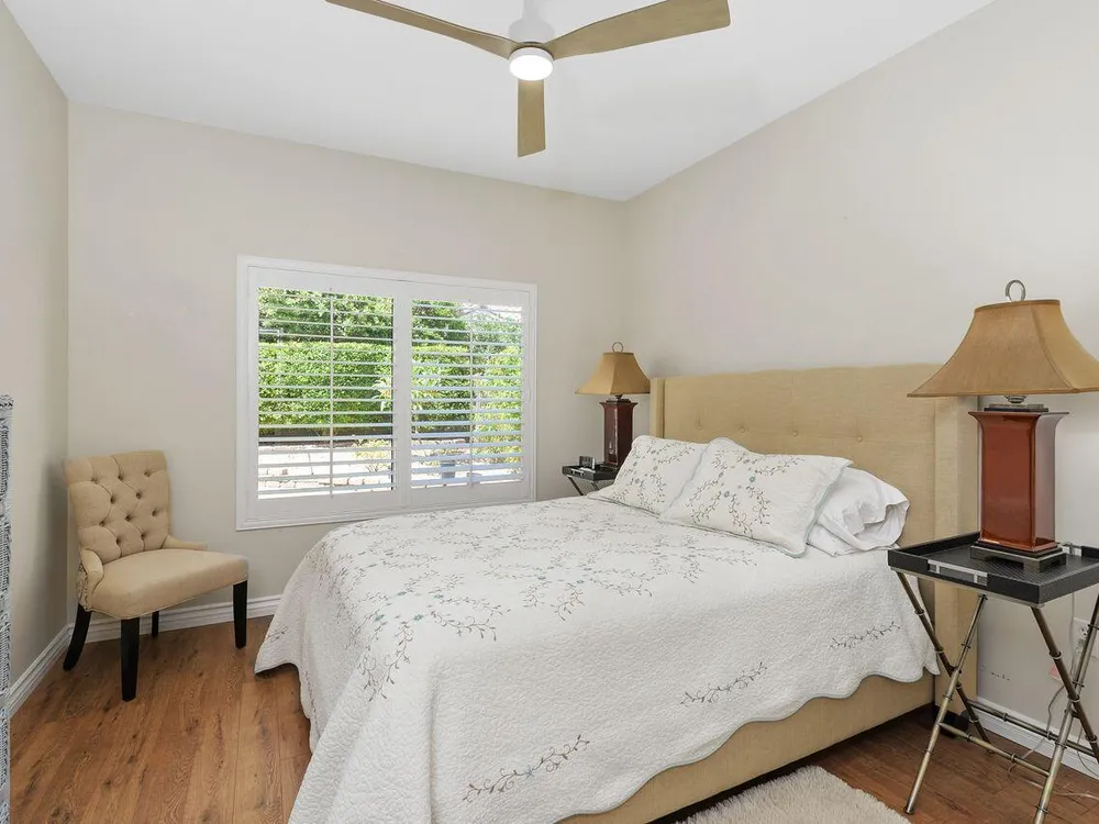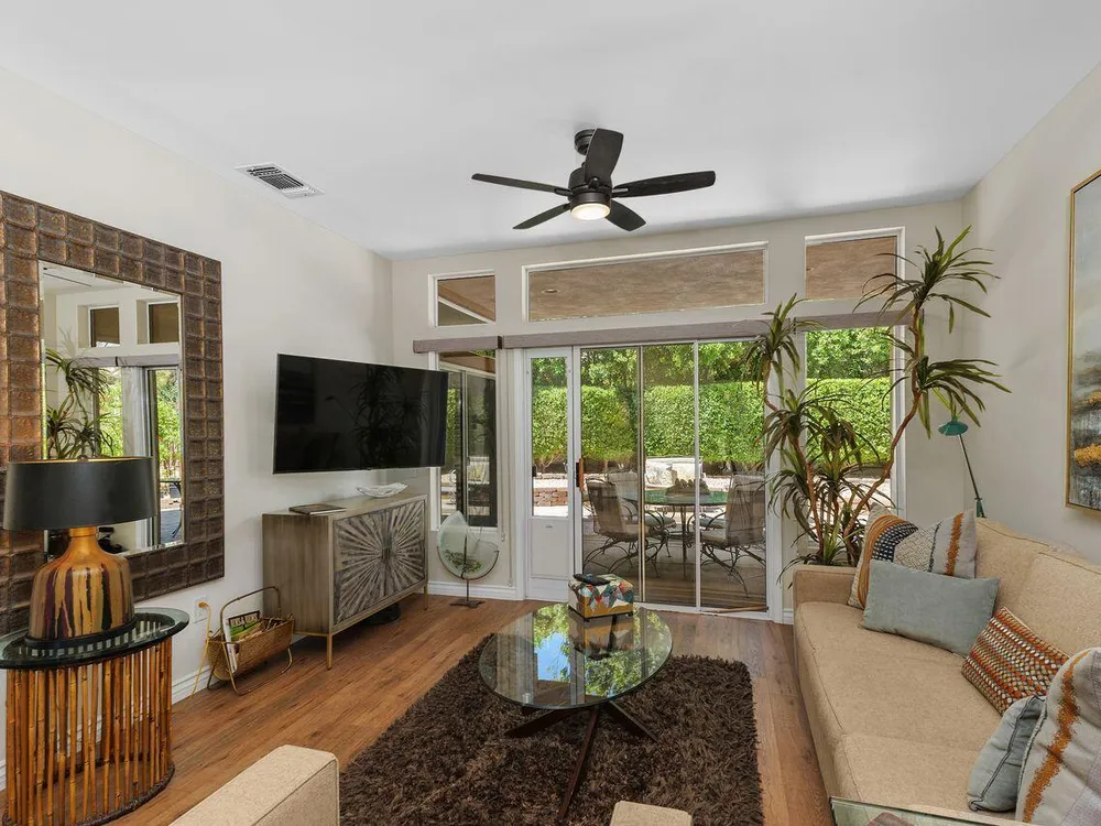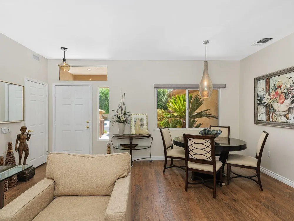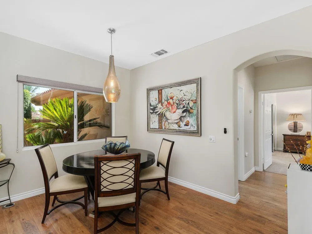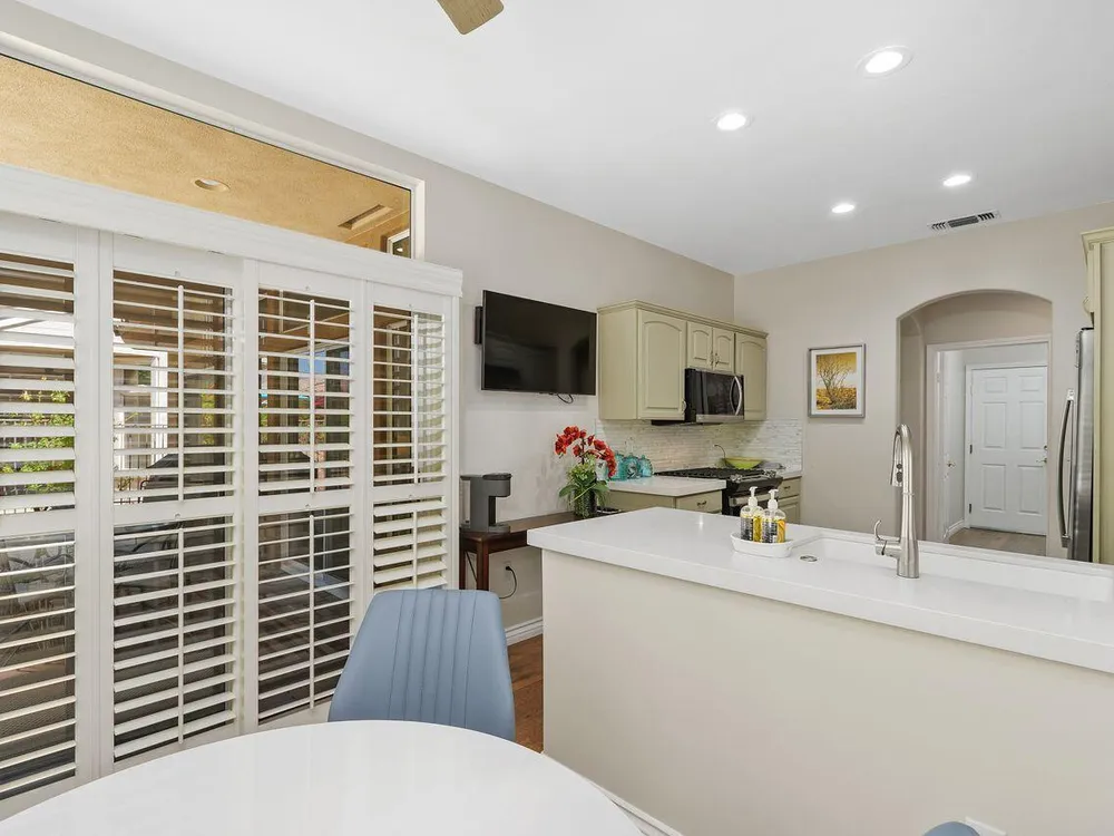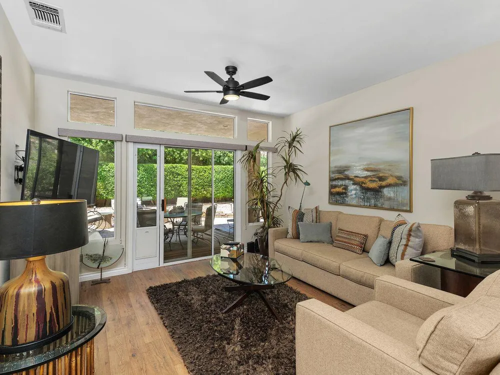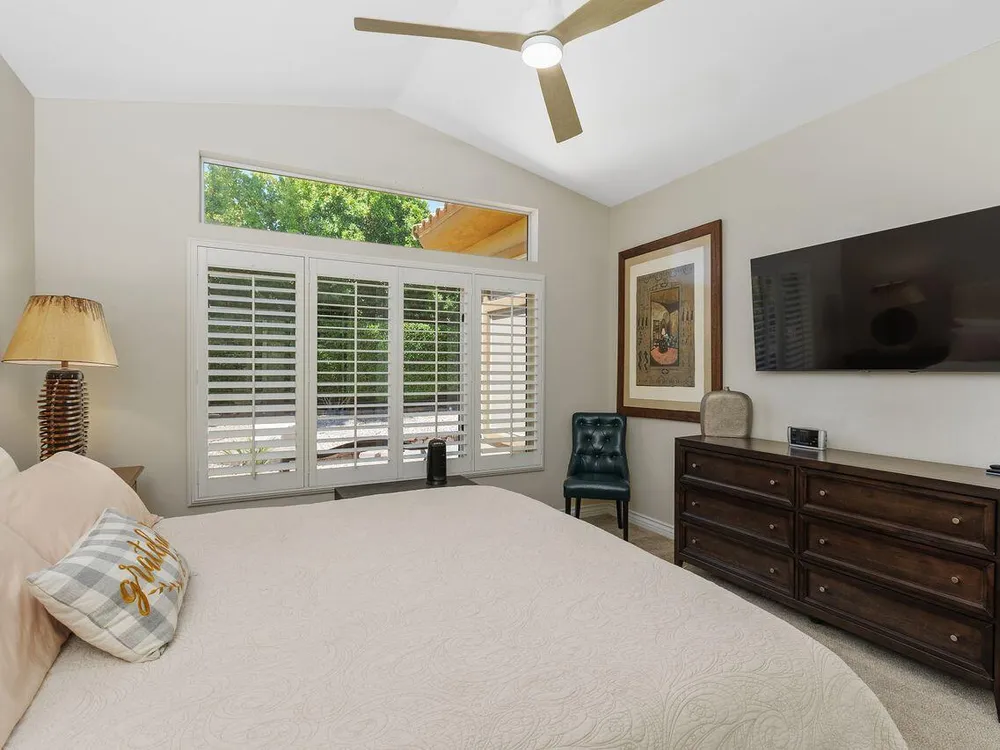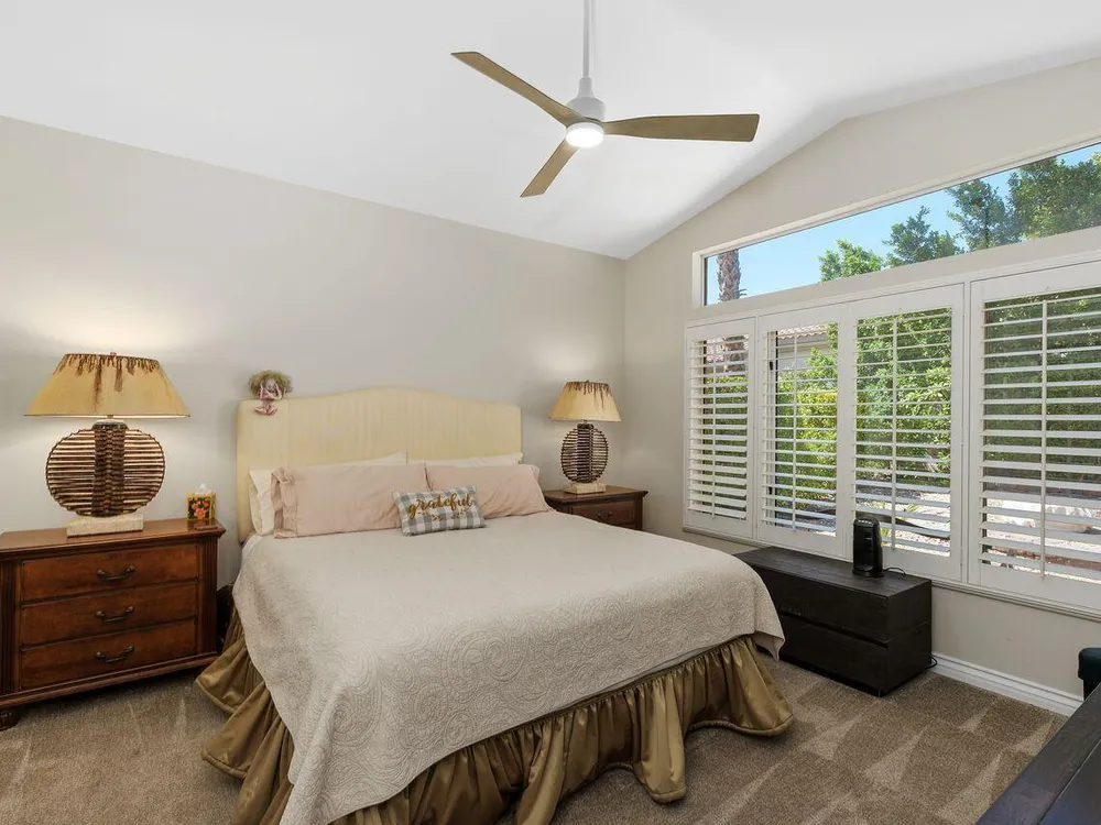 Sun City Palm Desert - Waterford Model | 55+ Community Ideally situated just a short walk from the Mountain View Clubhouse, this beautifully upgraded Waterford Model offers exceptional curb appeal and stylish desert living. Fresh exterior paint, low-maintenance desert landscaping, and interlocking pavers create a warm welcome, while the south-facing courtyard is perfect for enjoying sunny desert days. Step inside to a bright and inviting living room with sliding doors that lead to a spacious, fenced rear patio—ideal for entertaining or relaxing in privacy. The smart split-bedroom floor plan ensures extra privacy, with bedrooms and bathrooms located on opposite sides of the home. Elegant wood floors, plantation shutters, and quality window treatments are found throughout. The kitchen is a true highlight, featuring abundant counter space, upgraded cabinet doors, a gas range, newer stainless refrigerator, and upgraded countertops. The charming breakfast nook is surrounded by windows and opens to the patio, bringing the outdoors in. The primary suite includes a large walk-in closet, dual vanities, and a walk-in shower, offering comfort and convenience. An oversized indoor laundry room with a built-in desk provides a functional home office space, while the attached two-car garage features ample storage racks. Both bathrooms have been completely remodeled, and the kitchen has been tastefully upgraded. Offered fully furnished and turnkey, this home is move-in ready—just bring your toothbrush! A must-see opportunity to enjoy the best of Sun City Palm Desert living.