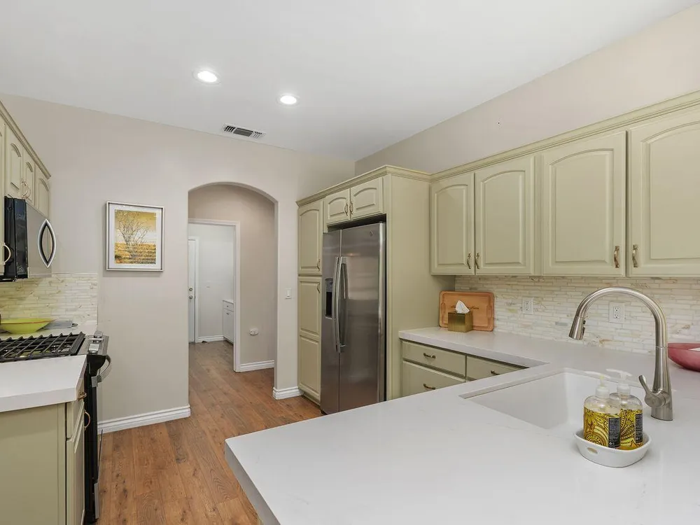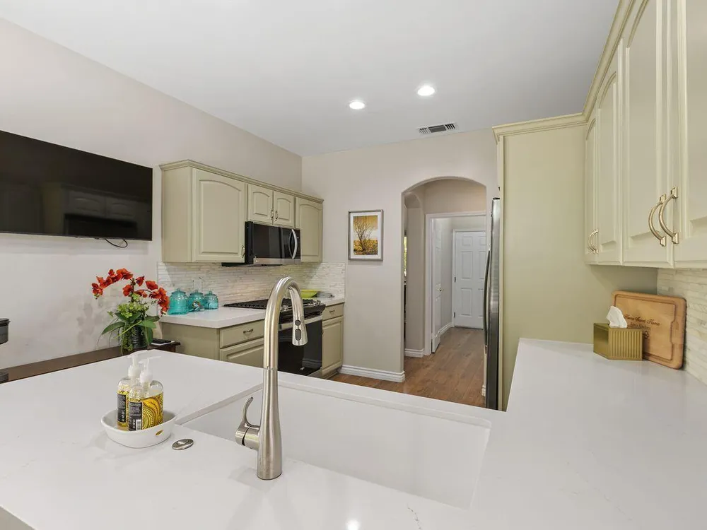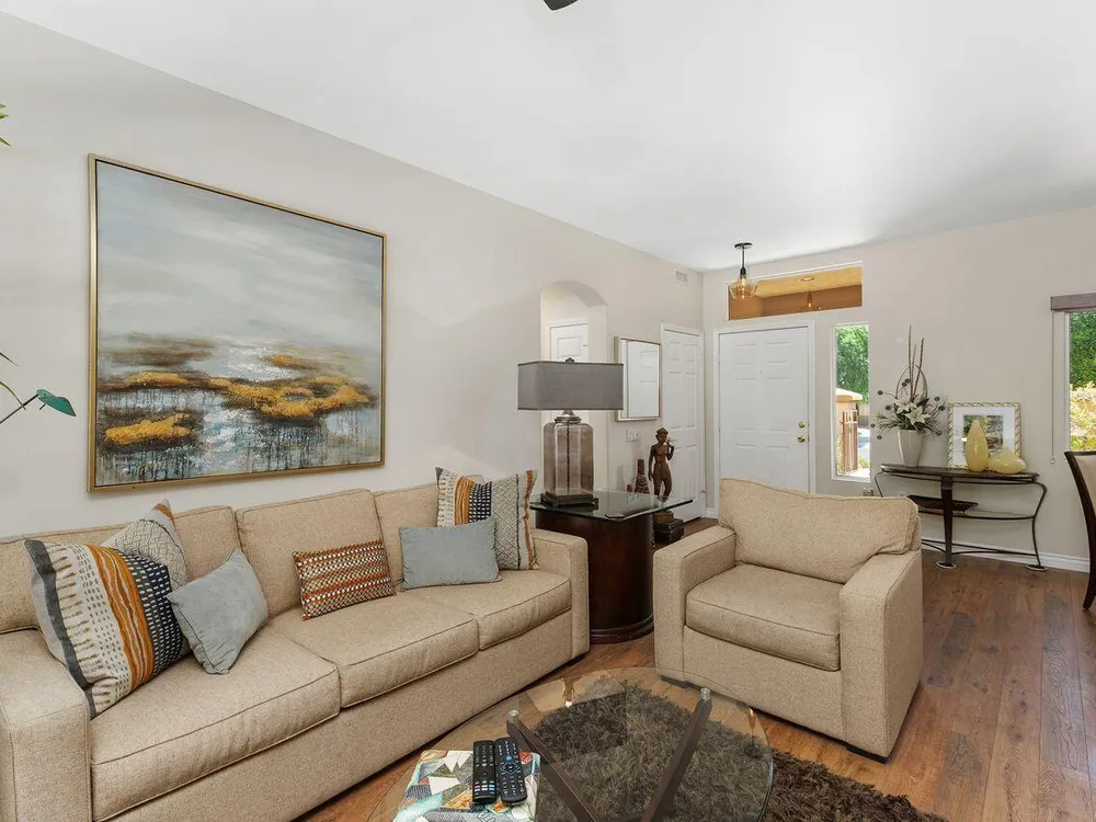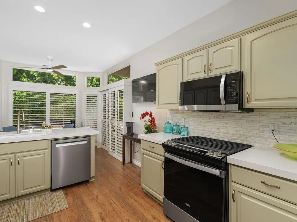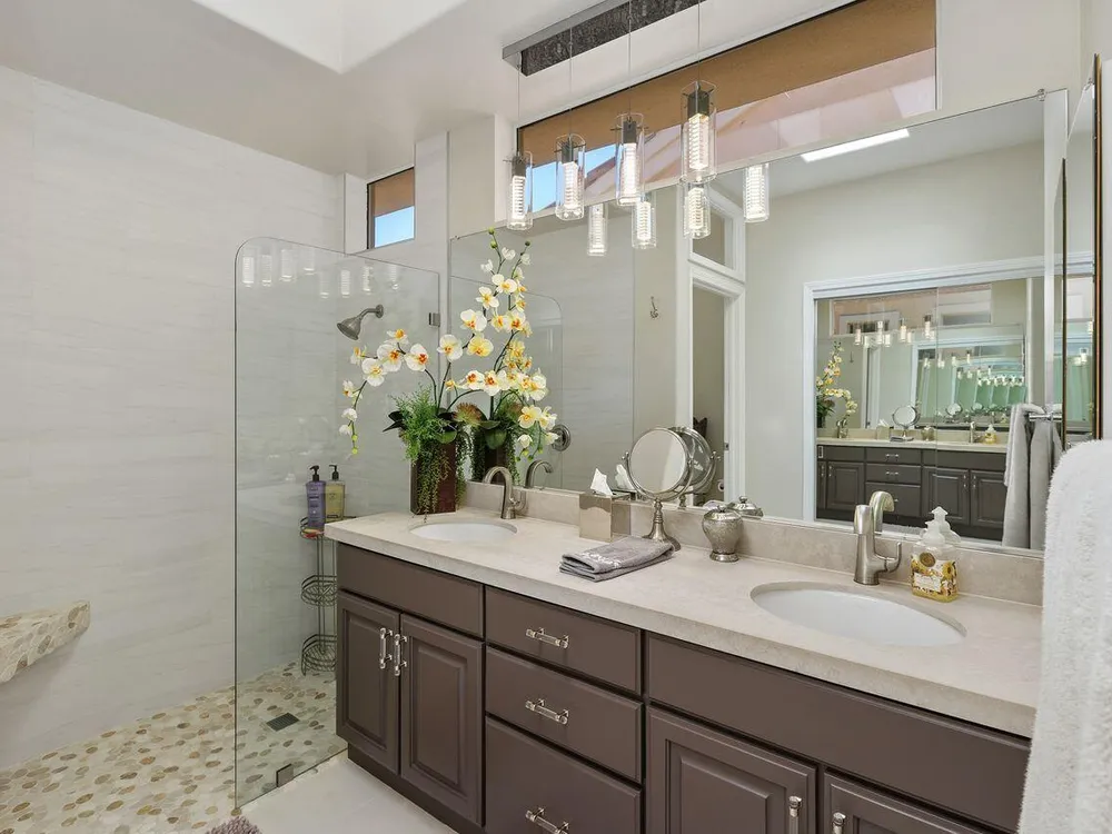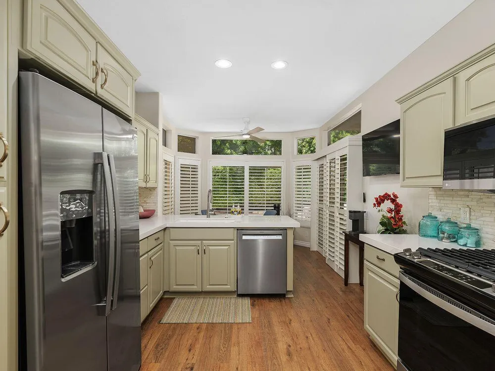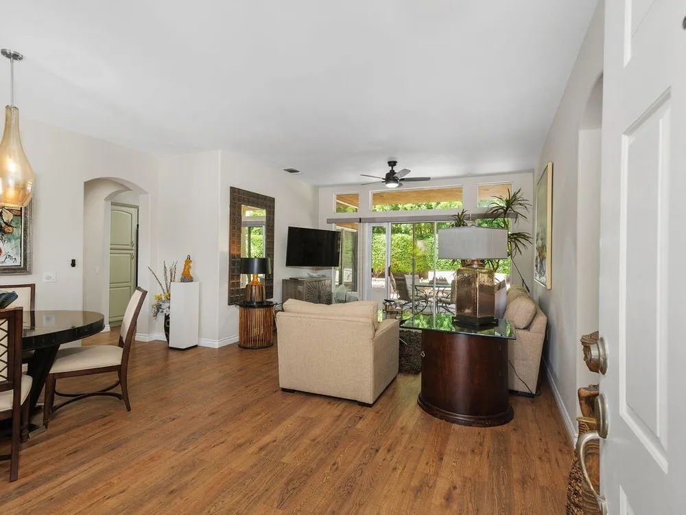 Sun City Palm Desert - Waterford Model | 55+ Community Ideally situated just a short walk from the Mountain View Clubhouse, this beautifully upgraded Waterford Model offers exceptional curb appeal and stylish desert living. Fresh exterior paint, low-maintenance desert landscaping, and interlocking pavers create a warm welcome, while the south-facing courtyard is perfect for enjoying sunny desert days. Step inside to a bright and inviting living room with sliding doors that lead to a spacious, fenced rear patio—ideal for entertaining or relaxing in privacy. The smart split-bedroom floor plan ensures extra privacy, with bedrooms and bathrooms located on opposite sides of the home. Elegant wood floors, plantation shutters, and quality window treatments are found throughout. The kitchen is a true highlight, featuring abundant counter space, upgraded cabinet doors, a gas range, newer stainless refrigerator, and upgraded countertops. The charming breakfast nook is surrounded by windows and opens to the patio, bringing the outdoors in. The primary suite includes a large walk-in closet, dual vanities, and a walk-in shower, offering comfort and convenience. An oversized indoor laundry room with a built-in desk provides a functional home office space, while the attached two-car garage features ample storage racks. Both bathrooms have been completely remodeled, and the kitchen has been tastefully upgraded. Offered fully furnished and turnkey, this home is move-in ready—just bring your toothbrush! A must-see opportunity to enjoy the best of Sun City Palm Desert living.