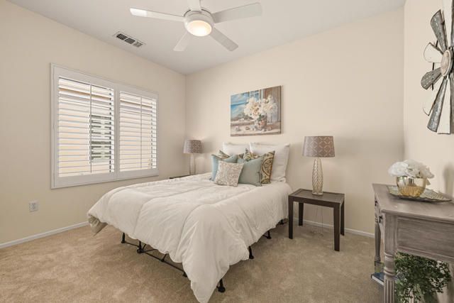 55+ Sun City Palm Desert--The ''Best Bang for your Buck'' active retirement community in the desert!!! This popular Newport model has great curb appeal and is ideally located near the Newcastle gate close to Starbucks and Stater Bros and within walking distance to the private pool/spa and BBQ area. This light and bright home features 2 bedrooms and 2 bathrooms, brand NEW desert-toned carpet, custom tile, plantation shutters, and HVAC in 2019. The spacious kitchen has newer appliances and a cozy breakfast nook. The great room has a slider to the rear patio and provides abundant light. The master suite offers a quiet retreat with bay window and fan w/light, bath has dual vanity, large stall shower, and walk in closet. The guest bedroom is on the opposite side of the home for maximum privacy and has a full bath with shower/tub combo. The 2 car garage is extended and spacious.The covered patio is extended, south facing and has lovely desert landscaping and flowers and is perfect for relaxing with a good book or entertaining for the holidays. Come enjoy all the wonderful amenities Sun City has to offer....3 outdoor pools and one indoor pool, state-of-the-art fitness center, 2 golf courses, 2 restaurants, post office, a wide array of clubs etc...'Buy Where you Love to Play...Sun City Palm Desert!'