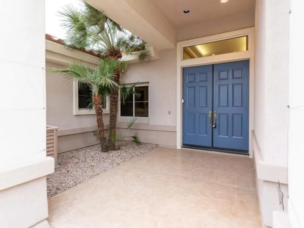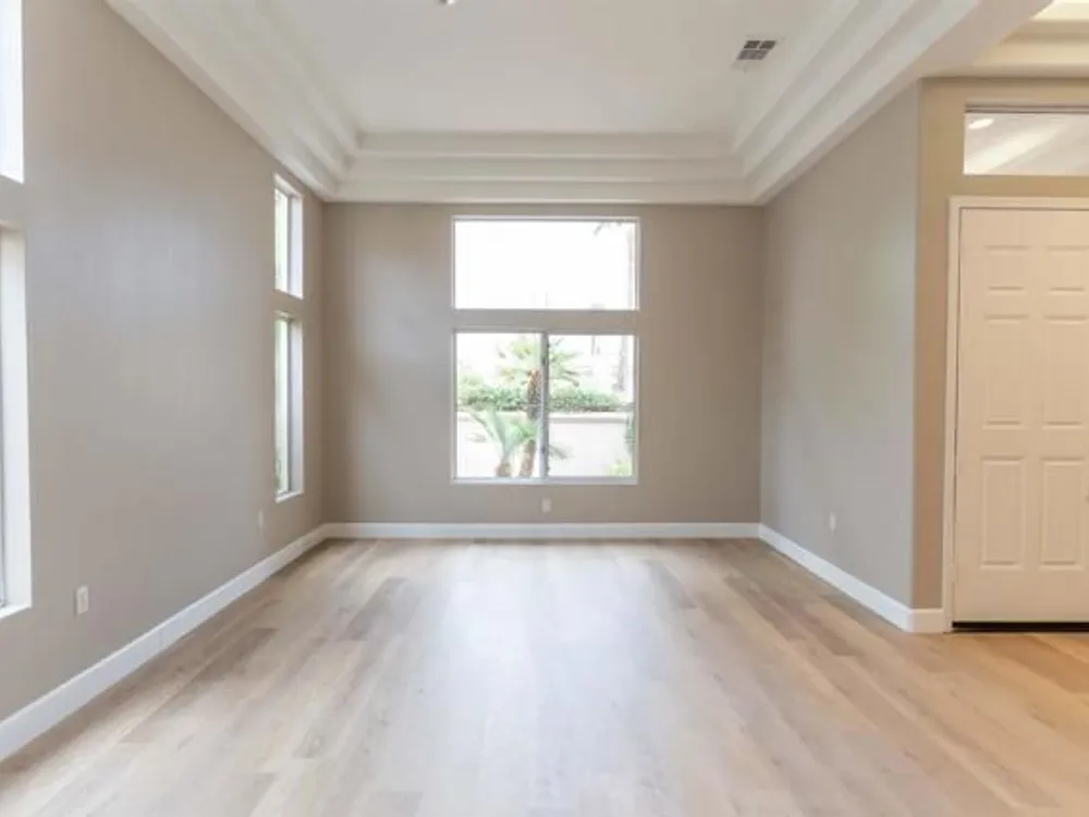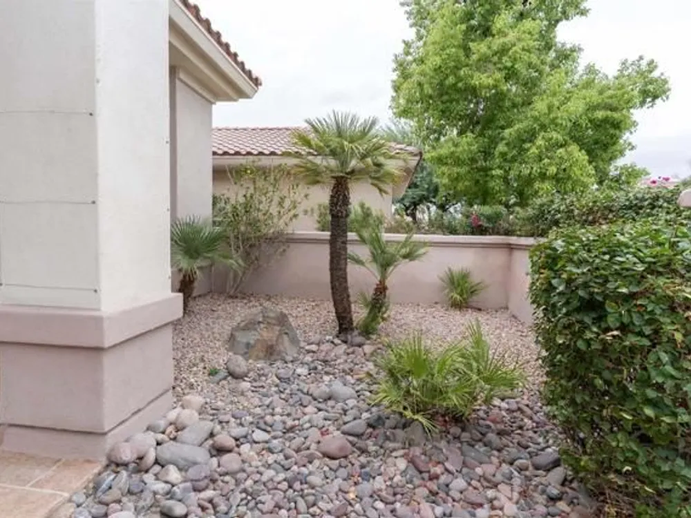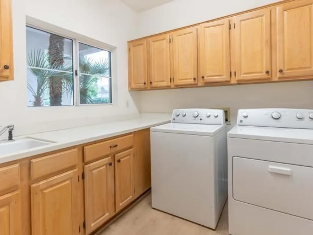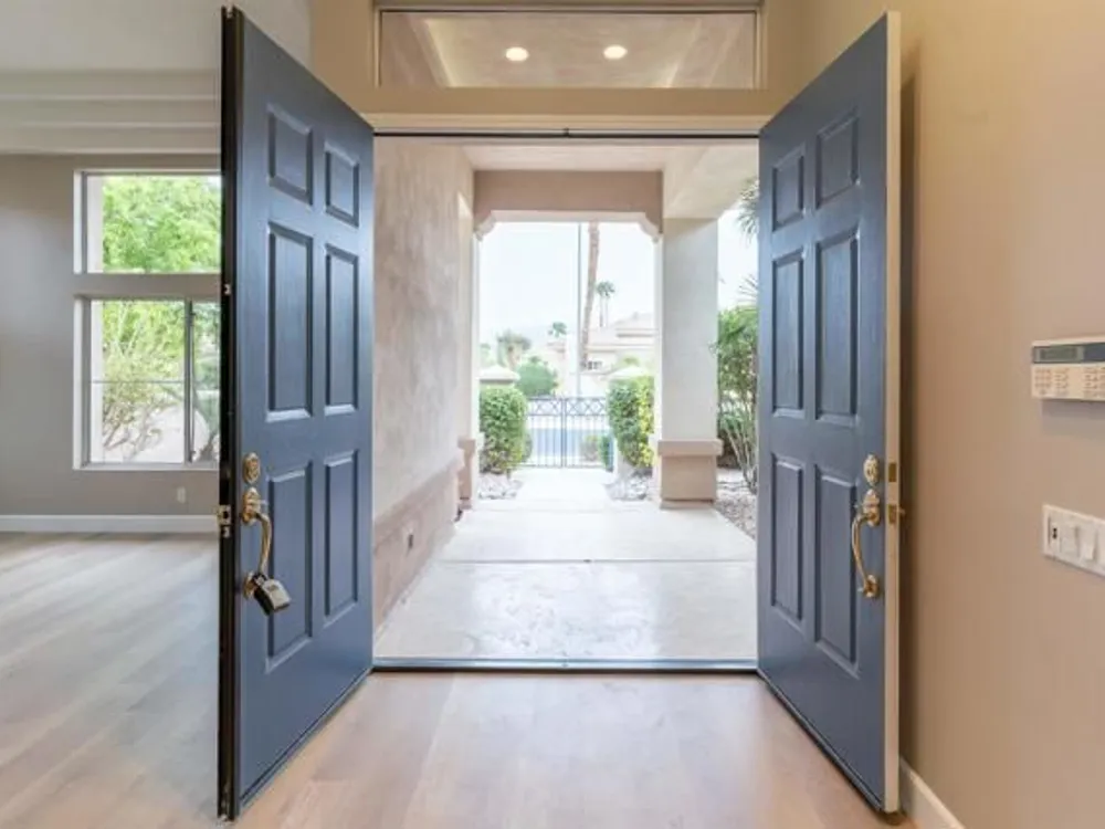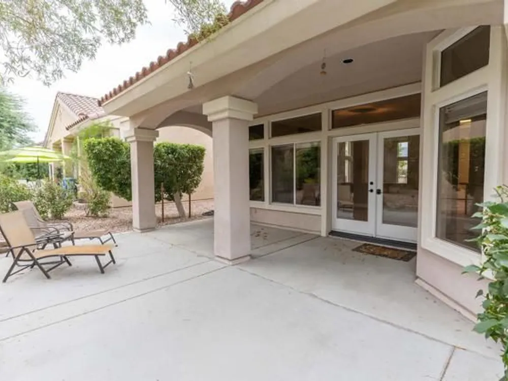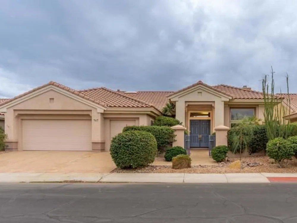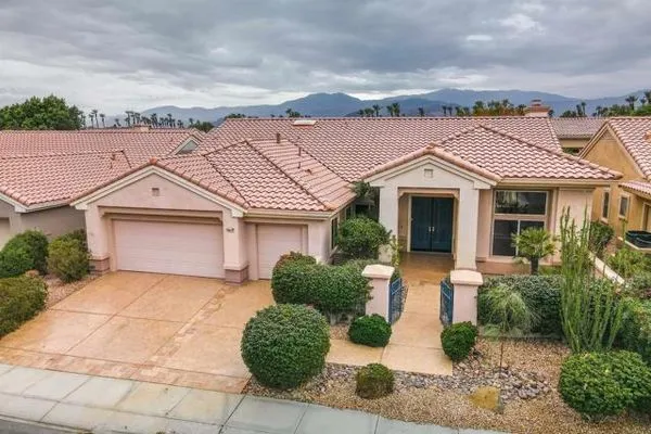 Sun City Palm Desert – Sought-after Marquis Estate Model with Solar. Just totally redone with new flooring, new paint, redone bathrooms, (plumbing in place for free-standing tub in master bath), new finished plumbing fixtures, and more! Conveniently situated near the Mountain View Clubhouse, which features indoor and outdoor pools, a fitness center, a driving range, a restaurant, and hobby rooms, this estate model home boasts a generously sized, south-facing rear yard with an extended patio, complemented by lush desert landscaping. Decorative concrete, a gated front courtyard, and a double-door entryway all contribute to the home's curb appeal. Leased solar with battery backup offers below-market electricity rates. The monthly average for electricity when the home was last occupied year-round was only $223. Upon entry, 12-foot coffered ceilings are in the great room and foyer (with/ uplighting). 10ft ceilings are elsewhere. The interior is freshly painted. A gas fireplace and built-in media center are in the family room with floor-to-ceiling custom tile on the fireplace wall. The kitchen features extensive raised-panel maple cabinetry, slab granite counters with a bullnose edge, and a smooth glass electric cooktop (also plumbed for gas). A den/office with new flooring is off the main hallway. A tower skylight precedes the double-door entry to the primary suite, which features a bay window, coffered ceiling, and a spacious walk-in closet. The primary suite bathroom also features a coffered ceiling, dual vanities with new countertops and sinks, a walk-in shower stall, and new tile surfaces. The spacious guest suite features a newly redone shower and tub in its bathroom. The laundry room features extensive built-in cabinetry and a utility sink. The 2+ golf cart garage has ample storage. Dual AC was new in 2018 and 2010. Don’t miss this beautiful, spacious home that is priced to sell!