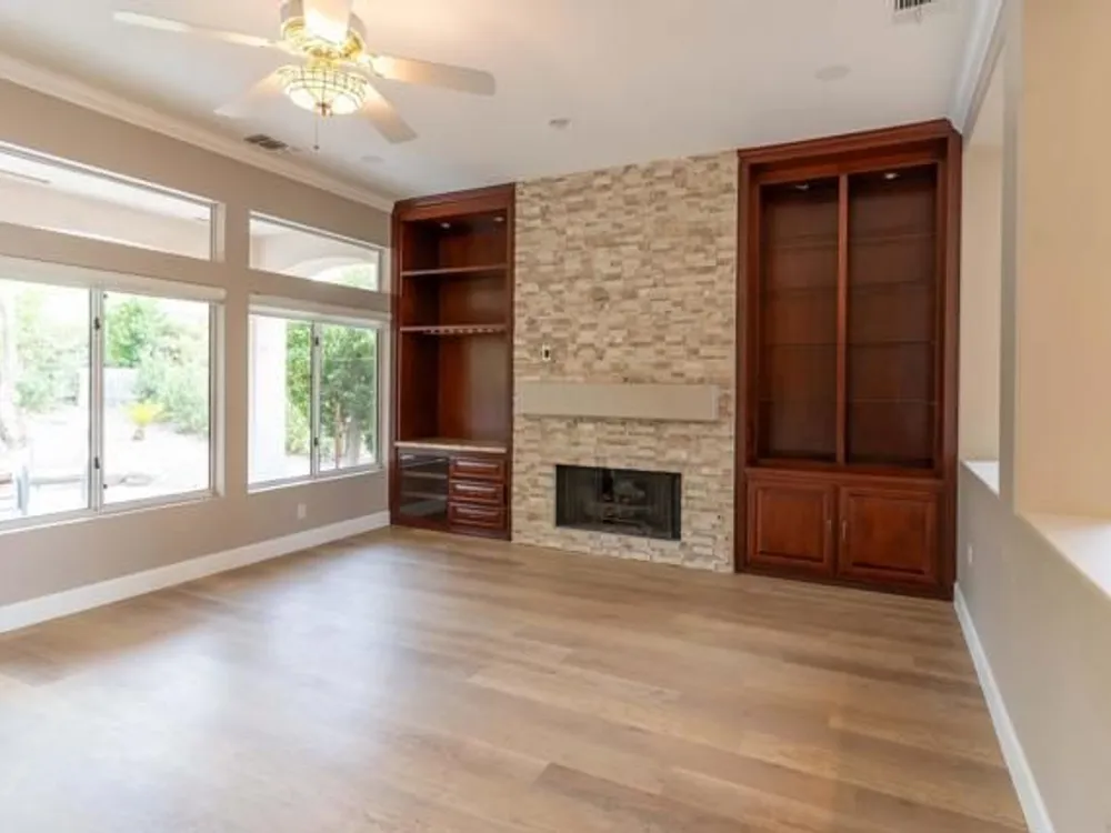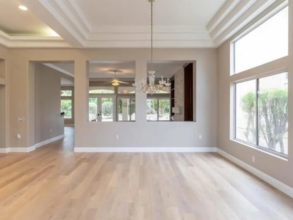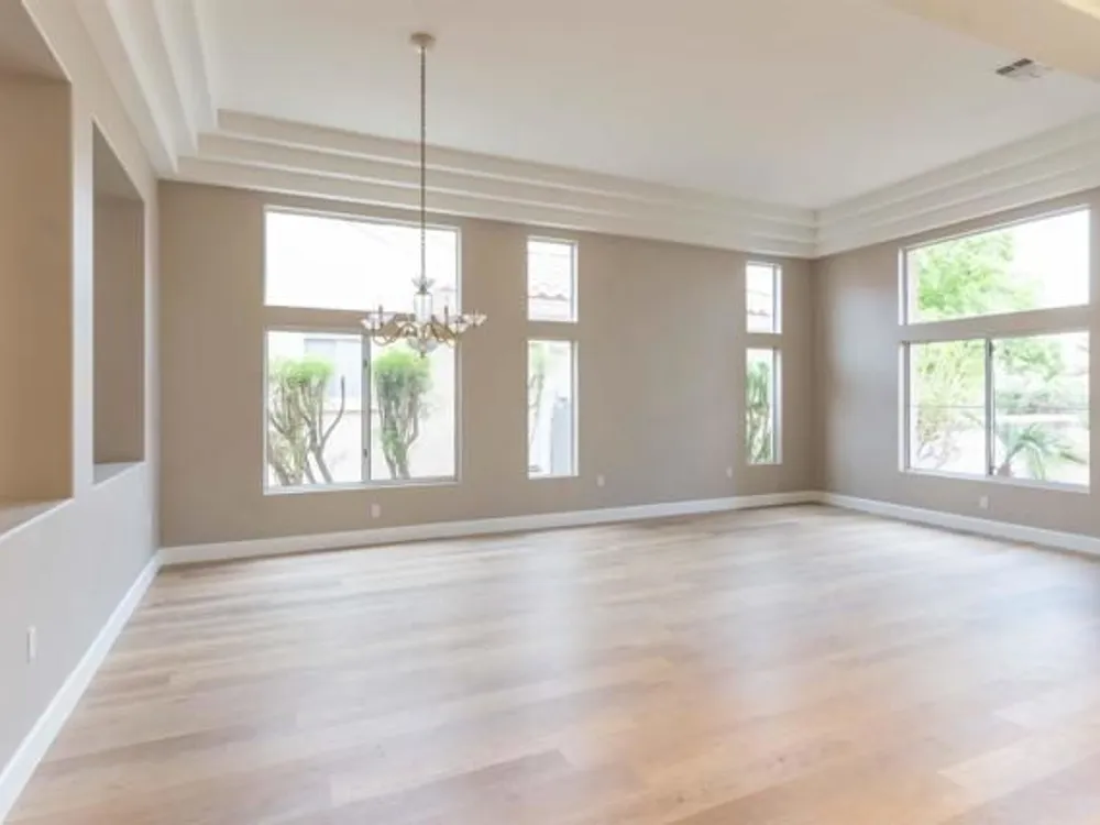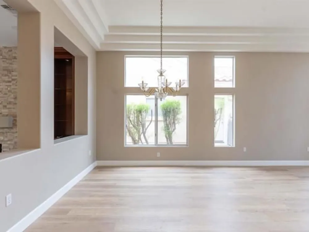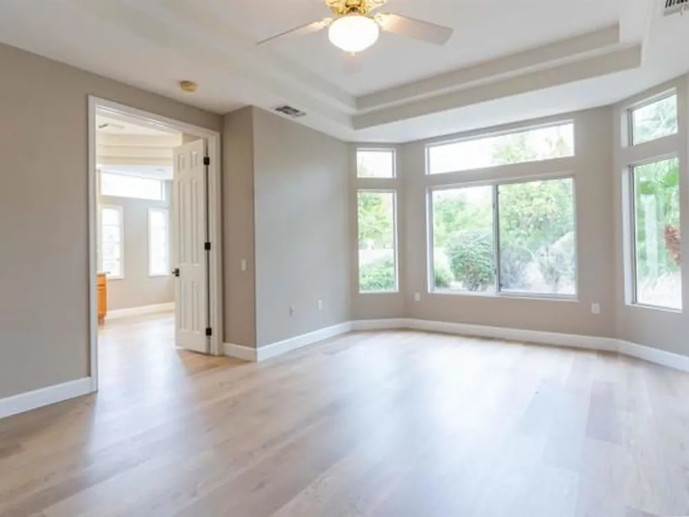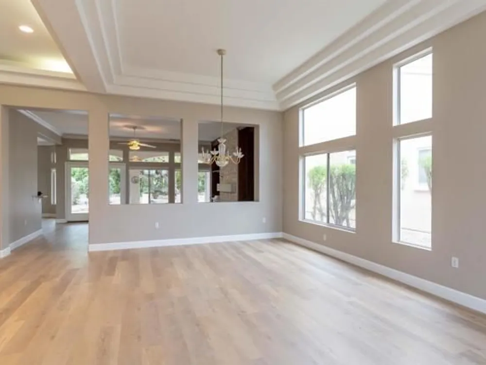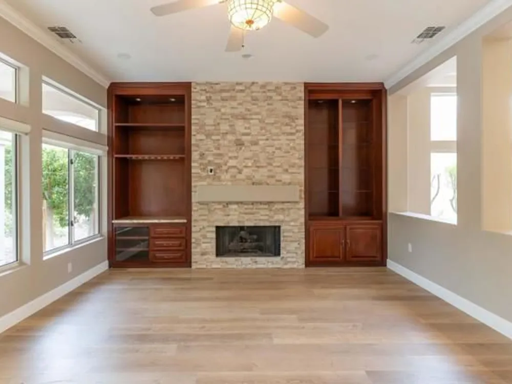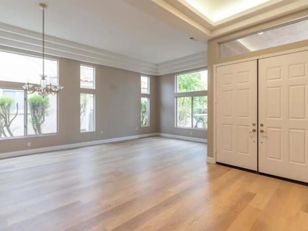 Sun City Palm Desert – Sought-after Marquis Estate Model with Solar. Just totally redone with new flooring, new paint, redone bathrooms, (plumbing in place for free-standing tub in master bath), new finished plumbing fixtures, and more! Conveniently situated near the Mountain View Clubhouse, which features indoor and outdoor pools, a fitness center, a driving range, a restaurant, and hobby rooms, this estate model home boasts a generously sized, south-facing rear yard with an extended patio, complemented by lush desert landscaping. Decorative concrete, a gated front courtyard, and a double-door entryway all contribute to the home's curb appeal. Leased solar with battery backup offers below-market electricity rates. The monthly average for electricity when the home was last occupied year-round was only $223. Upon entry, 12-foot coffered ceilings are in the great room and foyer (with/ uplighting). 10ft ceilings are elsewhere. The interior is freshly painted. A gas fireplace and built-in media center are in the family room with floor-to-ceiling custom tile on the fireplace wall. The kitchen features extensive raised-panel maple cabinetry, slab granite counters with a bullnose edge, and a smooth glass electric cooktop (also plumbed for gas). A den/office with new flooring is off the main hallway. A tower skylight precedes the double-door entry to the primary suite, which features a bay window, coffered ceiling, and a spacious walk-in closet. The primary suite bathroom also features a coffered ceiling, dual vanities with new countertops and sinks, a walk-in shower stall, and new tile surfaces. The spacious guest suite features a newly redone shower and tub in its bathroom. The laundry room features extensive built-in cabinetry and a utility sink. The 2+ golf cart garage has ample storage. Dual AC was new in 2018 and 2010. Don’t miss this beautiful, spacious home that is priced to sell!