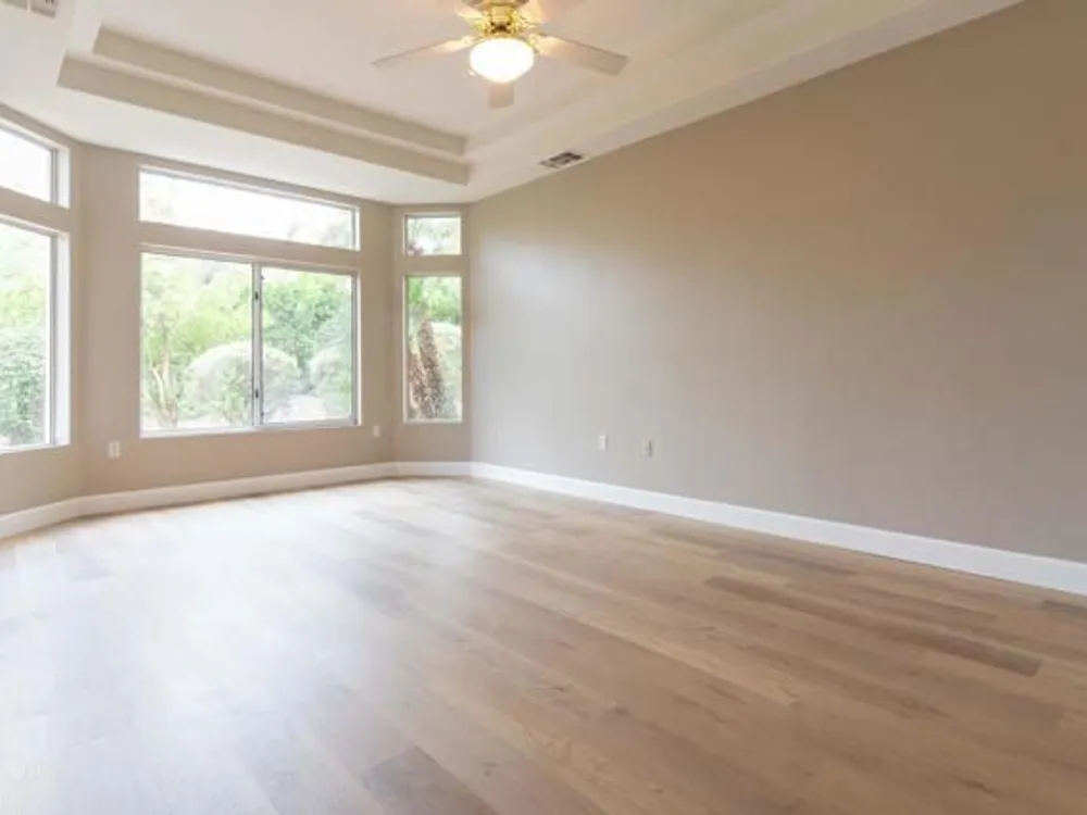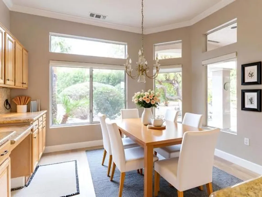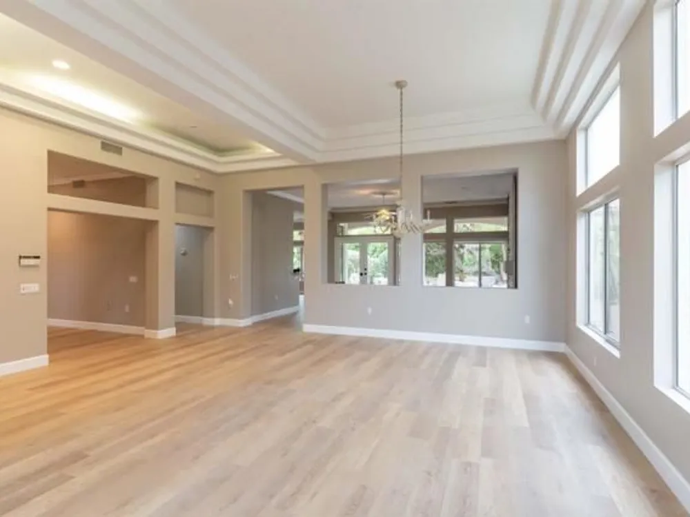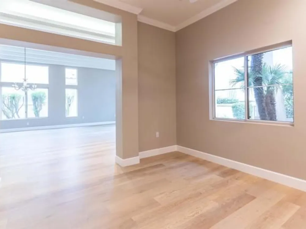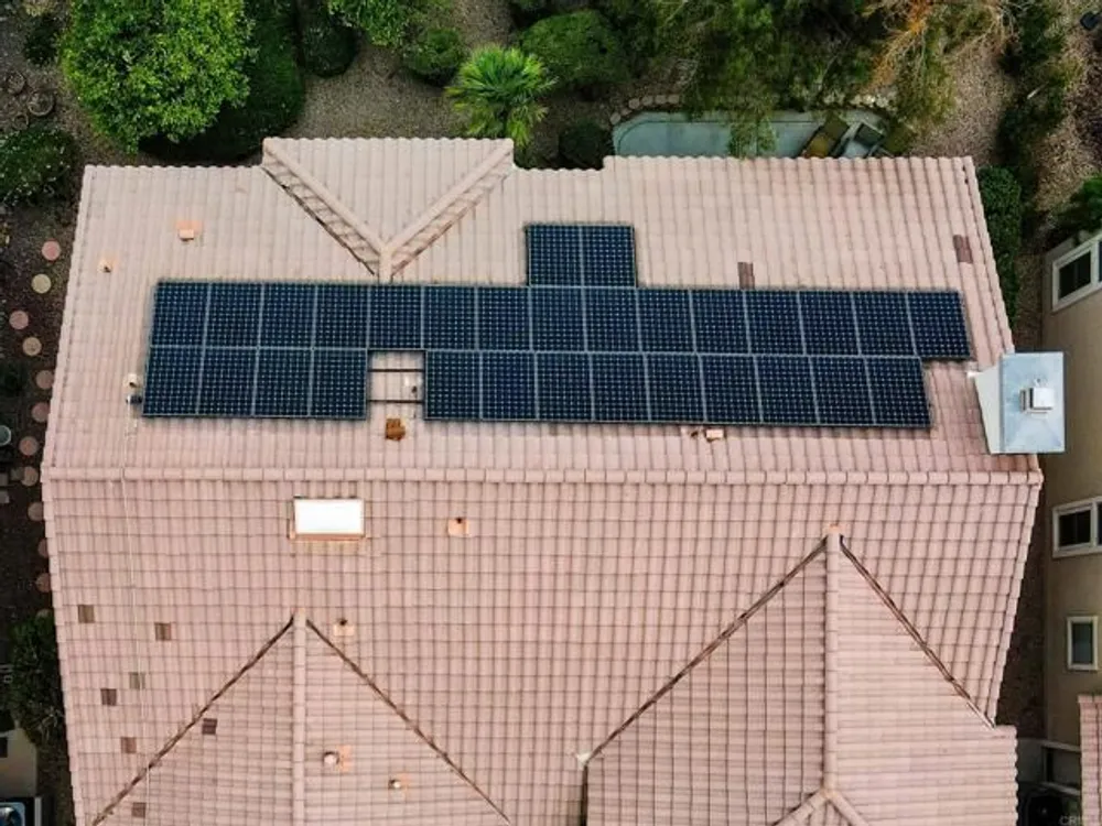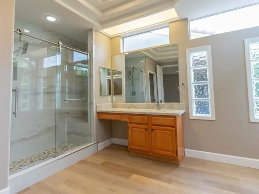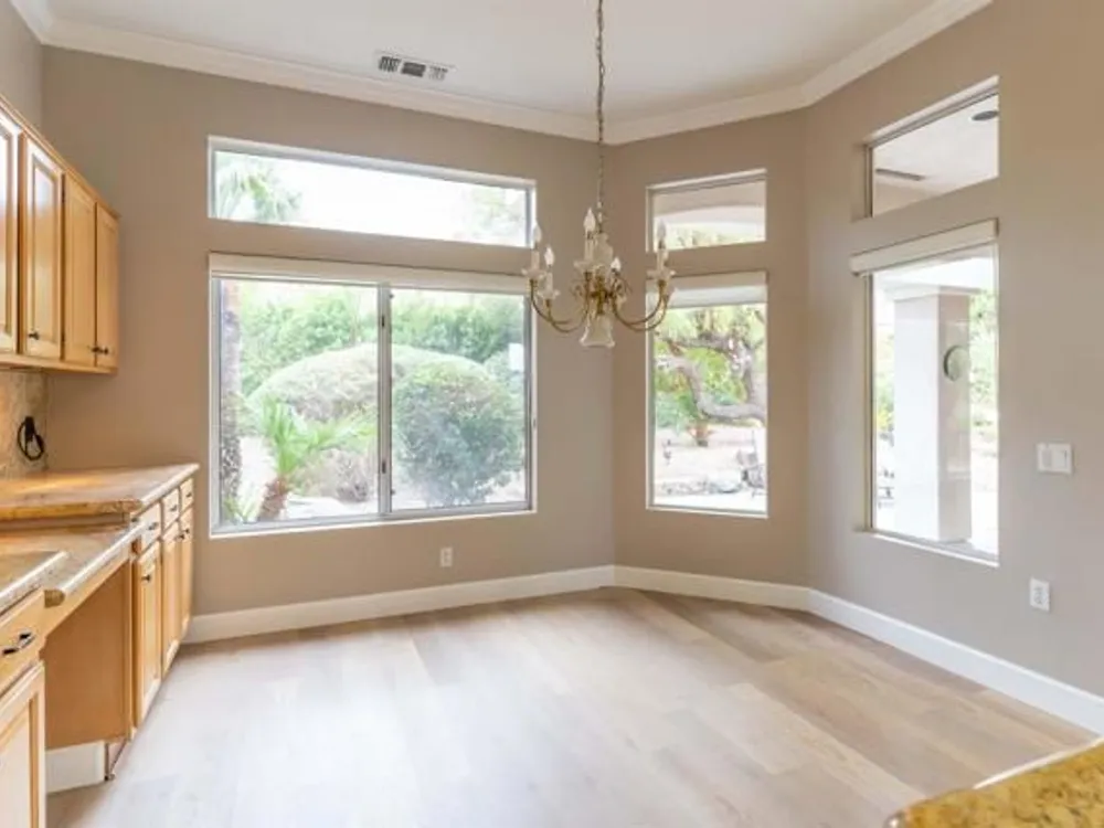 Sun City Palm Desert – Sought-after Marquis Estate Model with Solar. Just totally redone with new flooring, new paint, redone bathrooms, (plumbing in place for free-standing tub in master bath), new finished plumbing fixtures, and more! Conveniently situated near the Mountain View Clubhouse, which features indoor and outdoor pools, a fitness center, a driving range, a restaurant, and hobby rooms, this estate model home boasts a generously sized, south-facing rear yard with an extended patio, complemented by lush desert landscaping. Decorative concrete, a gated front courtyard, and a double-door entryway all contribute to the home's curb appeal. Leased solar with battery backup offers below-market electricity rates. The monthly average for electricity when the home was last occupied year-round was only $223. Upon entry, 12-foot coffered ceilings are in the great room and foyer (with/ uplighting). 10ft ceilings are elsewhere. The interior is freshly painted. A gas fireplace and built-in media center are in the family room with floor-to-ceiling custom tile on the fireplace wall. The kitchen features extensive raised-panel maple cabinetry, slab granite counters with a bullnose edge, and a smooth glass electric cooktop (also plumbed for gas). A den/office with new flooring is off the main hallway. A tower skylight precedes the double-door entry to the primary suite, which features a bay window, coffered ceiling, and a spacious walk-in closet. The primary suite bathroom also features a coffered ceiling, dual vanities with new countertops and sinks, a walk-in shower stall, and new tile surfaces. The spacious guest suite features a newly redone shower and tub in its bathroom. The laundry room features extensive built-in cabinetry and a utility sink. The 2+ golf cart garage has ample storage. Dual AC was new in 2018 and 2010. Don’t miss this beautiful, spacious home that is priced to sell!