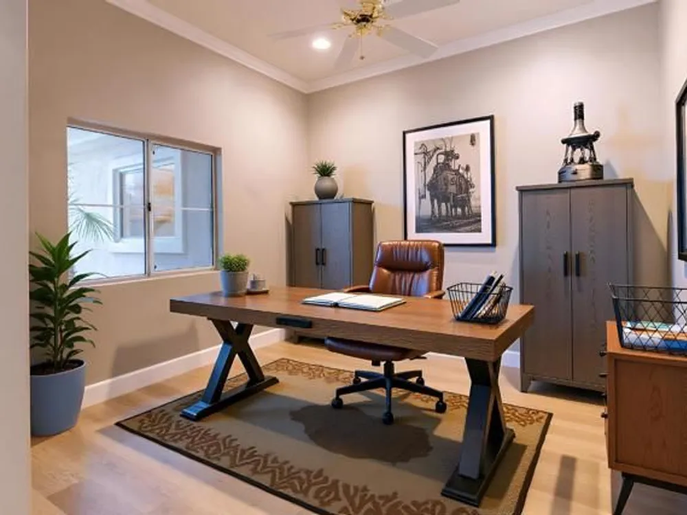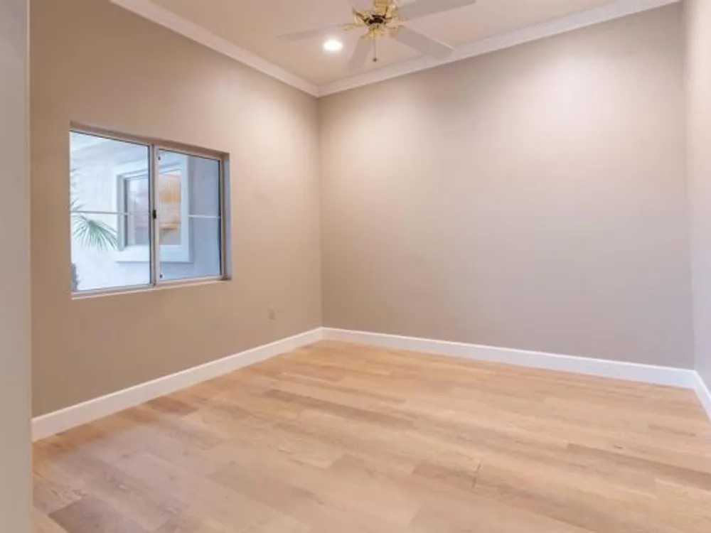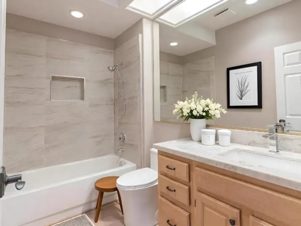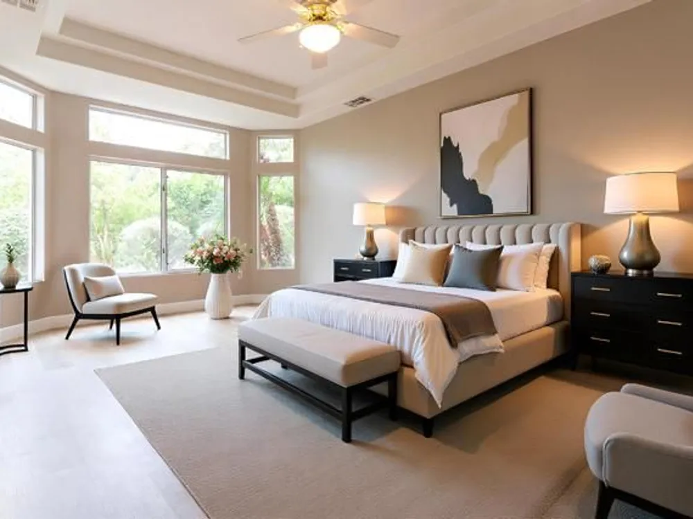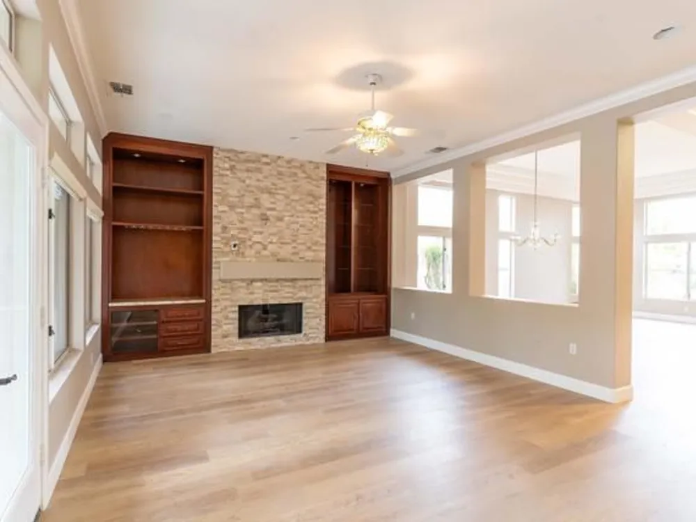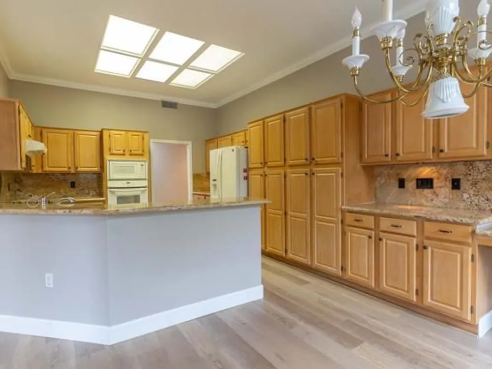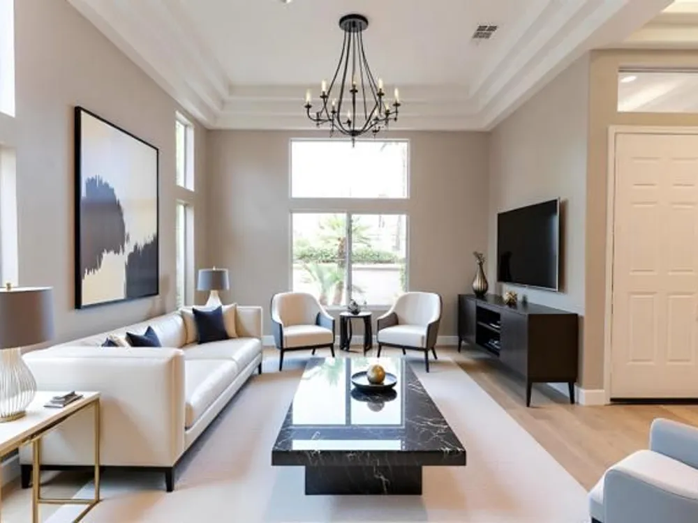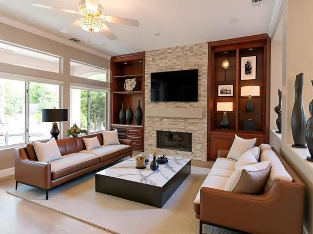 Sun City Palm Desert – Sought-after Marquis Estate Model with Solar. Just totally redone with new flooring, new paint, redone bathrooms, (plumbing in place for free-standing tub in master bath), new finished plumbing fixtures, and more! Conveniently situated near the Mountain View Clubhouse, which features indoor and outdoor pools, a fitness center, a driving range, a restaurant, and hobby rooms, this estate model home boasts a generously sized, south-facing rear yard with an extended patio, complemented by lush desert landscaping. Decorative concrete, a gated front courtyard, and a double-door entryway all contribute to the home's curb appeal. Leased solar with battery backup offers below-market electricity rates. The monthly average for electricity when the home was last occupied year-round was only $223. Upon entry, 12-foot coffered ceilings are in the great room and foyer (with/ uplighting). 10ft ceilings are elsewhere. The interior is freshly painted. A gas fireplace and built-in media center are in the family room with floor-to-ceiling custom tile on the fireplace wall. The kitchen features extensive raised-panel maple cabinetry, slab granite counters with a bullnose edge, and a smooth glass electric cooktop (also plumbed for gas). A den/office with new flooring is off the main hallway. A tower skylight precedes the double-door entry to the primary suite, which features a bay window, coffered ceiling, and a spacious walk-in closet. The primary suite bathroom also features a coffered ceiling, dual vanities with new countertops and sinks, a walk-in shower stall, and new tile surfaces. The spacious guest suite features a newly redone shower and tub in its bathroom. The laundry room features extensive built-in cabinetry and a utility sink. The 2+ golf cart garage has ample storage. Dual AC was new in 2018 and 2010. Don’t miss this beautiful, spacious home that is priced to sell!