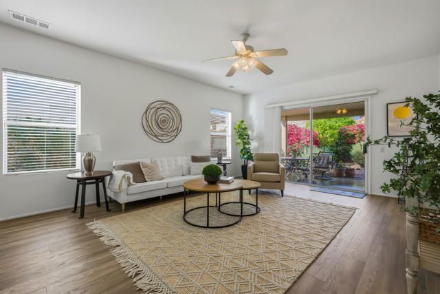 Per owner, 'Let's get this sold!' (See price improvement today to $370,000, 3rd lowest 2 bd/2ba in Sun City!) The recently upgraded easy-to-care-for wood-plank flooring lends a contemporary effect to the open floorplan, with a spacious great room adjacent to the kitchen. Sliding glass doors open to the covered patio to provide the indoor-outdoor lifestyle experience common to the desert. The kitchen has a Bosch dishwasher, a new Glacier Bay faucet, new Moen garbage disposal, and newly installed GE stainless steel refrigerator/freezer. Recent maintenance services include refurbishing of garage door mechanisms; new AC condenser and evaporator coil as of 2024; 2020 water heater updated to 2025 regulations; new water pressure valve. Fully warranted electrical, plumbing and AC systems through July, 2026. Light and bright, the great room, kitchen and hallway were freshly painted in fall, 2025. A small HOA fee covers the private pool and BBQ area steps away from the house, a destination place for fun neighborhood gatherings! Avoid the main gate traffic because the south gate is seconds away with easy access to shopping and freeway.Buyer to pay a $2,652.00 Reserve Replenishment fee, may be paid over 9 months.