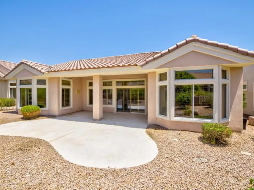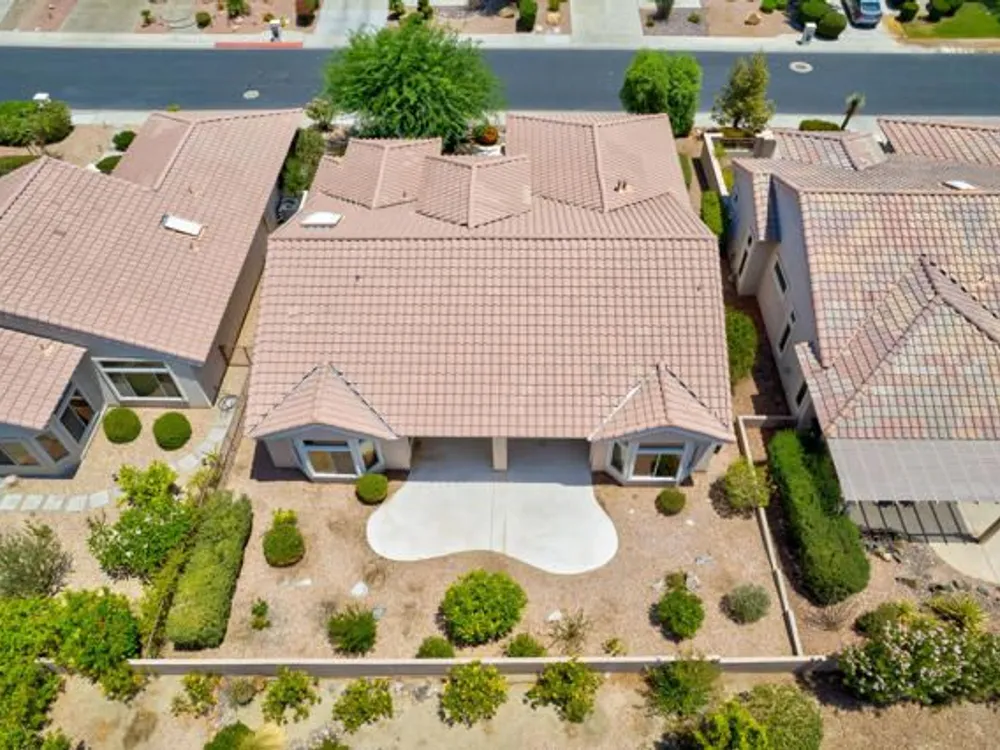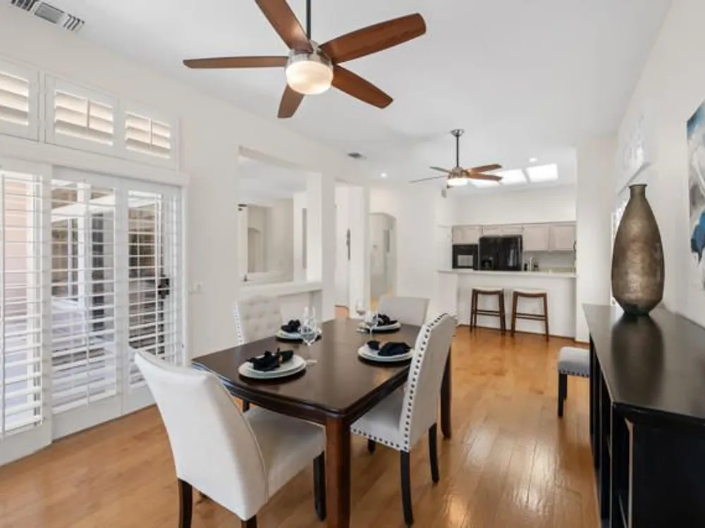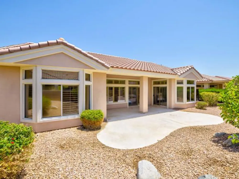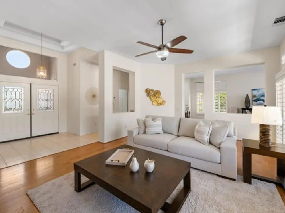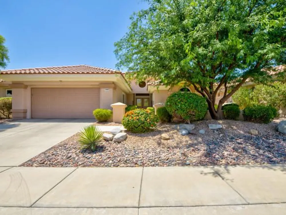 Beautiful! Move-in ready 2/2 1836 sqft in Sun City Palm. This Baccarat Model has all the unique Del Webb Architectural features that are sure to WOW your 1st impression beginning with Elegant Leaded Glass double door entry and high coffered ceilings, Archways, art niche's, art ledges and skylights to let in natural light. The open floor plan and its great bones will enhance your decorating skills. The kitchen has a seated bar, matching black appliances, electric built-in oven & cooktop, goose neck stainless faucet, abundant cabinets and a large pantry. Living and family room are simi adjoined making it great for entertaining. Both bedrooms are on opposing sides offering privacy for guests. Large primary suite has a seated bay window, storage cabinets, art niche' and is just off the large bath with dual vanities, soaking tub, private & separate step-in shower and a large walk-in closet, comfortably separated guest bedroom and bath. Enjoy newer upgrades like smooth finish Plantation Shutters, fresh interior paint, planked hard wood flooring, New HVAC system 2025 and all new matching lit ceiling fans in all rooms. The 2 car garage has epoxy floors, utility sink, laundry area and swamp cooler. Walk 2 blocks to Main Clubhouse with fitness center, pools, restaurants, tennis & pickleball.