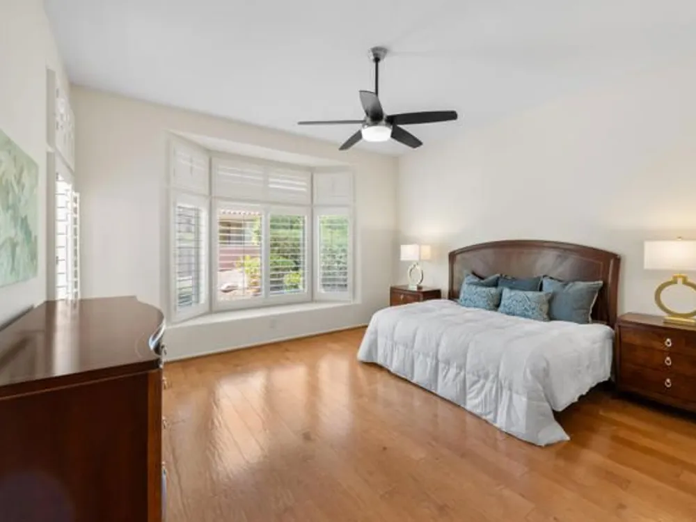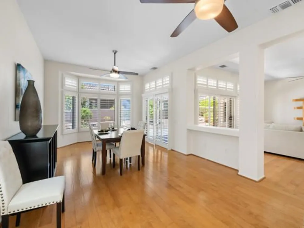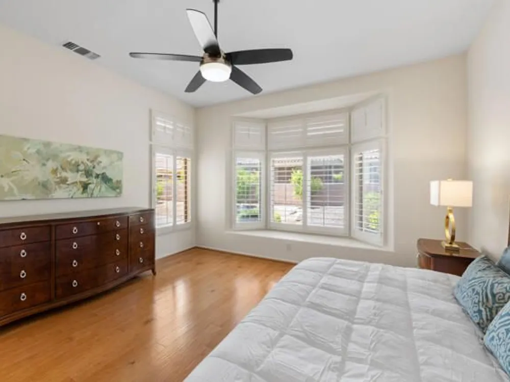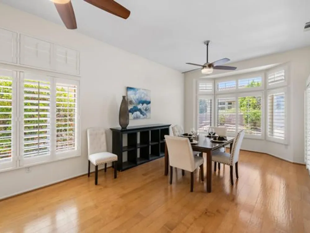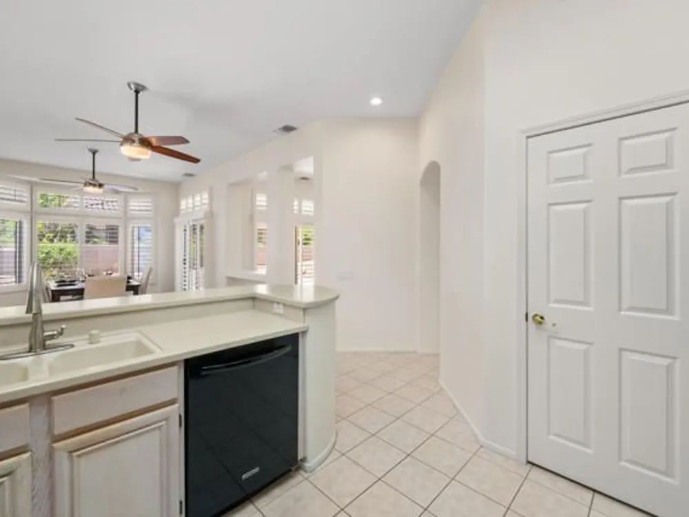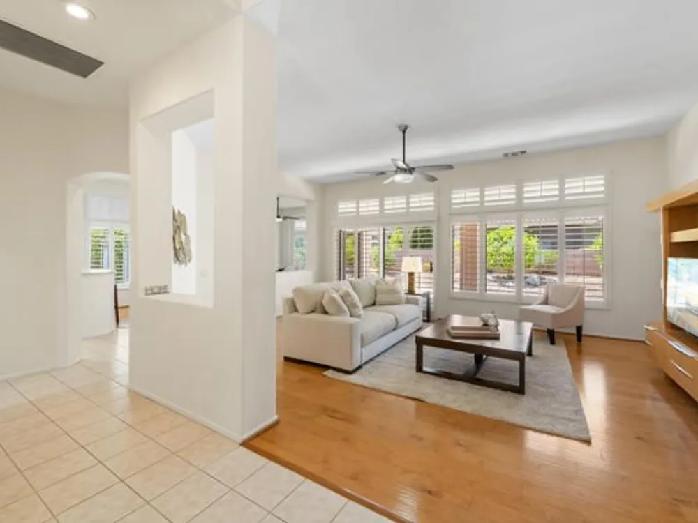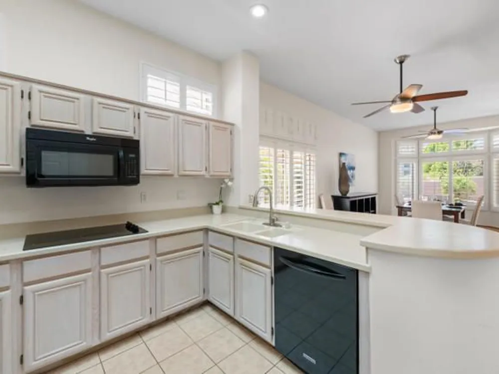 Beautiful! Move-in ready 2/2 1836 sqft in Sun City Palm. This Baccarat Model has all the unique Del Webb Architectural features that are sure to WOW your 1st impression beginning with Elegant Leaded Glass double door entry and high coffered ceilings, Archways, art niche's, art ledges and skylights to let in natural light. The open floor plan and its great bones will enhance your decorating skills. The kitchen has a seated bar, matching black appliances, electric built-in oven & cooktop, goose neck stainless faucet, abundant cabinets and a large pantry. Living and family room are simi adjoined making it great for entertaining. Both bedrooms are on opposing sides offering privacy for guests. Large primary suite has a seated bay window, storage cabinets, art niche' and is just off the large bath with dual vanities, soaking tub, private & separate step-in shower and a large walk-in closet, comfortably separated guest bedroom and bath. Enjoy newer upgrades like smooth finish Plantation Shutters, fresh interior paint, planked hard wood flooring, New HVAC system 2025 and all new matching lit ceiling fans in all rooms. The 2 car garage has epoxy floors, utility sink, laundry area and swamp cooler. Walk 2 blocks to Main Clubhouse with fitness center, pools, restaurants, tennis & pickleball.