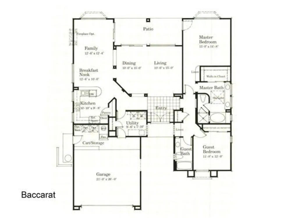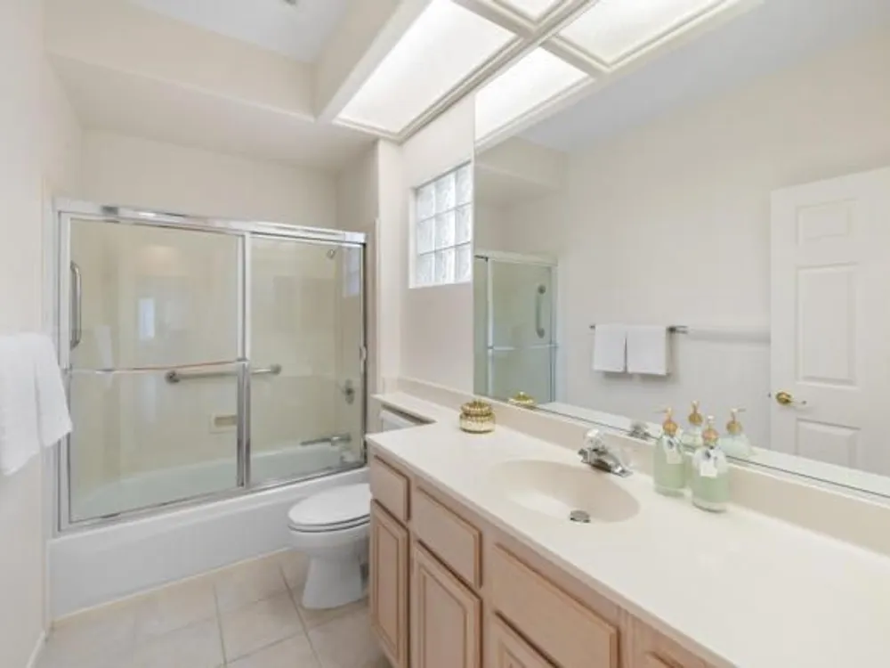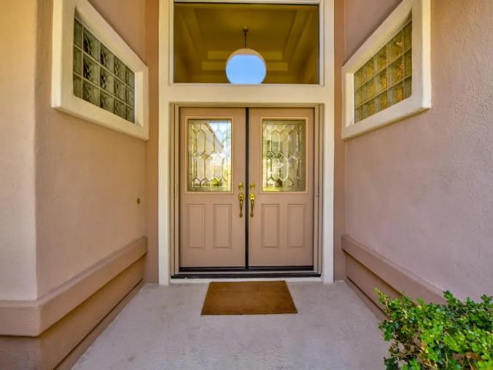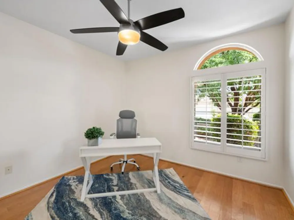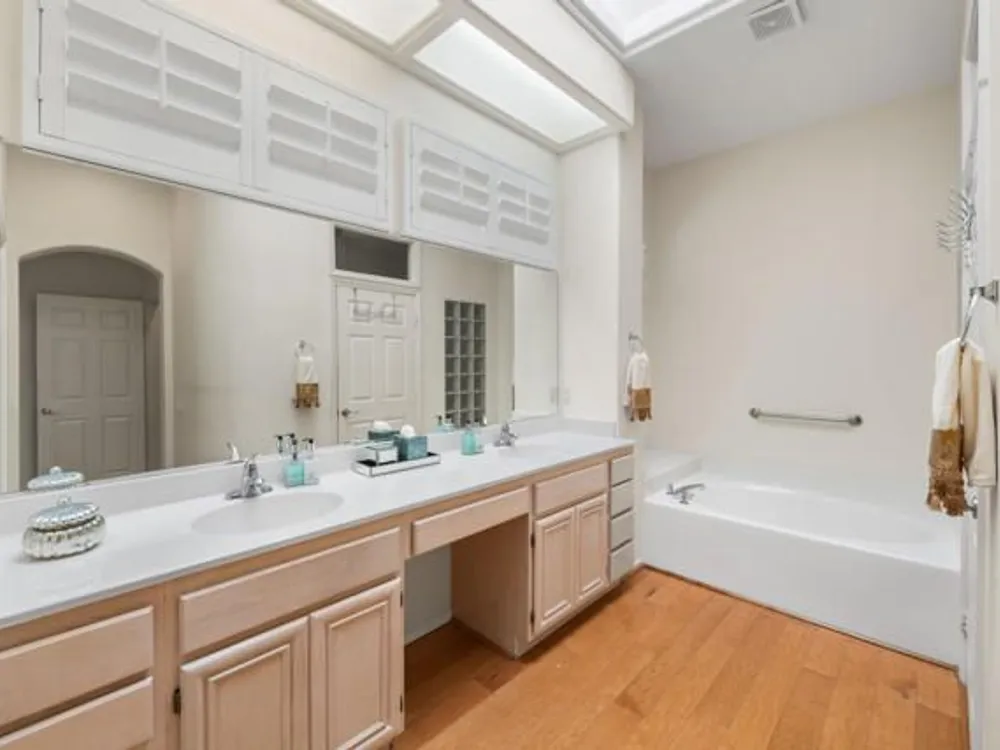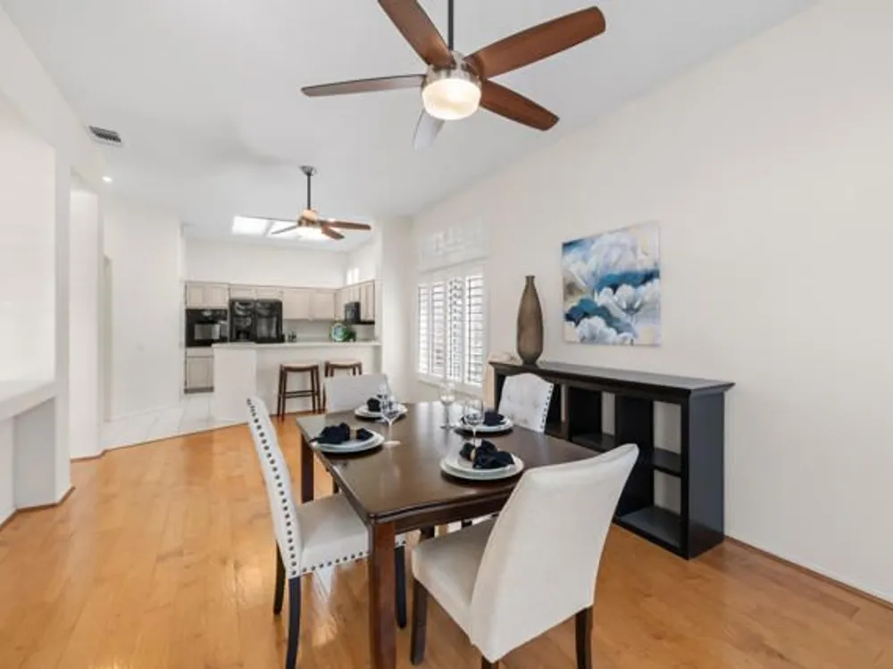 Beautiful! Move-in ready 2/2 1836 sqft in Sun City Palm. This Baccarat Model has all the unique Del Webb Architectural features that are sure to WOW your 1st impression beginning with Elegant Leaded Glass double door entry and high coffered ceilings, Archways, art niche's, art ledges and skylights to let in natural light. The open floor plan and its great bones will enhance your decorating skills. The kitchen has a seated bar, matching black appliances, electric built-in oven & cooktop, goose neck stainless faucet, abundant cabinets and a large pantry. Living and family room are simi adjoined making it great for entertaining. Both bedrooms are on opposing sides offering privacy for guests. Large primary suite has a seated bay window, storage cabinets, art niche' and is just off the large bath with dual vanities, soaking tub, private & separate step-in shower and a large walk-in closet, comfortably separated guest bedroom and bath. Enjoy newer upgrades like smooth finish Plantation Shutters, fresh interior paint, planked hard wood flooring, New HVAC system 2025 and all new matching lit ceiling fans in all rooms. The 2 car garage has epoxy floors, utility sink, laundry area and swamp cooler. Walk 2 blocks to Main Clubhouse with fitness center, pools, restaurants, tennis & pickleball.