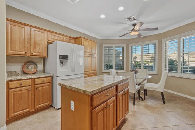 Sun City Palm Desert - St. Croix. This meticulously upgraded home was never occupied by the current owner, making it essentially new. The backyard is a private resort-style retreat, featuring a 2025 PebbleTec saltwater pool and spa, an extended paver patio, gentle rock water feature, and lush desert landscaping. Rooftop solar keeps energy costs low with a lease of only $180/month, and the owner has never paid additional for electricity since. The gated front courtyard and fresh, updated paint provide immediate curb appeal. All windows have been upgraded to vinyl. Inside, 18'' diagonal tile, crown molding, and custom shutters flow throughout the home. The greatroom is bright and inviting, with French doors opening to the backyard, a gas fireplace with tile surround, and a built-in media center. French doors off the greatroom lead to the den/office, which connects via a pocket door to the hobby/bonus room. The kitchen is a chef's dream, with slab granite counters, tile backsplash, breakfast bar with pendant lighting, under-cabinet lighting, and raised maple cabinets continuing into the bathrooms and laundry. The spacious primary suite features two large walk-in closets and a bay window. The luxurious primary bathroom boasts a custom tile stall shower with a frameless rain-glass enclosure, a granite-surfaced vanity with upgraded sinks, fixtures, mirror, and lighting. The guest bathroom is equally upgraded with a tub/shower combination. The laundry room offers built-in storage and a utility sink. The extended 2+ car garage includes space for a golf cart, built-in storage, hanging racks, and an epoxy floor. Additional upgrades include a new AC system installed in 2022. This home combines elegant finishes, modern upgrades, and a true resort-style backyard--an opportunity not to be missed!