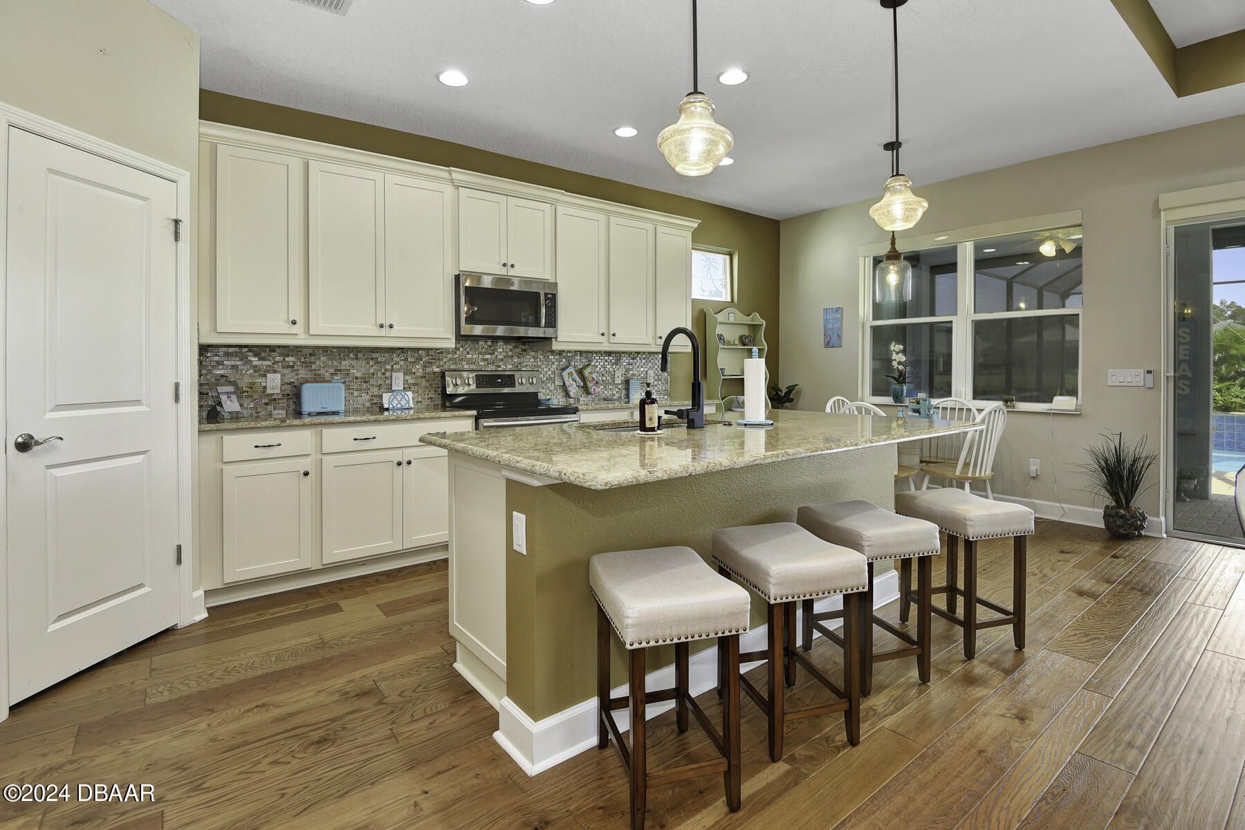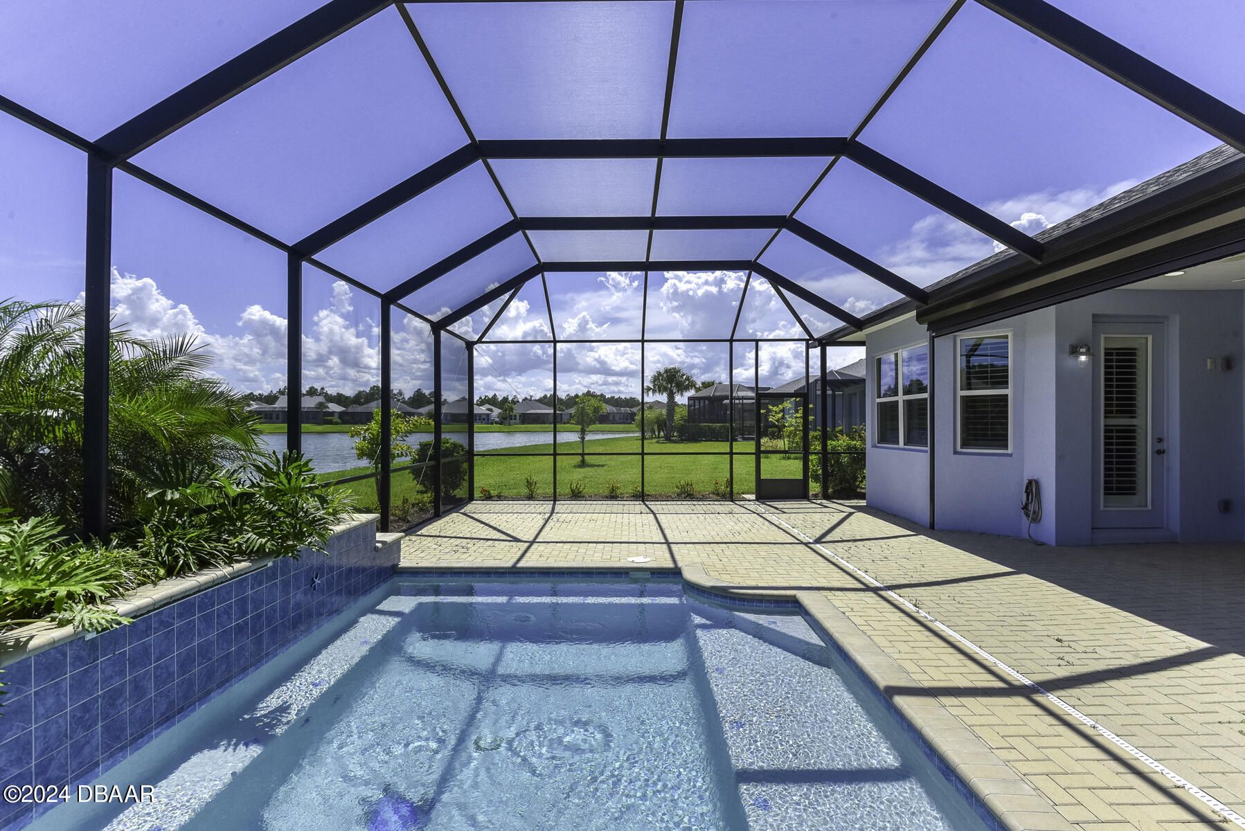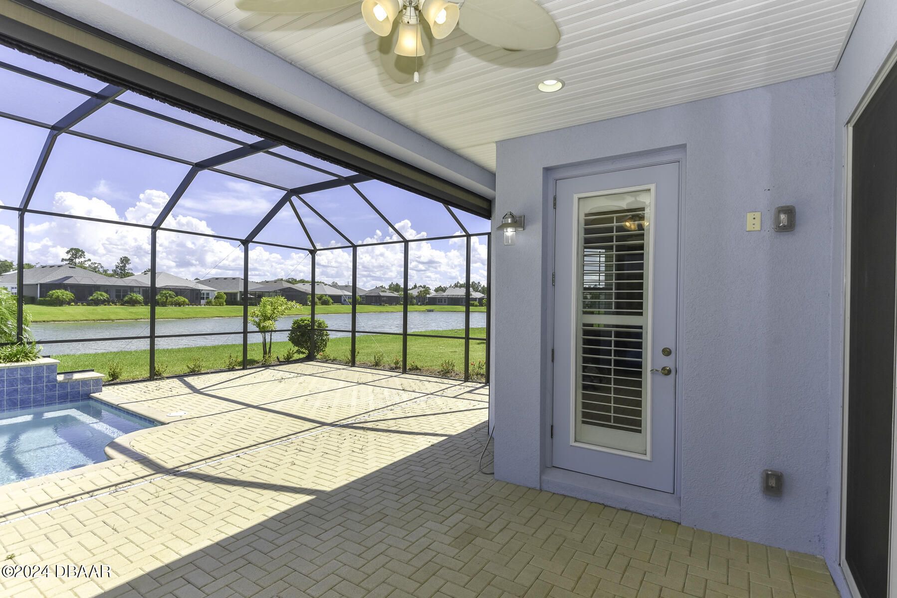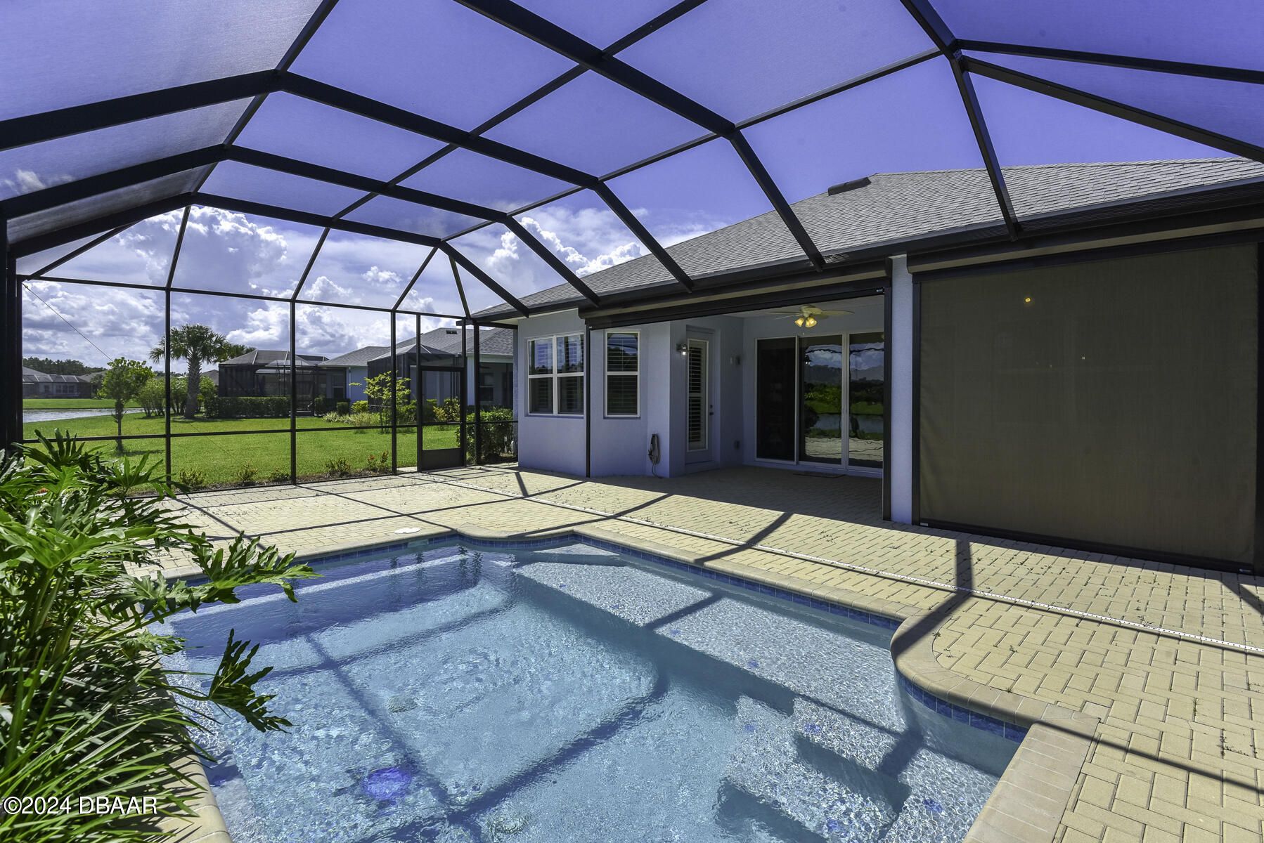 Welcome to this beautiful CABANA POOL HOME in Latitude Margaritaville! Enjoy the sunsets from the extended lanai overlooking the pool and sparkling pond. Hurricane blinds for security and peace of mind. This home has many upgraded features. Upgraded 42'' antique white kitchen cabinetry with crown molding. Quartz countertops in the kitchen and all bathrooms. Stunning backsplash with under cabinet lighting and a walk-in kitchen pantry. Beautiful engineered wood floors, carpet in bedrooms. Oversized Owner's Suite with 2 walk-in closets, custom built-ins and a door leading out to the lanai and pool. Laundry room has 42'' overhead cabinets and a cabinet with soaking sink. Plantation shutters and electric blinds throughout. Great amenities are a golf cart ride away, Paradise Pool, FIns Up Fitness Center, Wood Workshop, Bar & Chill Restaurant, Pickleball, Bocce Ball, Tennis, Clayground and more!