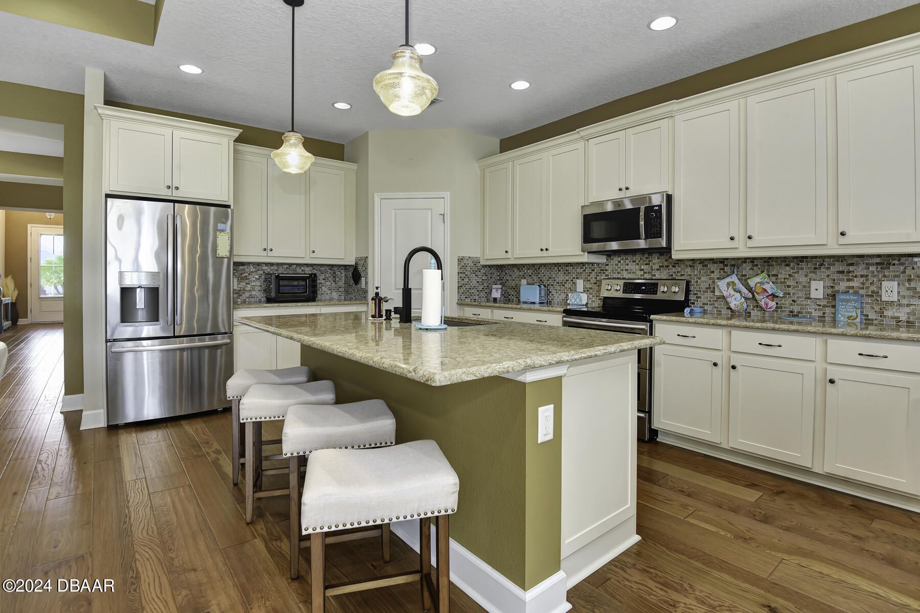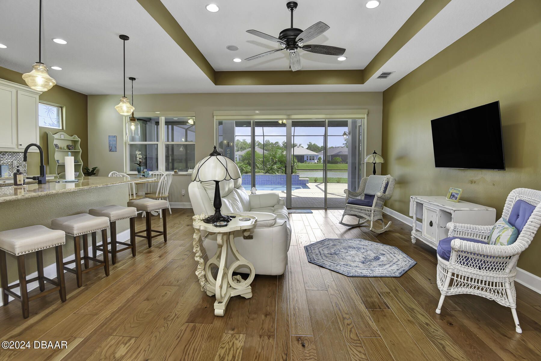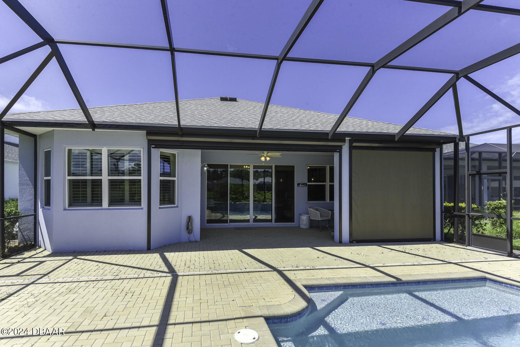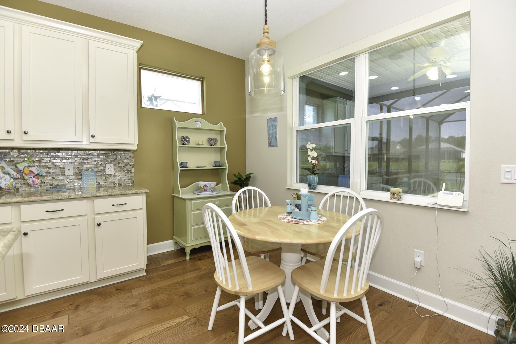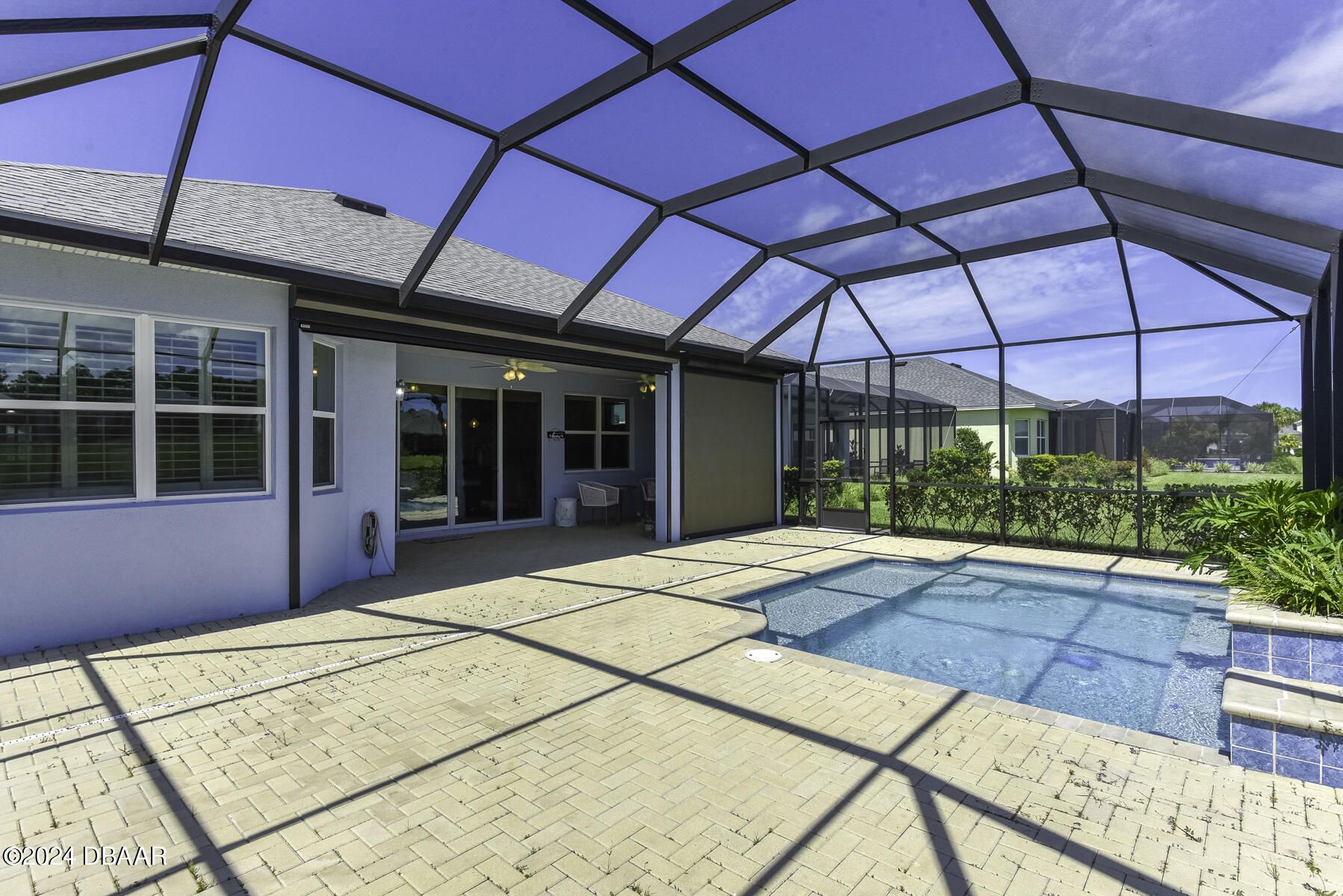Welcome to this beautiful CABANA POOL HOME in Latitude Margaritaville! Enjoy the sunsets from the extended lanai overlooking the pool and sparkling pond. Hurricane blinds for security and peace of mind. This home has many upgraded features. Upgraded 42'' antique white kitchen cabinetry with crown molding. Quartz countertops in the kitchen and all bathrooms. Stunning backsplash with under cabinet lighting and a walk-in kitchen pantry. Beautiful engineered wood floors, carpet in bedrooms. Oversized Owner's Suite with 2 walk-in closets, custom built-ins and a door leading out to the lanai and pool. Laundry room has 42'' overhead cabinets and a cabinet with soaking sink. Plantation shutters and electric blinds throughout. Great amenities are a golf cart ride away, Paradise Pool, FIns Up Fitness Center, Wood Workshop, Bar & Chill Restaurant, Pickleball, Bocce Ball, Tennis, Clayground and more!