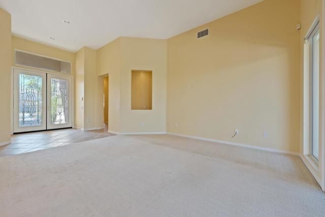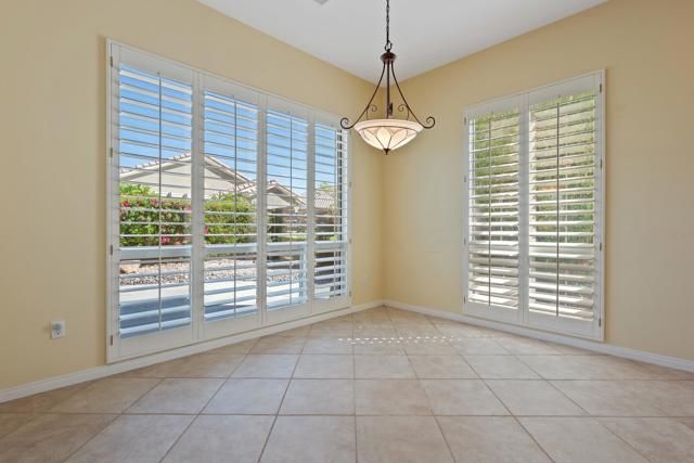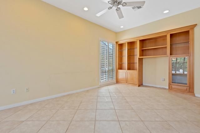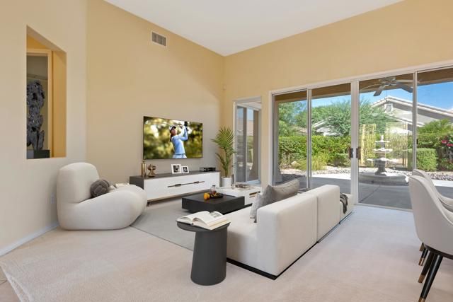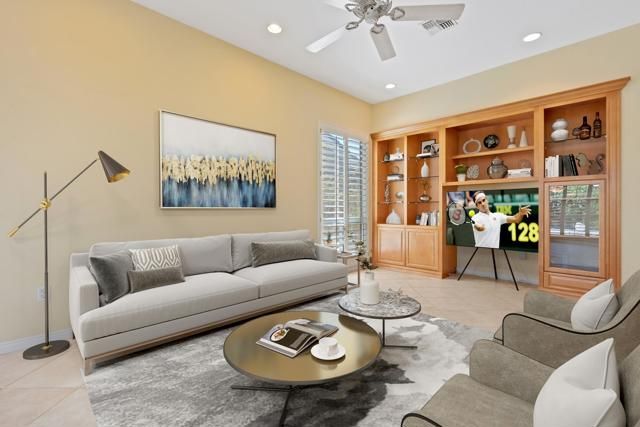 Sun City Palm Desert - Monaco. Ideally located in the heart of the development, this sought-after estate model offers generous indoor and outdoor living spaces designed for comfort and style. The north-facing backyard features an extended patio surrounded by lush desert landscaping and peekaboo mountain views--ideal for relaxing or entertaining. A gated front courtyard with leaded glass double doors adds impressive curb appeal. Inside, soaring 12-foot ceilings in the great room and 10-foot ceilings throughout create an open, airy feel. The great room boasts a double slider to the patio, while diagonally laid tile flooring and plantation shutters enhance the home's elegance. The family room includes a custom built-in media center and recessed lighting. The chef's kitchen offers a center island with breakfast bar, Corian counters with rounded edges, maple cabinetry, a large pantry, and a skylight for natural light. An extended primary suite features patio access, a spacious walk-in closet with built-ins, and a spa-like bath with dual sinks, an oversized soaking tub, and a glass-enclosed shower. Two private guest bedrooms provide comfort for visitors--one with an ensuite bath and built-ins, the other extended with direct access to the courtyard. The oversized laundry room includes abundant cabinetry, a utility sink, and space for a second refrigerator. The extended 2-car plus golf cart garage is equipped with built-in storage and a utility sink. Additional highlights include dual-zone AC (one unit new in 2018, the other in 2014).