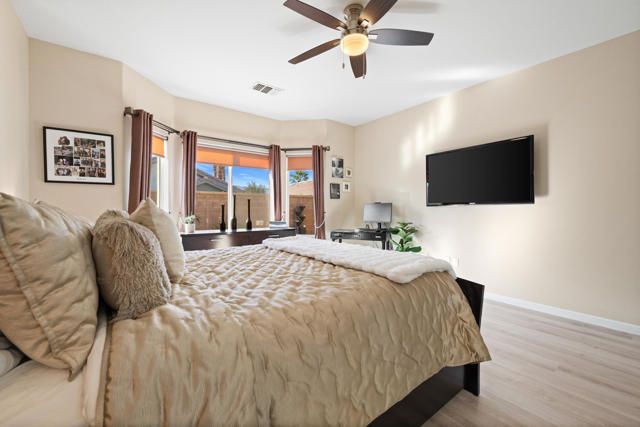 55+ Sun City Palm Desert--Del Webb's ''Best Bang for your Buck'' Active lifestyle retirement community in the whole Coachella Valley and beyond. This fabulous Great room Newport model with 2 bedrooms and 2 full bathrooms sits at the end of a quiet cul-de-sac in the newest section of Sun City, the ''California Casuals'' neighborhood featuring access to a fabulous enclosed semi-private saltwater pool/spa with bathrooms, showers and a BBQ patio. The curb appeal is special showing off mature easy maintenance desert landscaping. Inside, beautiful upgraded wood-look laminate flooring throughout. The open kitchen features quartz counters, new sink and faucet, painted cabinets, upgraded stainless appliances, gas cooktop and breakfast nook. The living room is light and bright, has updated fan, roll down blinds, sliding door to patio. The master bedroom has a bay window with views of the backyard, roll down ''black out'' drapes, upgraded fan. The bath has quartz counter, new sink, painted cabinets, upgraded lighting, new toilet, spacious walk-in closet. The guest bedroom is on the opposite side of the home for extra privacy with fan/light, and roll down ''black out'' drapes and is adjacent to the full bathroom with quartz counter, upgraded faucet, and shower/tub combo. The 2-car garage has washer and dryer and new garage opener. The gorgeous south-facing patio has been extended with custom brick pavers, mounted TV, peek-a-boo mountain views. Enjoy the tranquil sounds of the serene fountain as the focal point of your backyard oasis and is perfect for both relaxing and entertaining for the holidays. This home has been meticulously maintained and it shows! ''Buy Where you Love to Play...Sun City Palm Desert.''