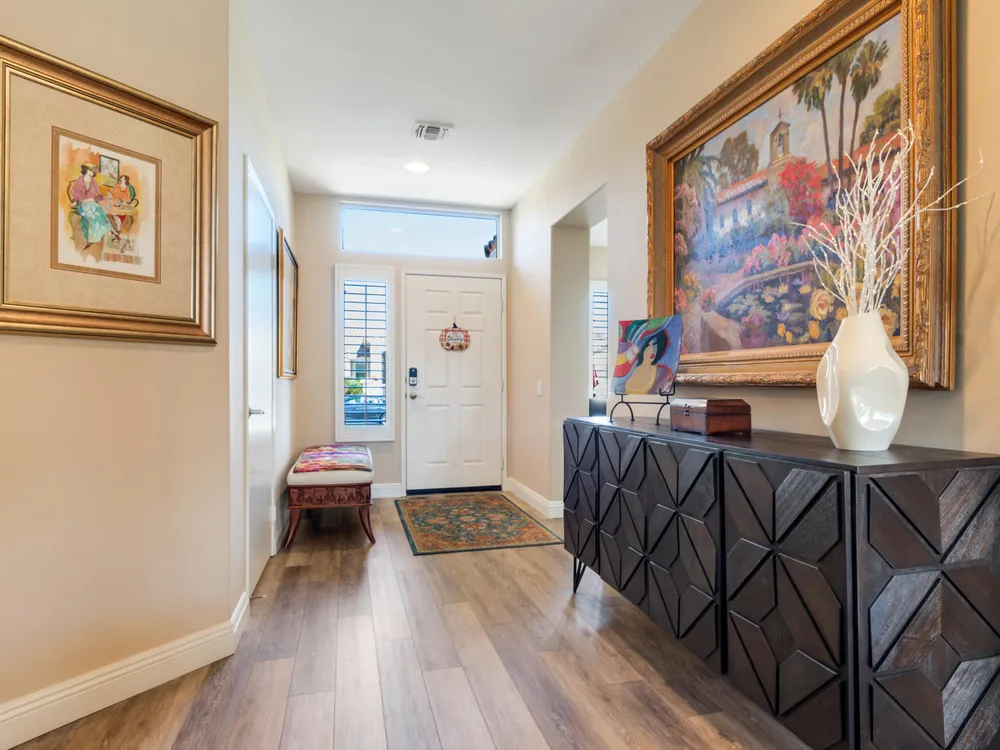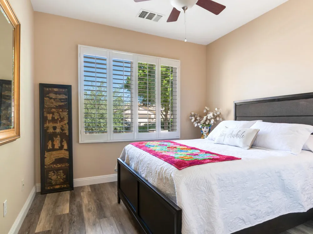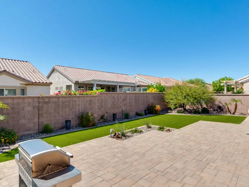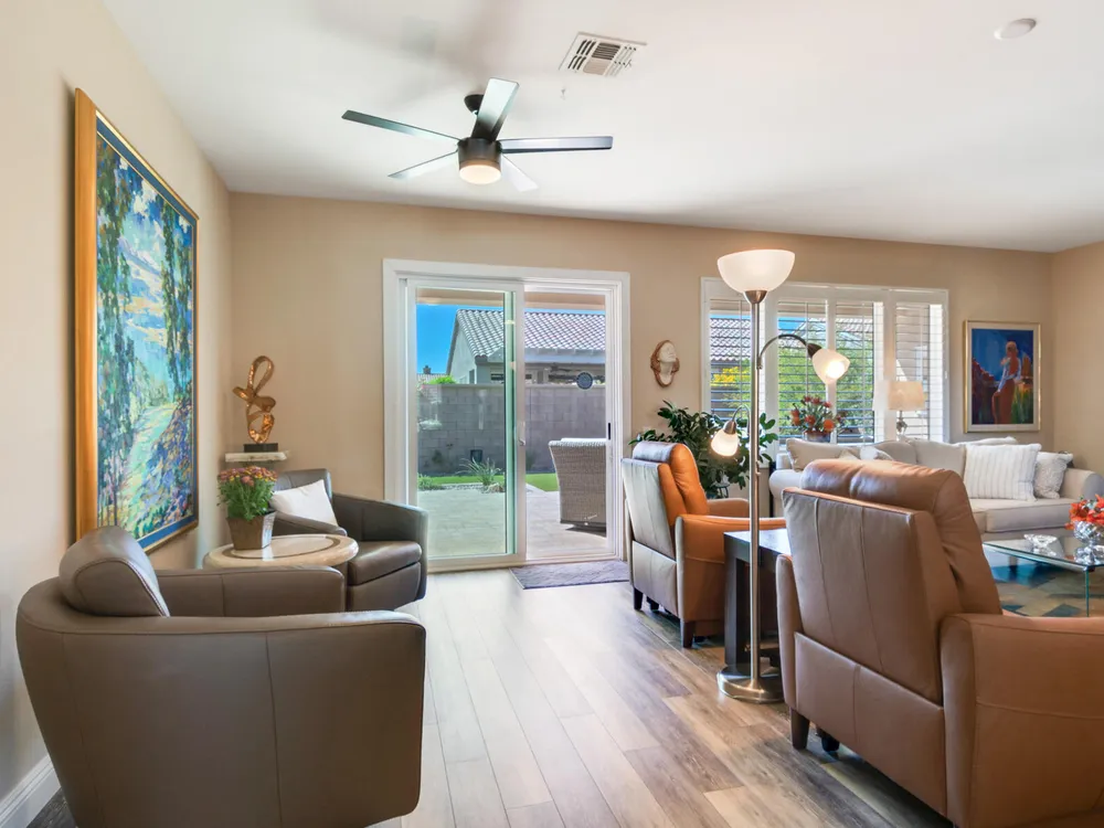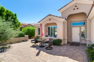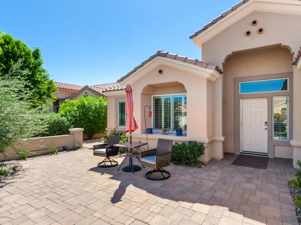 Welcome to Sun City Palm Desert, THE premier 55+ community in the Coachella Valley. The Montego is one of the most popular models with 3 bedrooms and 2 bathrooms. This beautiful home features a large north-facing enclosed courtyard with brick pavers, a refreshed kitchen, beautiful luxury vinyl floors throughout, new baseboards, new interior paint and plantation shutters. The primary suite is extended with a sitting area and the primary bathroom has dual vanities and a custom closet system. The guest bedrooms and bath are on the opposite side of the home allowing comfort and privacy. The open-concept floor plan has a spacious kitchen with a cozy breakfast kitchenette. It opens to the dining room and living room with a new slider out to the spacious private south-west facing private backyard with an extended patio of pavers, grass turf and portico. The indoor laundry includes the washer/dryer, wine refrigerator and upper cabinets. The HVAC system and water heater were replaced in 2020. This is a beautiful move-in ready home!