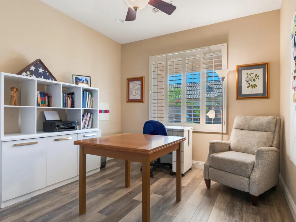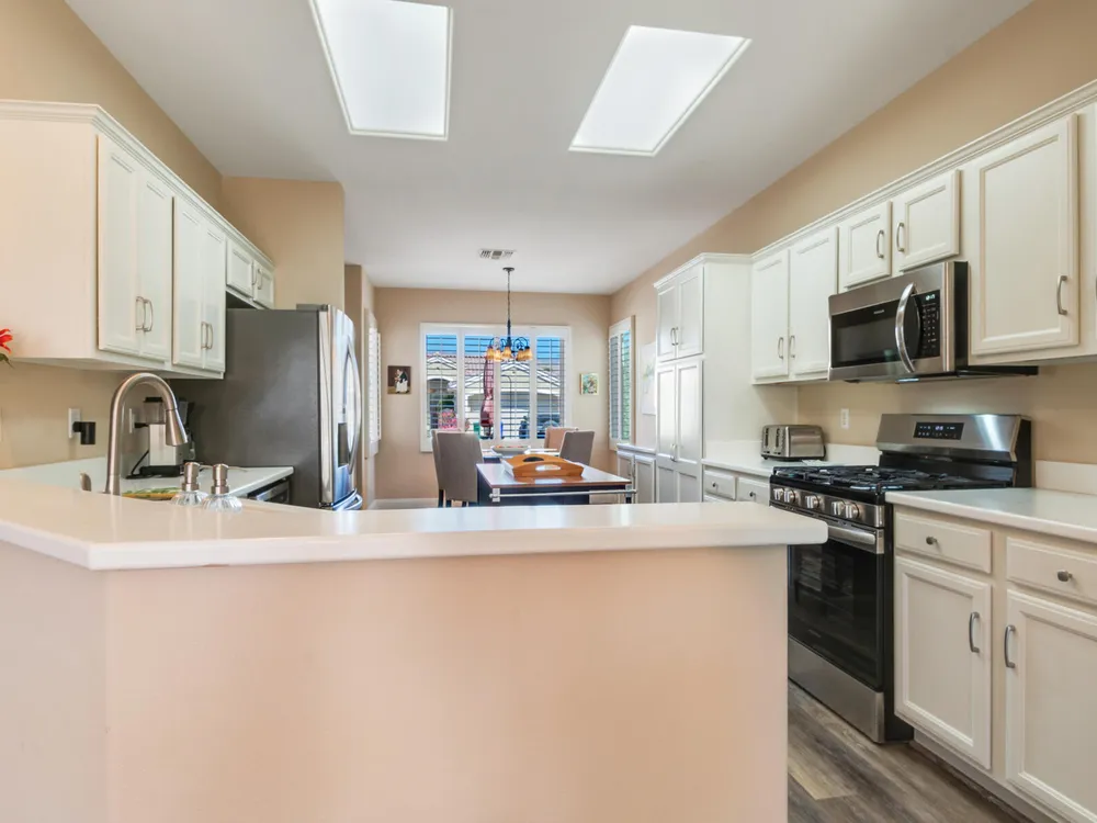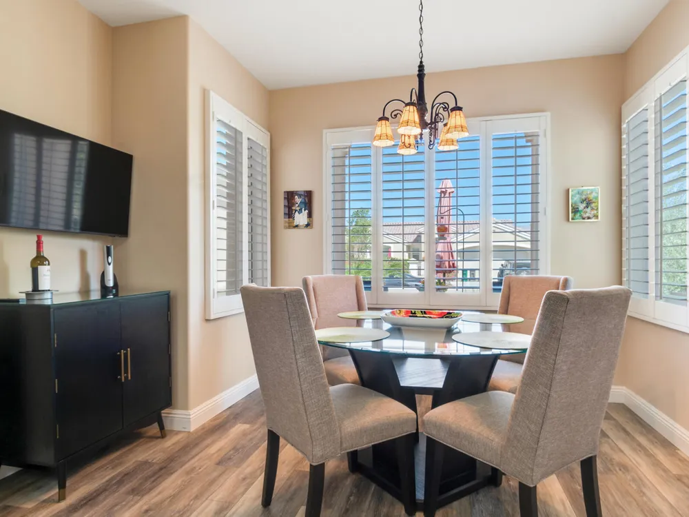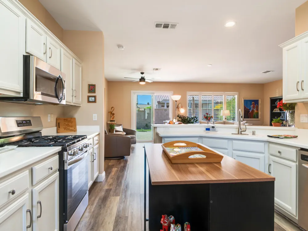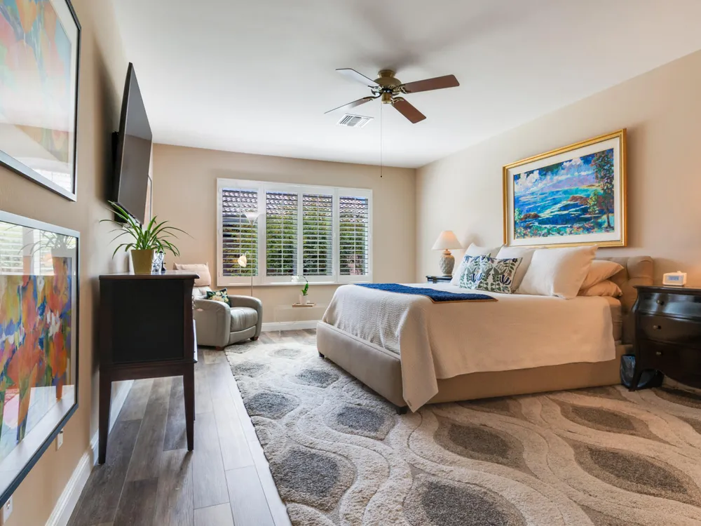 Welcome to Sun City Palm Desert, THE premier 55+ community in the Coachella Valley. The Montego is one of the most popular models with 3 bedrooms and 2 bathrooms. This beautiful home features a large north-facing enclosed courtyard with brick pavers, a refreshed kitchen, beautiful luxury vinyl floors throughout, new baseboards, new interior paint and plantation shutters. The primary suite is extended with a sitting area and the primary bathroom has dual vanities and a custom closet system. The guest bedrooms and bath are on the opposite side of the home allowing comfort and privacy. The open-concept floor plan has a spacious kitchen with a cozy breakfast kitchenette. It opens to the dining room and living room with a new slider out to the spacious private south-west facing private backyard with an extended patio of pavers, grass turf and portico. The indoor laundry includes the washer/dryer, wine refrigerator and upper cabinets. The HVAC system and water heater were replaced in 2020. This is a beautiful move-in ready home!