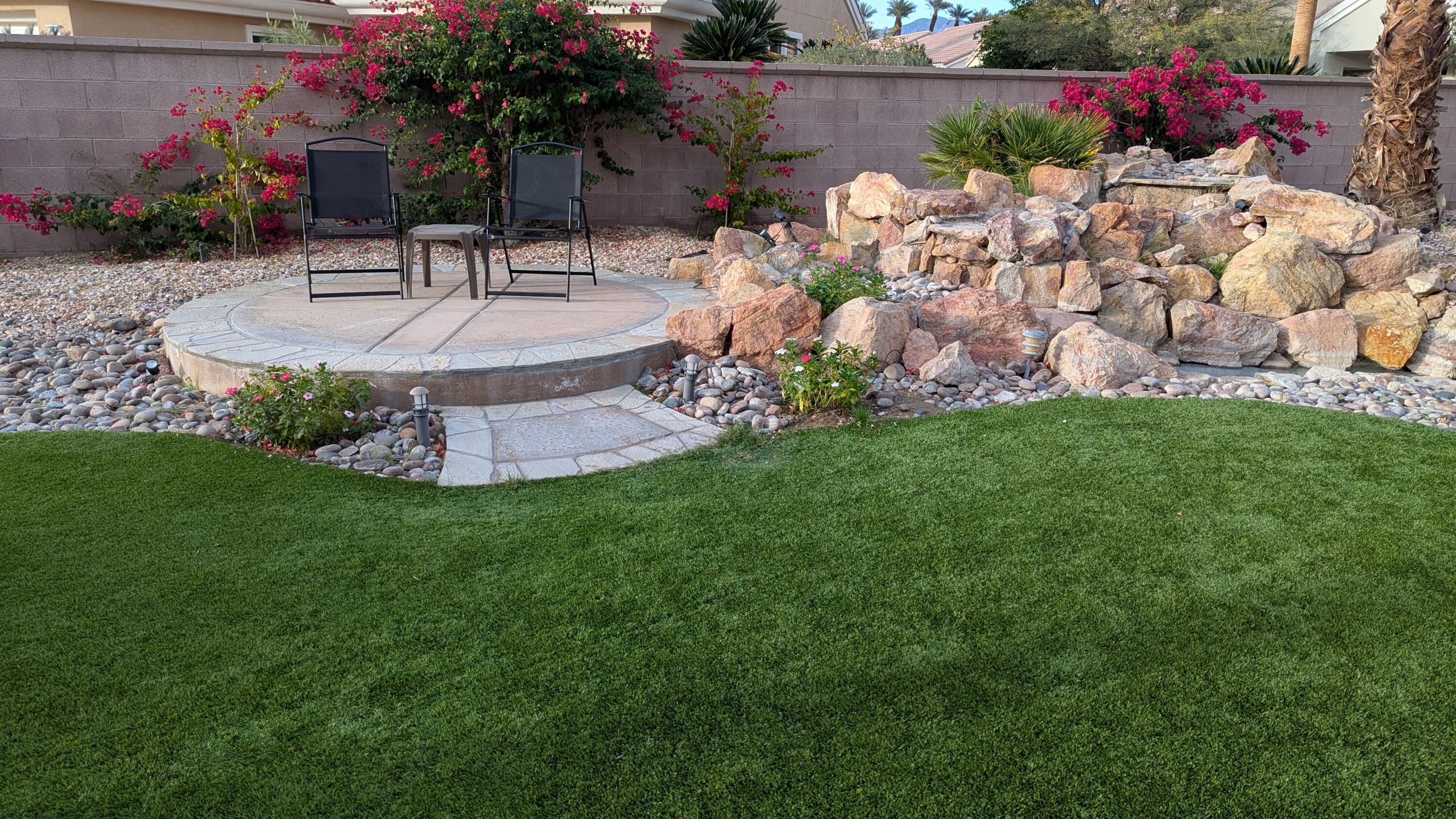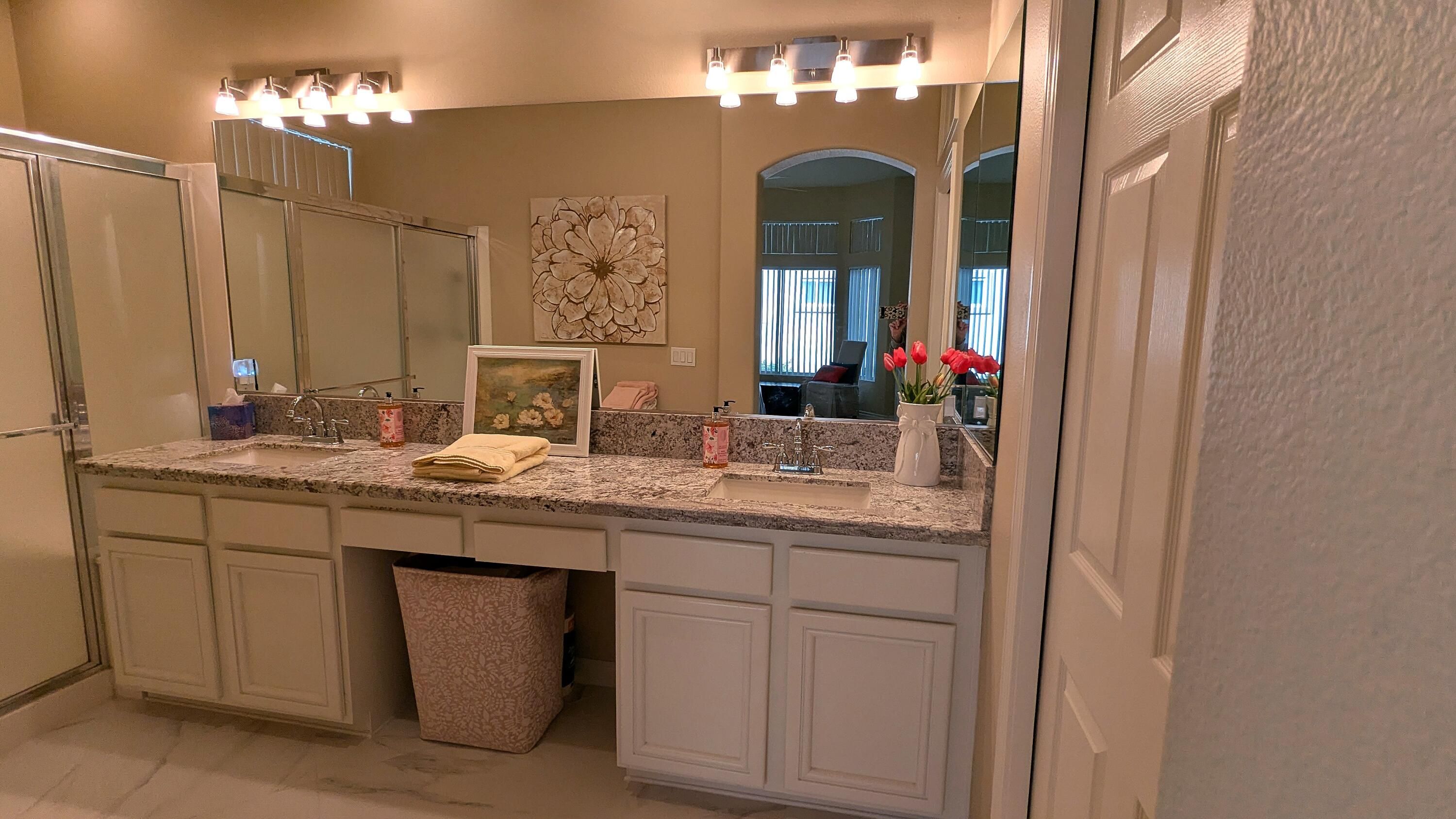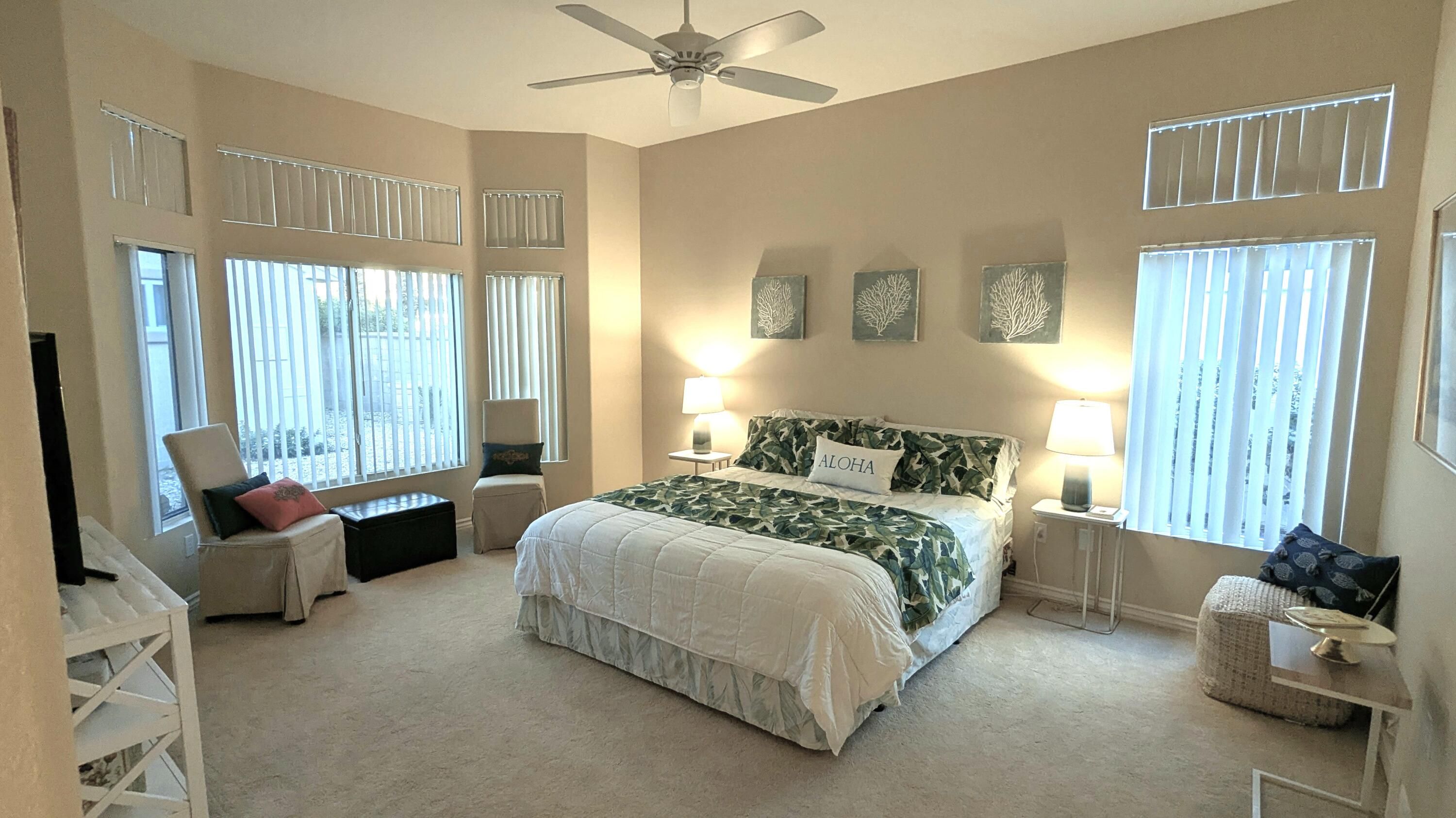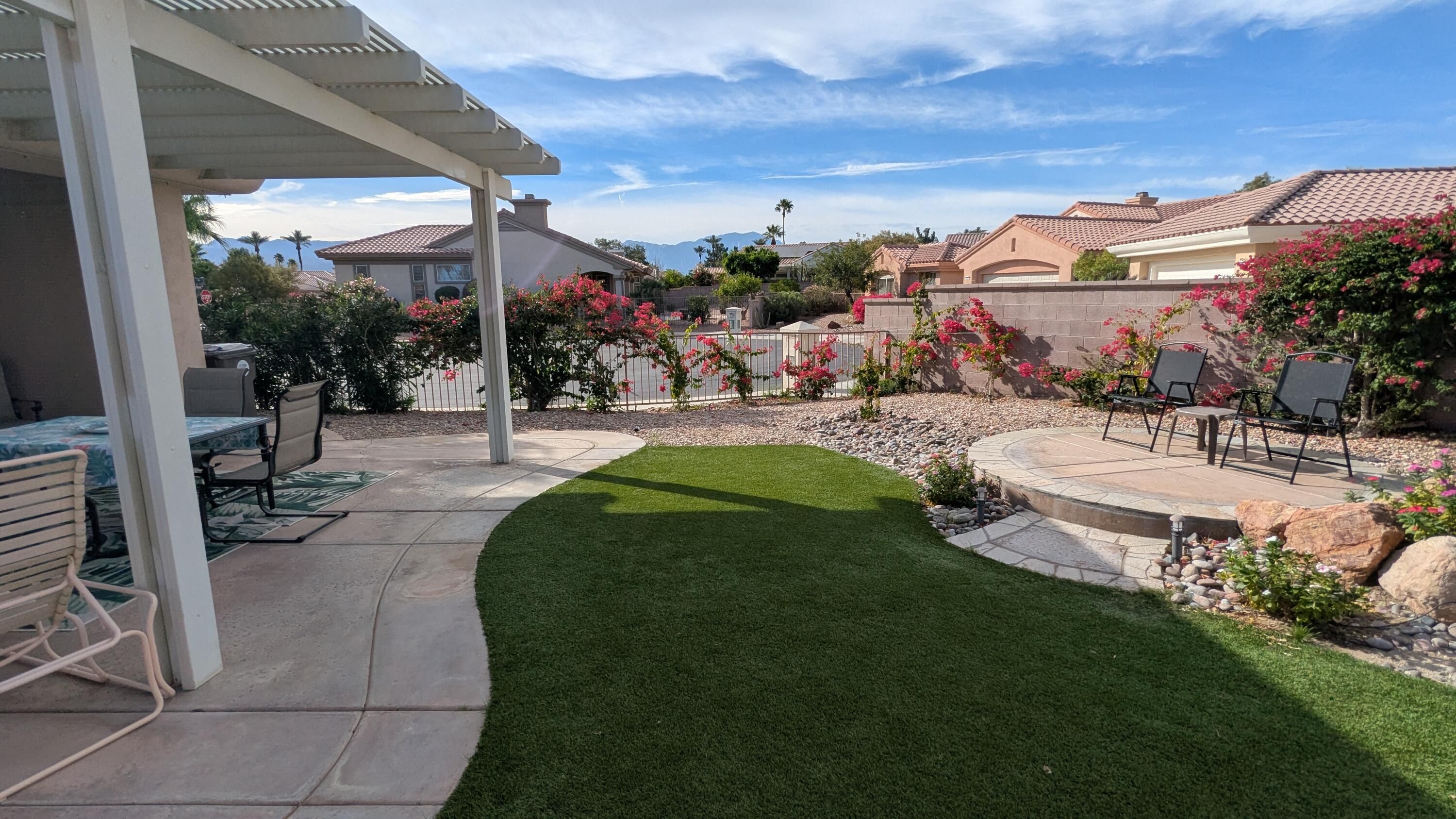 WELCOME HOME. Come Enjoy the best of everything @ Del Webb Sun City in Palm Desert, an award-winning 55+ community noted for it's top notched tennis courts, golf courses plus 3 clubhouses, sporting lots of fun and recreational clubs of interest. This Remodeled 3 bedroom, 3 bath property is a stand alone house which has a separate detached large Casita with it's own entrance that can be used as a Studio, a Recreation Room or a Guest House. The Primary house and the Casita have been fully remodeled and updated with New updated electrical Led lighting, chandeliers and new ceiling fans throughout. New faux marble- Tile adorns the entry and the kitchen and bathrooms. New plush carpet are in living room and bedrooms. Each room has custom window treatments. All Walls and Ceilings have new SW decor paint. Bathrooms are updated with all new toilets. Looks, and Feels like a new model home. This home and property is like 'none' other in Sun City. It has an extra Large front yard, side yard, back yard with private front patio and private back patio. All fenced in with side iron gate in the backyard and stucco wall privacy fence in the front yard patio. Many bougainvilleas and flowers adorn the front yard and in the very spacious back yard. Colorful Backyard has a large Rock Waterfall feature adding charm and beauty to the looks of the property. This large lot size has a gem quality since the house is built on the corner of a Cul de Sac so no houses are on the side of house making living in this home very private and quiet. Really a gem of a property! Doves can be seen and heard enjoying the waterfall feature. Many tall Palm trees surround the home. Having Golf cart space in the oversized 2 car garage is a real plus. This property's street is liked for it's wide scenic road and with less cars than other roads in the community. All over in Sun City there are walking sidewalks for those who like to walk to greenbelt parks. This gem of a property amazes onlookers on how special and private it is to have a huge fenced in backyard with a pretty space to enjoy and entertain in. There is even a small stage perfect for star gazing. The desert sky looks amazing from the backyard with a wider view landscape. Beautiful property. Well maintained.