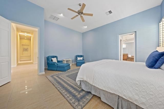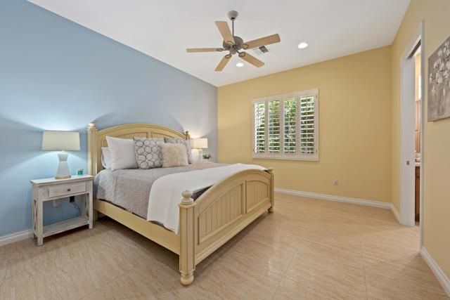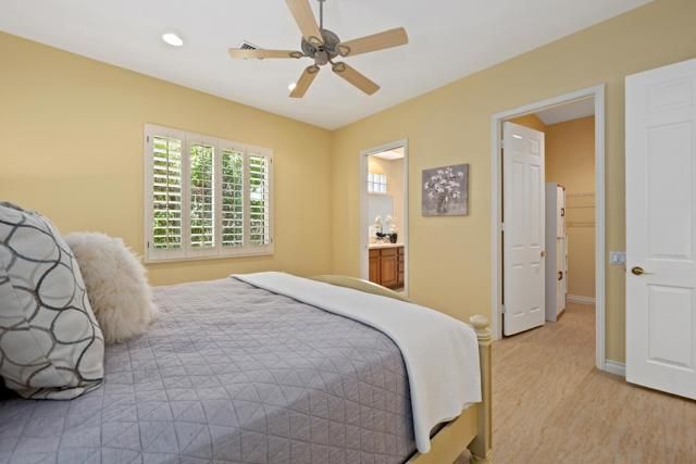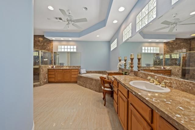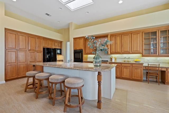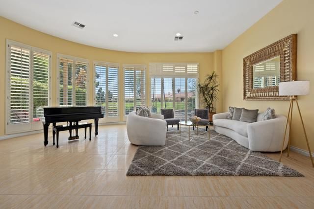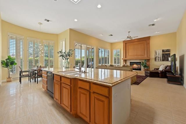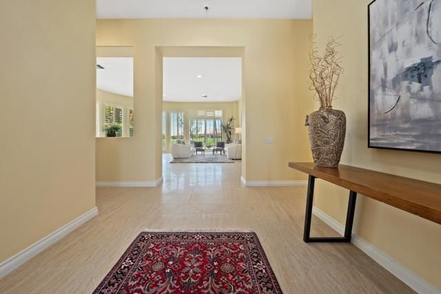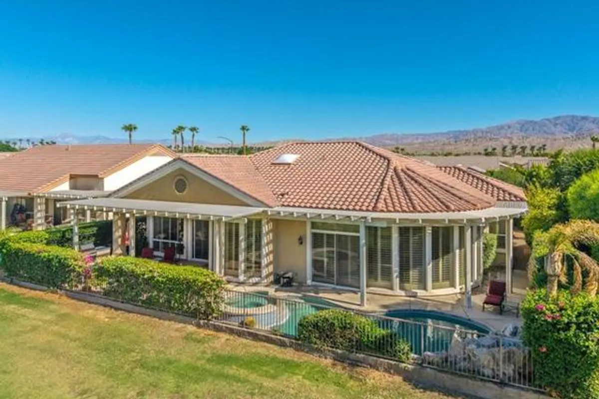 Sun City Palm Desert - Provence. This exceptional residence is perched above the 16th tee of the San Gorgonio Course, offering sweeping views of the fairway lake and surrounding mountains. The south-facing backyard is an entertainer's dream, featuring a pebbletec pool and spa with cascading spillover, built-in BBQ, and an expansive salt-finished patio. A gated front courtyard and leaded-glass French doors add to the home's inviting curb appeal. Inside, you'll find three spacious bedroom suites plus a powder room, all finished with 24' tile floors and plantation shutters. The dramatic great room is the home's centerpiece, boasting 12-foot ceilings and a semi-circle of 10-foot windows framing the stunning pool and golf course views. 12-foot ceilings extend into the kitchen, family room, and primary suite for an airy, open feel. The gourmet kitchen showcases 36' raised-panel cabinetry with glass inserts and pull-out shelving, slab granite countertops with bullnose edging, double wall ovens, a chef's island with breakfast bar, and dual skylights. The adjoining family room features a gas log fireplace with custom wood mantel. The luxurious primary suite offers a massive walk-in closet with built-ins and a spa-inspired bath complete with marble surfaces, dual sinks, a seated vanity, oversized jetted tub, and dual-head shower. On the opposite side of the home are 2 guest suites that provide comfortable accommodation for your company. The extended 2+ golf cart garage has built-in storage. Additional highlights include dual-zone AC (new in 2013).