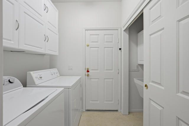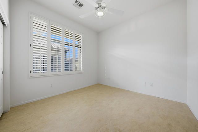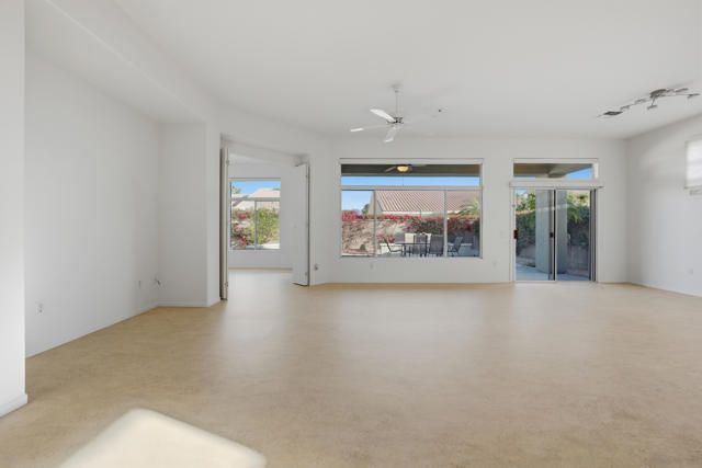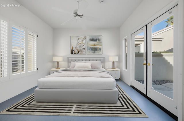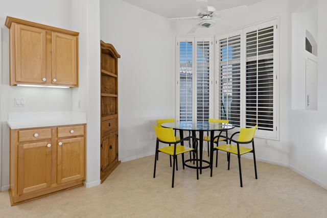 Sun City Palm Desert - Morocco with Casita. Ideally located in the heart of Sun City on a quiet street just a short distance from the Sunset View Clubhouse, this popular great room home offers comfort, privacy, and versatility. The north-facing rear yard features peekaboo mountain views, an extended patio, and lush desert landscaping with citrus--perfect for relaxing or entertaining. An updated exterior paint scheme and gated front courtyard with patio create inviting curb appeal. Inside, 10-foot ceilings and transom windows fill the home with natural light. Upgraded plank flooring and ceiling fans run throughout, and shutters cover all windows except the great room view windows. The spacious kitchen is appointed with Corian countertops, light maple cabinetry with pull-out shelves, recessed and under-cabinet lighting, and ample storage. Folding doors off the great room open to a flexible den or office. The primary suite features double-door entry, a bay window, an enlarged walk-in closet, and an en-suite bath with dual sinks and a stall shower with textured glass enclosure. The guest bath includes a tub/shower combination. French doors from the courtyard lead to the detached casita, providing a private guest bedroom with its own en-suite bath. Additional highlights include a laundry room with utility sink and built-in storage, a two-car garage with extensive built-ins, a golf cart parking nook, and man doors to both the courtyard and side yard. The main A/C was replaced in 2016.
