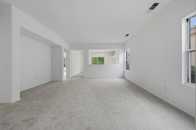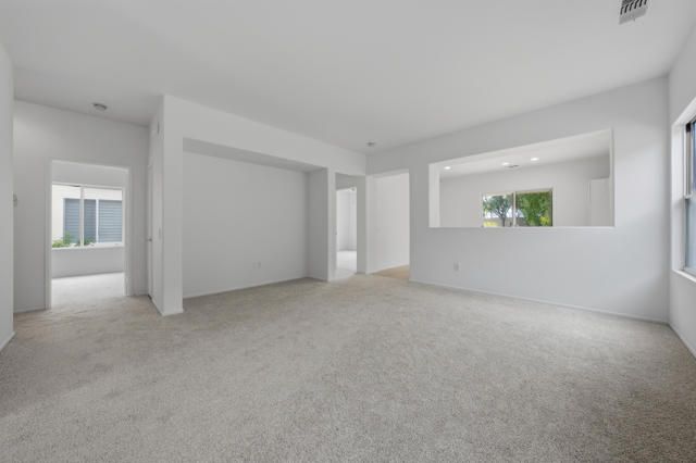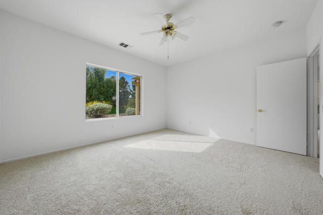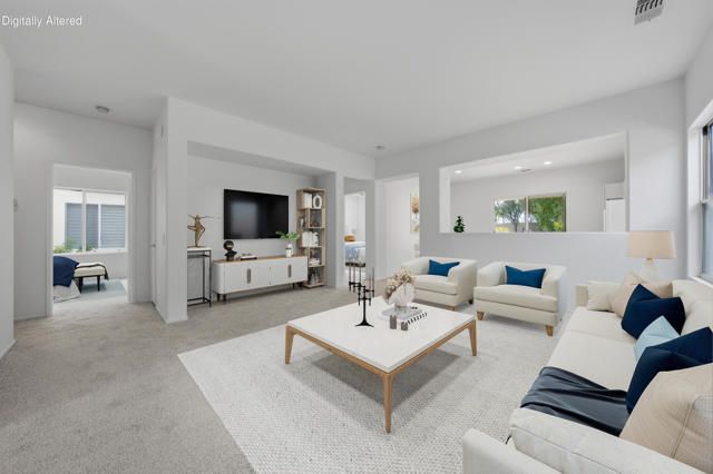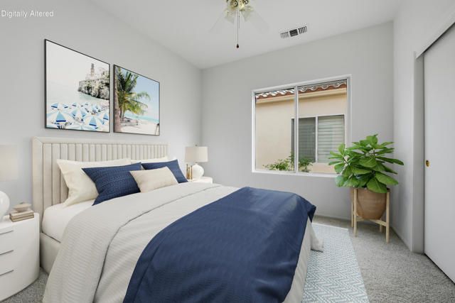 Sun City Palm Desert - Pasadena. Ideally situated within the community, this greatroom home offers comfort, convenience, and a desirable south-facing rear yard overlooking a secluded greenbelt. The extended patio with alumawood cover creates the perfect space for outdoor living, surrounded by low-maintenance desert landscaping and open views.Inside, tile flooring flows through most of the home, with carpet in the greatroom and bedrooms for added comfort. The eat-in kitchen features abundant cabinetry, generous counter space, and a bright breakfast nook.The primary suite includes a walk-in closet and an ensuite bath with a stall shower. The guest bedroom is spacious and inviting, complemented by a nearby guest bath with a tub/shower combination.Additional highlights include a roomy two-car garage with ample storage and a new A/C system installed in 2023. Conveniently located near the neighborhood pool and golf cart gate access to nearby shopping, this home offers an easy, relaxed desert lifestyle in the heart of Sun City.