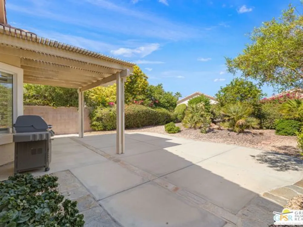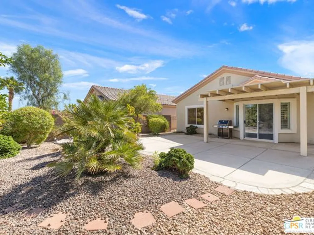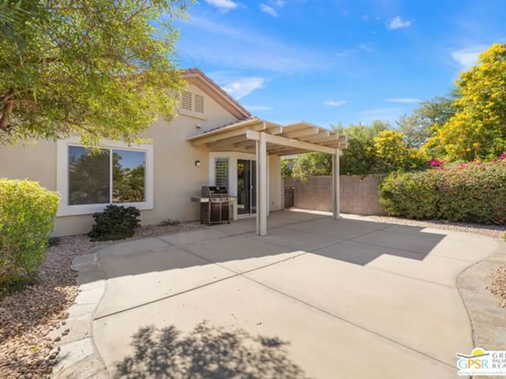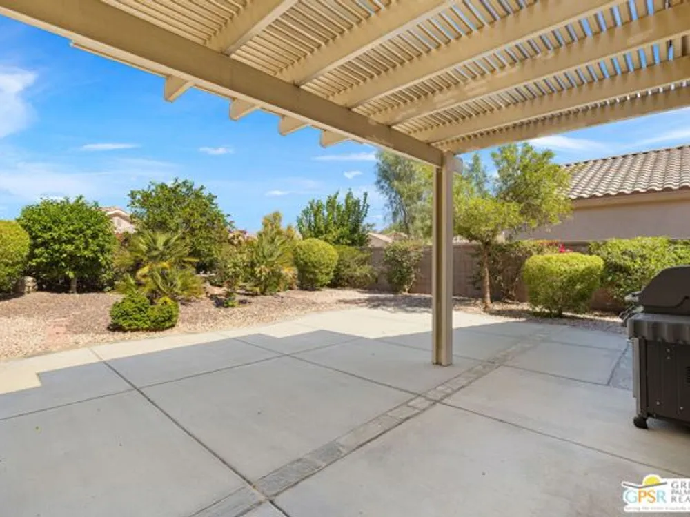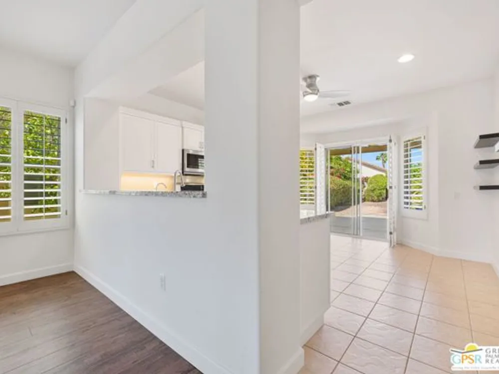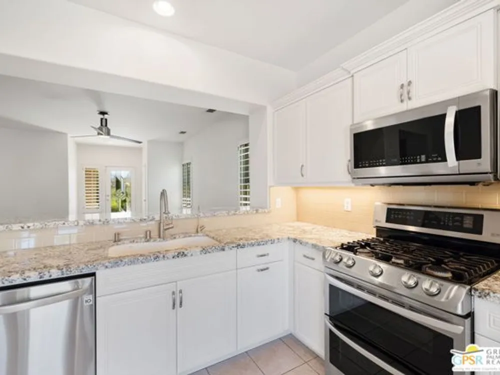 The desert good life at Sun City Palm Desert! This sought-after Pasadena model offers 2 bedrooms and 2 baths in a bright, open-concept layout designed for easy living. Attractive curb appeal, low-maintenance landscaping, and a prime location near the owners-only gate with easy access to Starbucks and grocery shopping to make everyday life a breeze. Ask about the nearby "secret" golf cart gate! Recent updates include fresh interior paint and slab granite countertops in the kitchen + baths. The kitchen features a reverse-osmosis water filter, stainless steel appliances, and a charming breakfast nook framed by a bay window and slider to the patio. Solid vinyl plank flooring flows through the main areas and bedrooms, complemented by plantation shutters and a custom glass front door. The Primary Suite offers a custom-fitted closet with upgraded cabinetry including built-ins, drawers and shelving. The Guest Bedroom, located across from the second bath, includes a convenient Murphy bed. The finished 2-car garage features epoxy flooring, cabinetry, utility sink, and shelving for extra storage. Exterior highlights include a Restora overlay on the walkway and driveway. Enjoy a north-facing backyard with desert-wise landscaping, established citrus trees, an Alumawood patio cover, and an ext