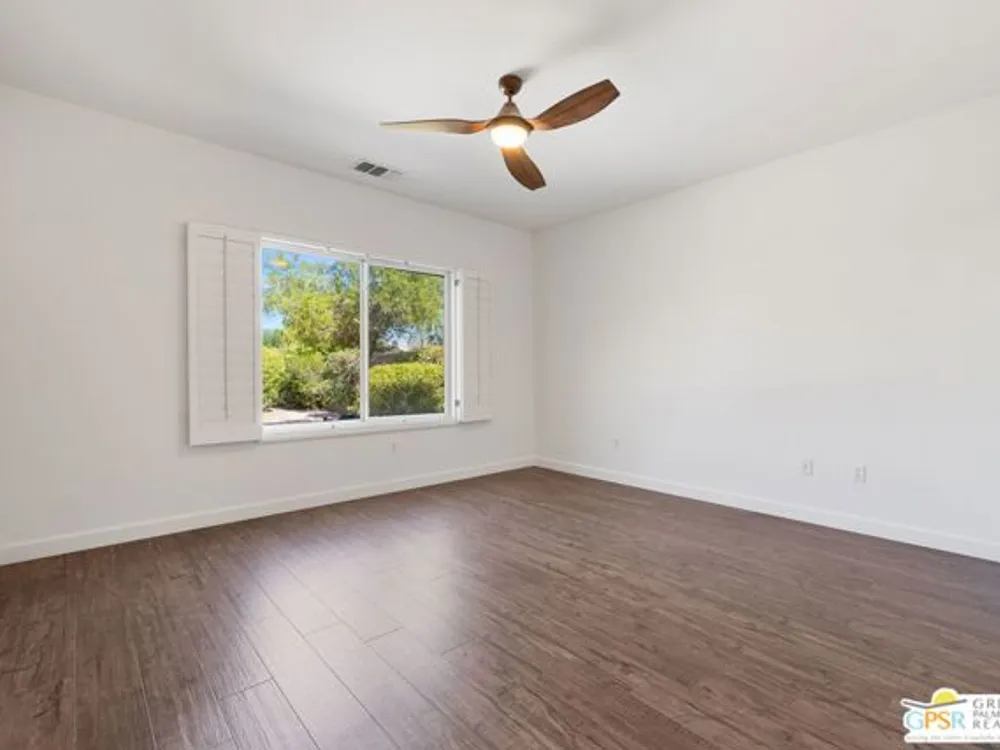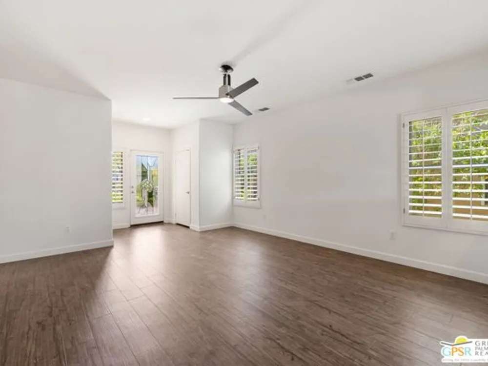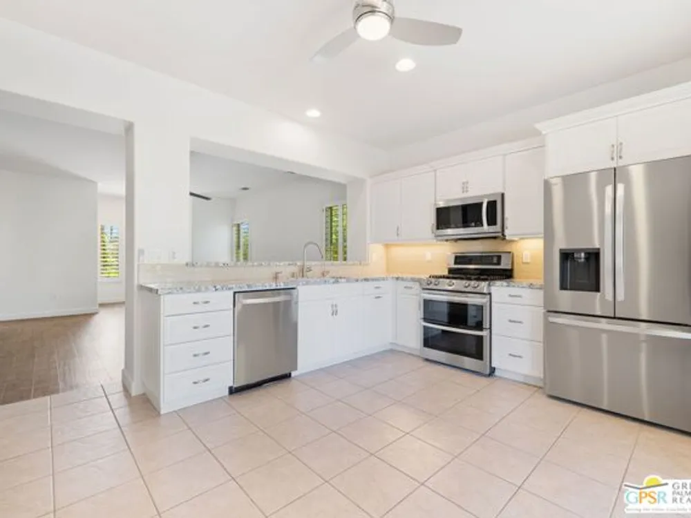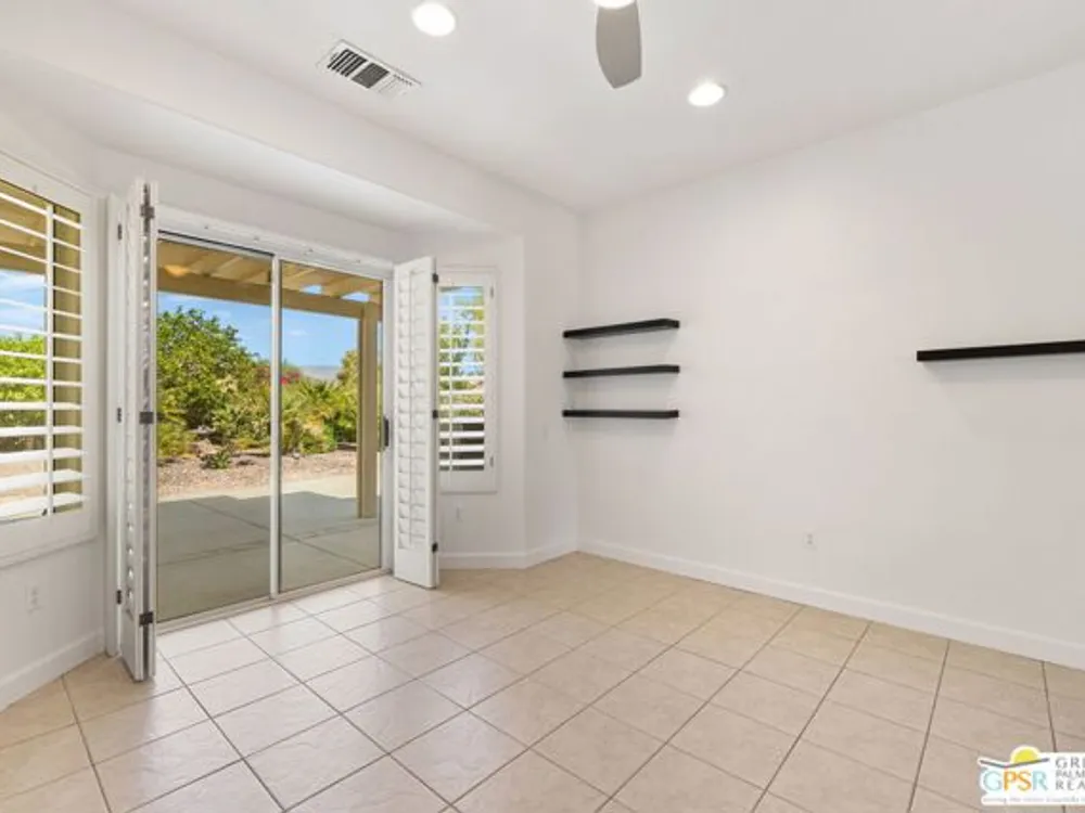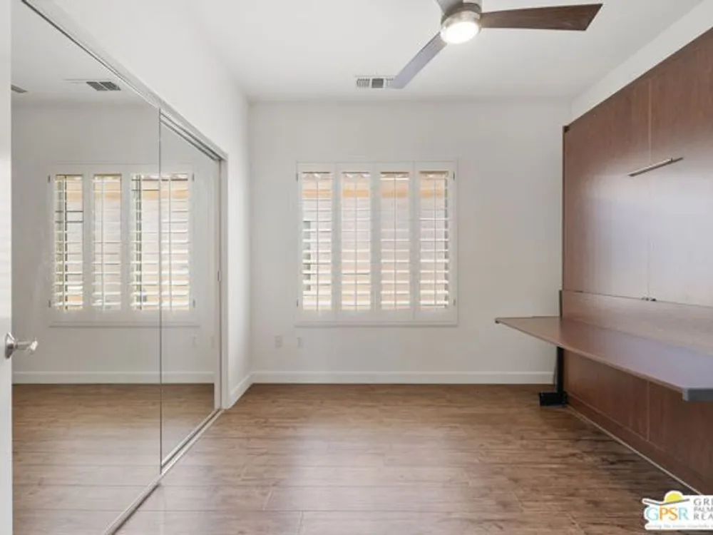 The desert good life at Sun City Palm Desert! This sought-after Pasadena model offers 2 bedrooms and 2 baths in a bright, open-concept layout designed for easy living. Attractive curb appeal, low-maintenance landscaping, and a prime location near the owners-only gate with easy access to Starbucks and grocery shopping to make everyday life a breeze. Ask about the nearby "secret" golf cart gate! Recent updates include fresh interior paint and slab granite countertops in the kitchen + baths. The kitchen features a reverse-osmosis water filter, stainless steel appliances, and a charming breakfast nook framed by a bay window and slider to the patio. Solid vinyl plank flooring flows through the main areas and bedrooms, complemented by plantation shutters and a custom glass front door. The Primary Suite offers a custom-fitted closet with upgraded cabinetry including built-ins, drawers and shelving. The Guest Bedroom, located across from the second bath, includes a convenient Murphy bed. The finished 2-car garage features epoxy flooring, cabinetry, utility sink, and shelving for extra storage. Exterior highlights include a Restora overlay on the walkway and driveway. Enjoy a north-facing backyard with desert-wise landscaping, established citrus trees, an Alumawood patio cover, and an ext