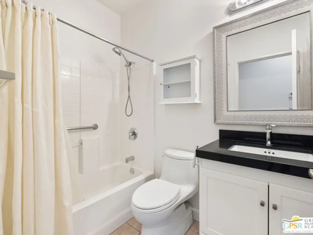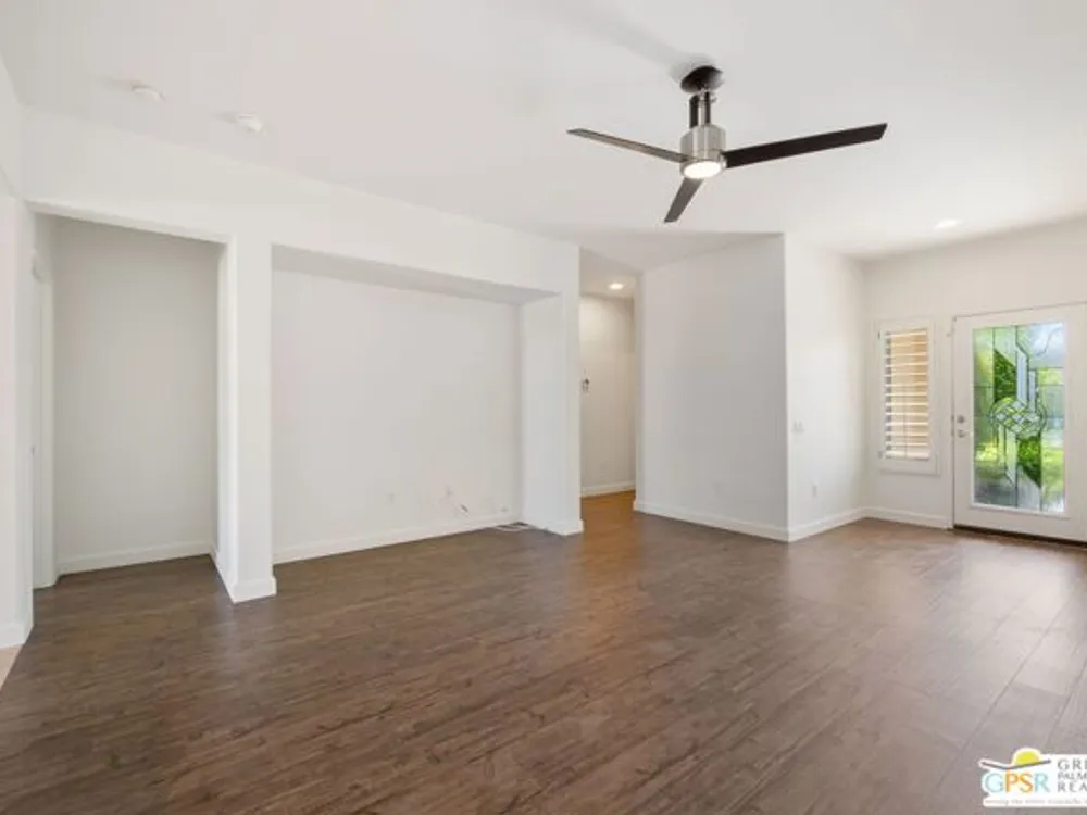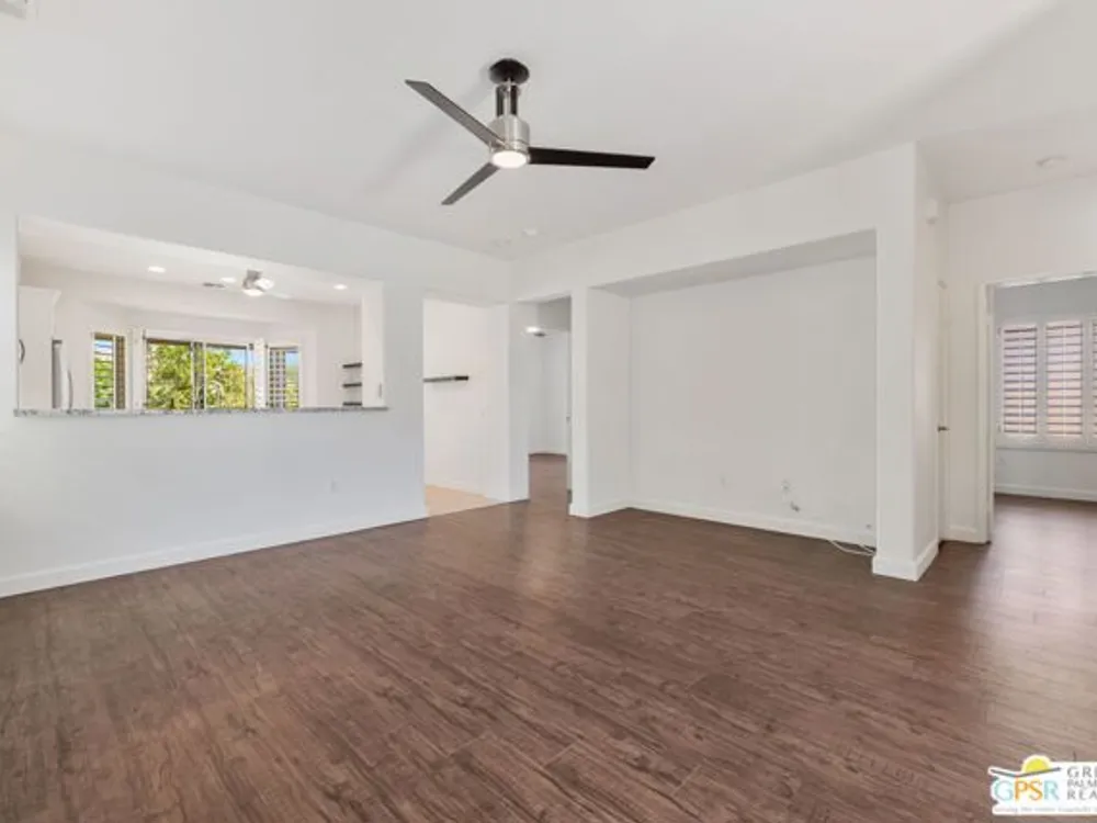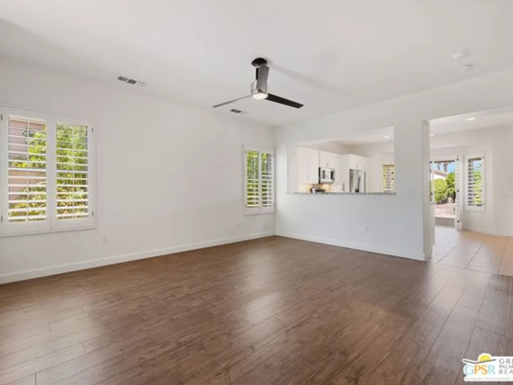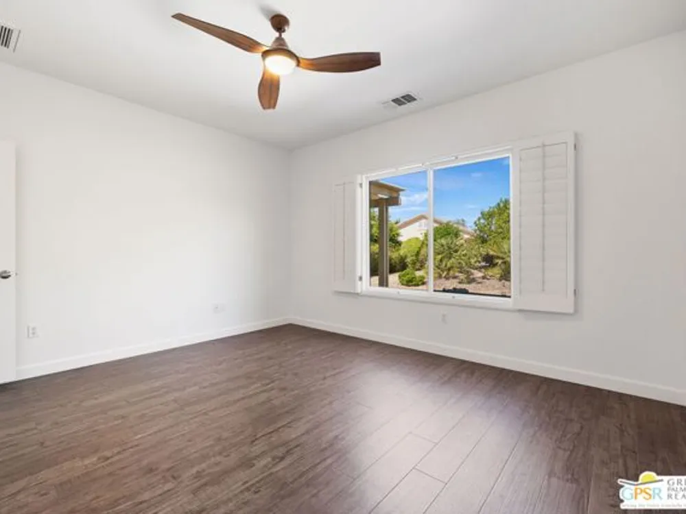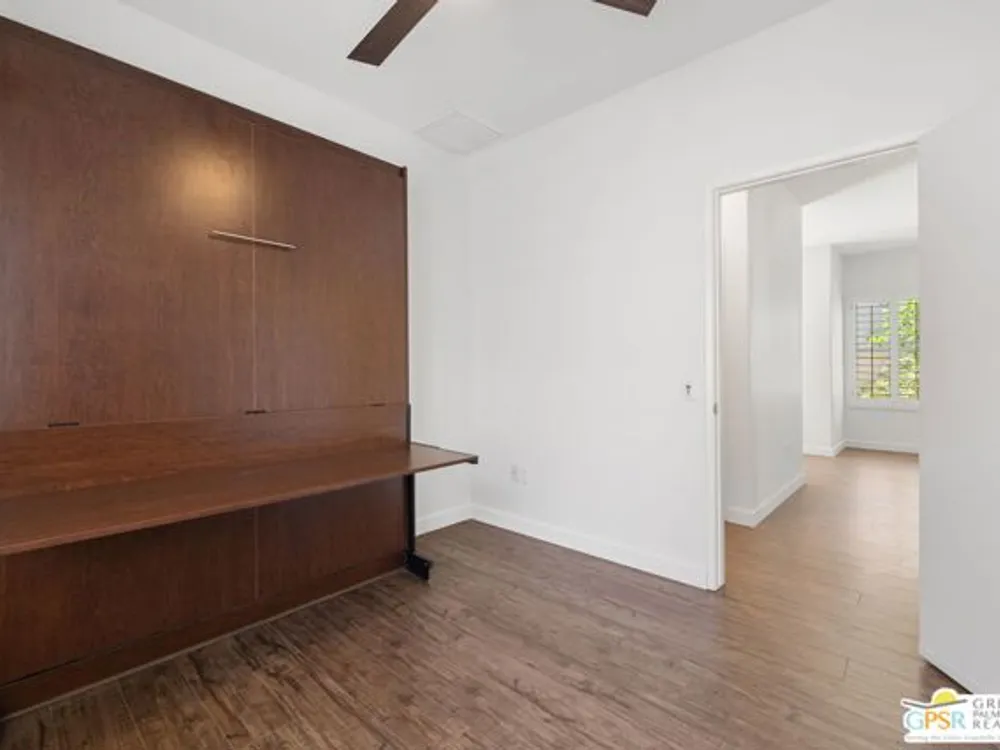 The desert good life at Sun City Palm Desert! This sought-after Pasadena model offers 2 bedrooms and 2 baths in a bright, open-concept layout designed for easy living. Attractive curb appeal, low-maintenance landscaping, and a prime location near the owners-only gate with easy access to Starbucks and grocery shopping to make everyday life a breeze. Ask about the nearby "secret" golf cart gate! Recent updates include fresh interior paint and slab granite countertops in the kitchen + baths. The kitchen features a reverse-osmosis water filter, stainless steel appliances, and a charming breakfast nook framed by a bay window and slider to the patio. Solid vinyl plank flooring flows through the main areas and bedrooms, complemented by plantation shutters and a custom glass front door. The Primary Suite offers a custom-fitted closet with upgraded cabinetry including built-ins, drawers and shelving. The Guest Bedroom, located across from the second bath, includes a convenient Murphy bed. The finished 2-car garage features epoxy flooring, cabinetry, utility sink, and shelving for extra storage. Exterior highlights include a Restora overlay on the walkway and driveway. Enjoy a north-facing backyard with desert-wise landscaping, established citrus trees, an Alumawood patio cover, and an ext